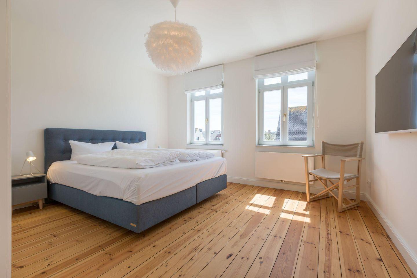 Das Ferienhaus bietet drei komfortable Schlafzimmer, alle mit Boxspring-Doppelbetten (180x200 cm) und TV ausgestattet. Das Hauptschlafzimmer im Süden verfügt zusätzlich über ein kleines Kinderzimmer mit einem Einzelbett (90x200 cm) und einem Ausziehbett. Die Schlafzimmer bieten eine ruhige und entspannende Atmosphäre für erholsame Nächte.