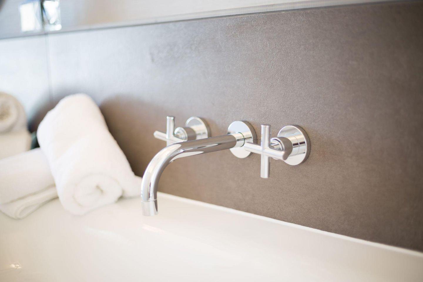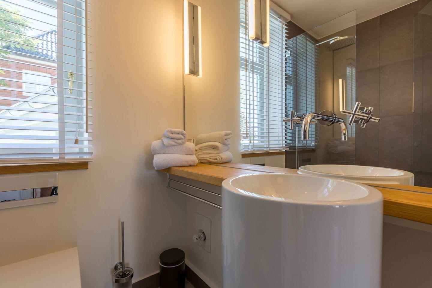 Das Haus verfügt über zwei stilvolle Badezimmer. Das erste Badezimmer bietet eine Dusche, WC, Tageslicht und einen Föhn. Das zweite, größere Badezimmer ist ein luxuriöses Dusch- und Vollbad mit freistehender Designer-Badewanne, Dusche, zwei Designer-Waschtischen, Tageslicht, einem Handtuchwärmer und einem Föhn. Für zusätzliche Entspannung steht ein separates Saunahaus im Garten zur Verfügung, das mit einer Dusche und einem WC ausgestattet ist.