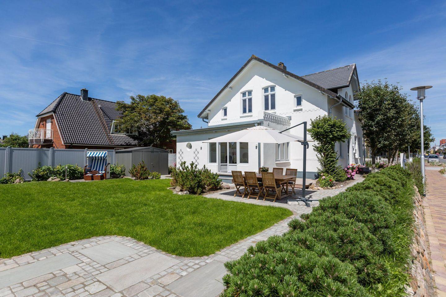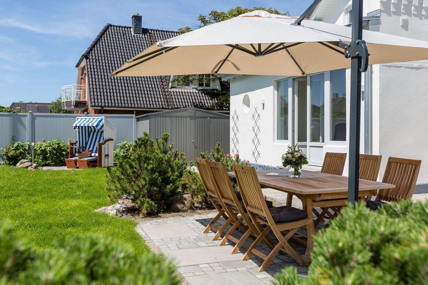 Der neu gestaltete, eingewachsene Garten lädt zum Entspannen ein. Auf der Terrasse können Sie die Sonne genießen oder gemütliche Grillabende verbringen. Das separate Saunahaus bietet Ihnen Wellness pur nach einem Tag am Strand oder auf der Insel.