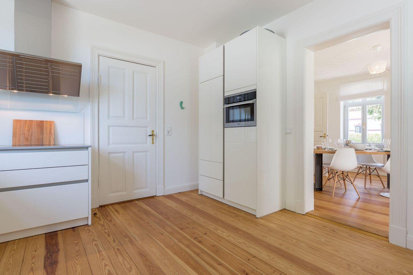 Die offene Küche ist nach Südwesten ausgerichtet und mit modernen Geräten wie einem Mikrowellenbackofen, einem Induktionskochfeld und einem Geschirrspüler ausgestattet. Ein Durchgang führt zur Waschküche mit einem Waschtrockner. Vom Esszimmer mit Platz für bis zu 8 Personen haben Sie direkten Zugang zum lichtdurchfluteten Wintergarten und dem gepflegten Garten, der nach Südwesten ausgerichtet ist.