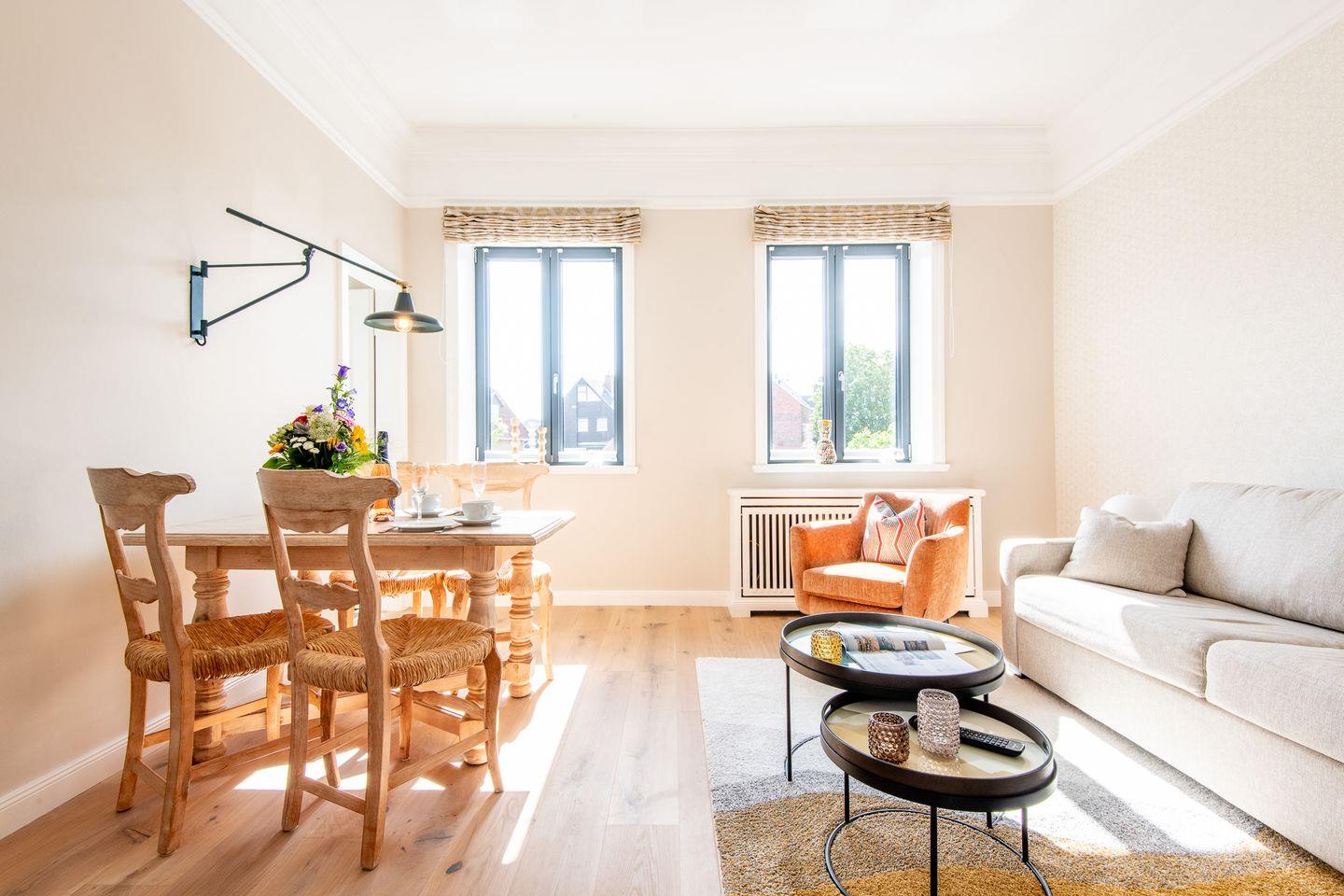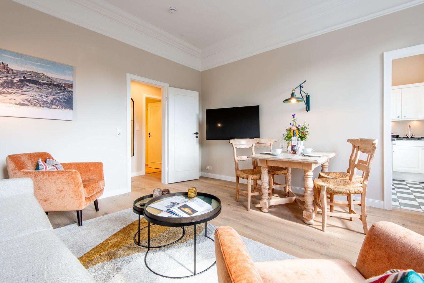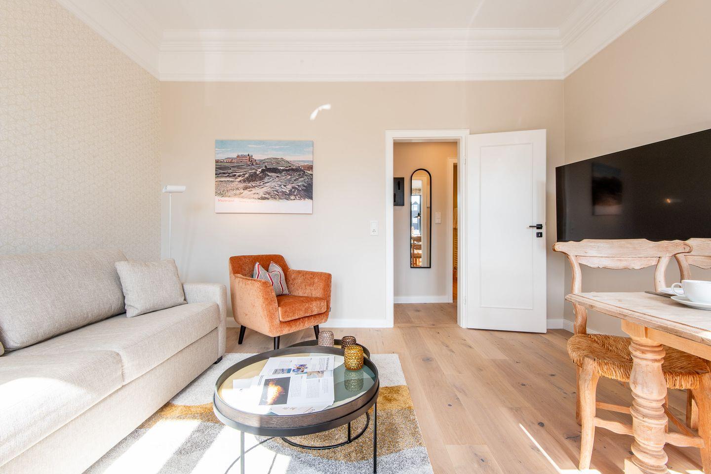 Das Wohnzimmer lädt mit einem gemütlichen Schlafsofa und einer kleinen Essecke zum Entspannen ein. Hier können Sie sich nach einem Tag am Strand zurücklehnen oder gesellige Abende verbringen.