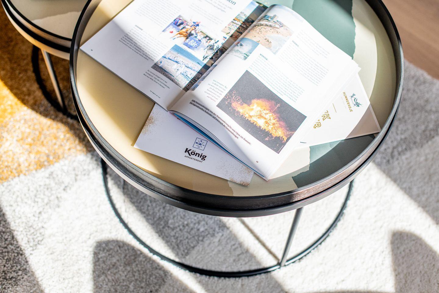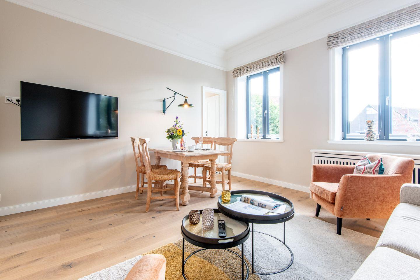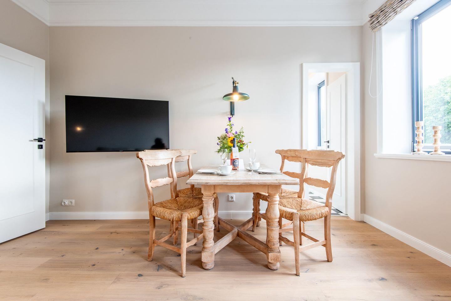 Das Wohnzimmer lädt mit einem gemütlichen Schlafsofa und einer kleinen Essecke zum Entspannen ein. Hier können Sie sich nach einem Tag am Strand zurücklehnen oder gesellige Abende verbringen.