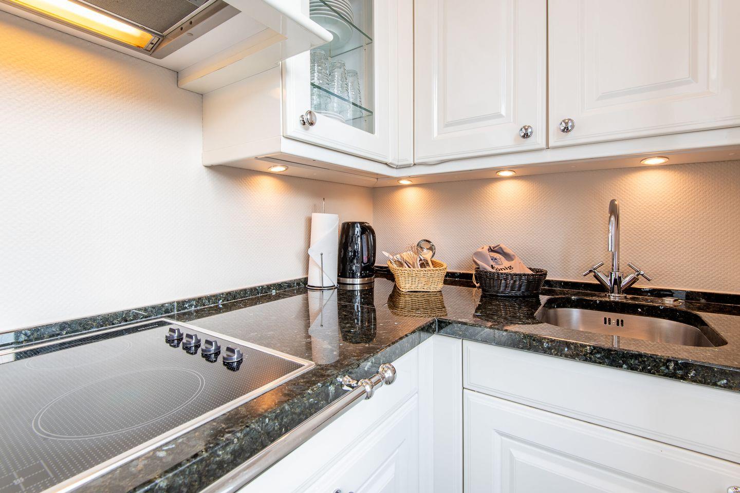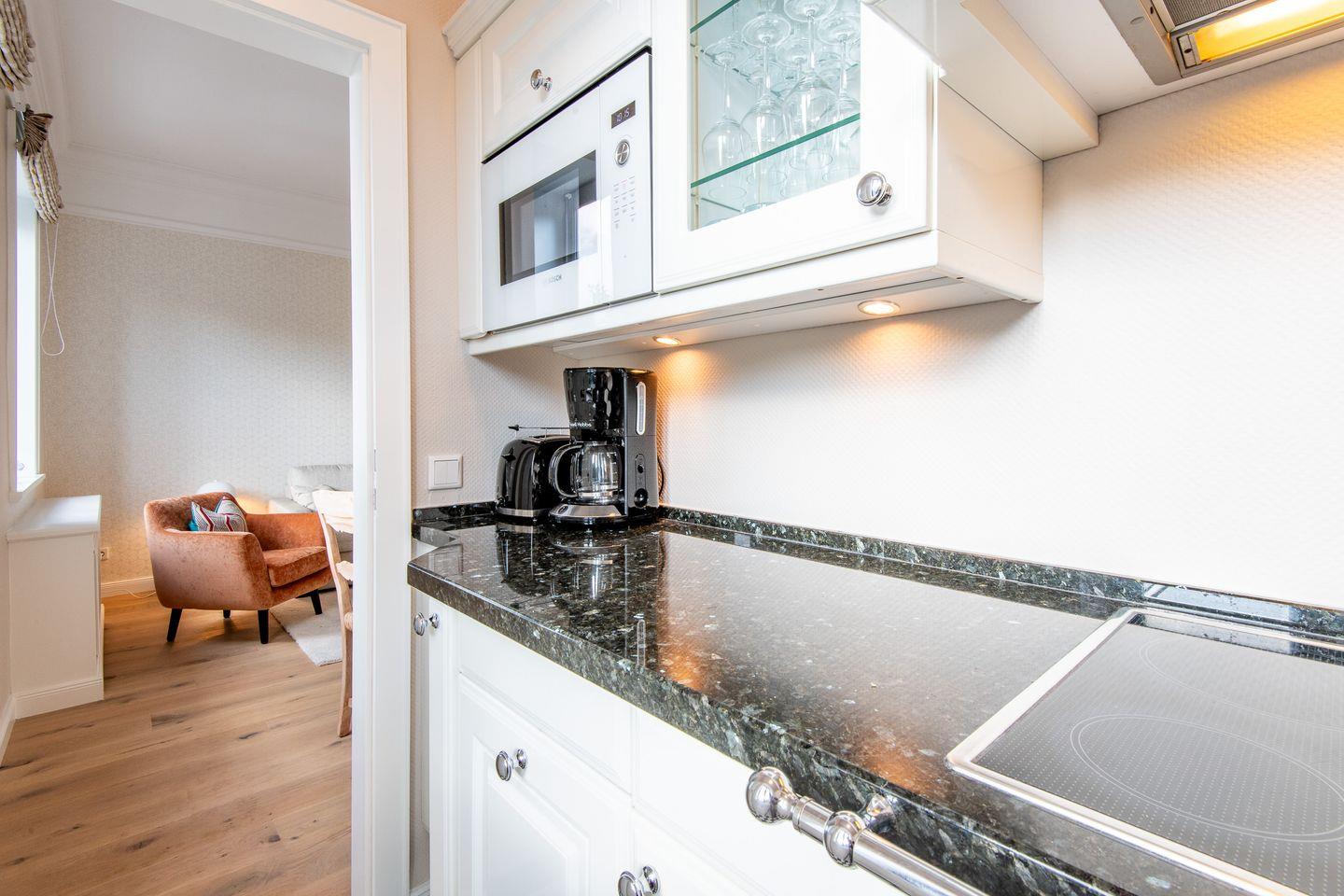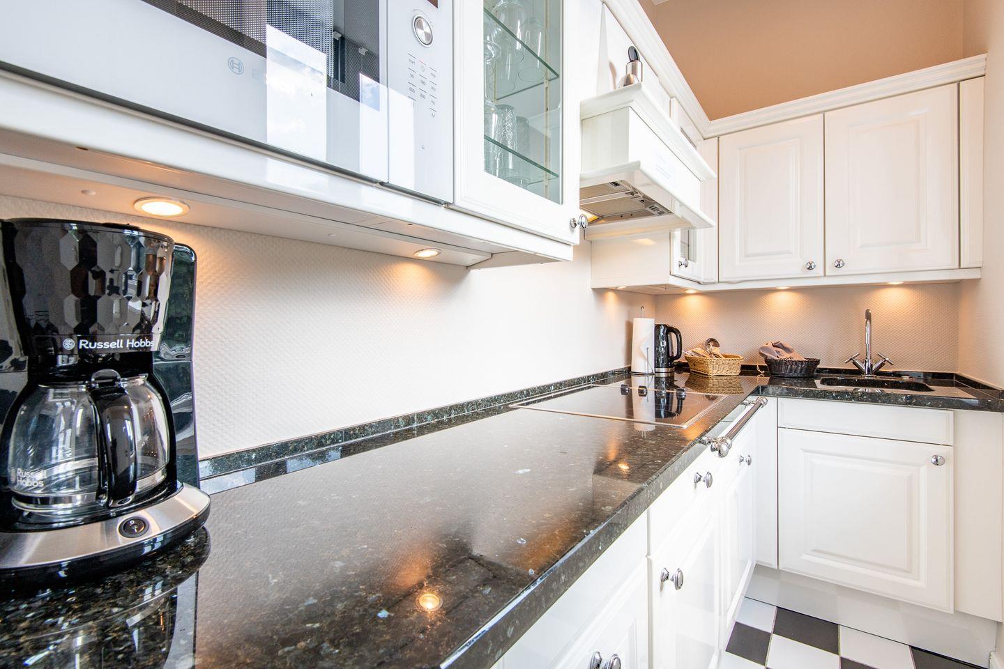 Die separate, moderne Hochglanzküche mit Granitarbeitsplatte ist bestens ausgestattet und bietet Ihnen ein Cerankochfeld, einen Geschirrspüler, eine Filterkaffeemaschine sowie alle notwendigen Utensilien, um Ihre Mahlzeiten bequem zuzubereiten.