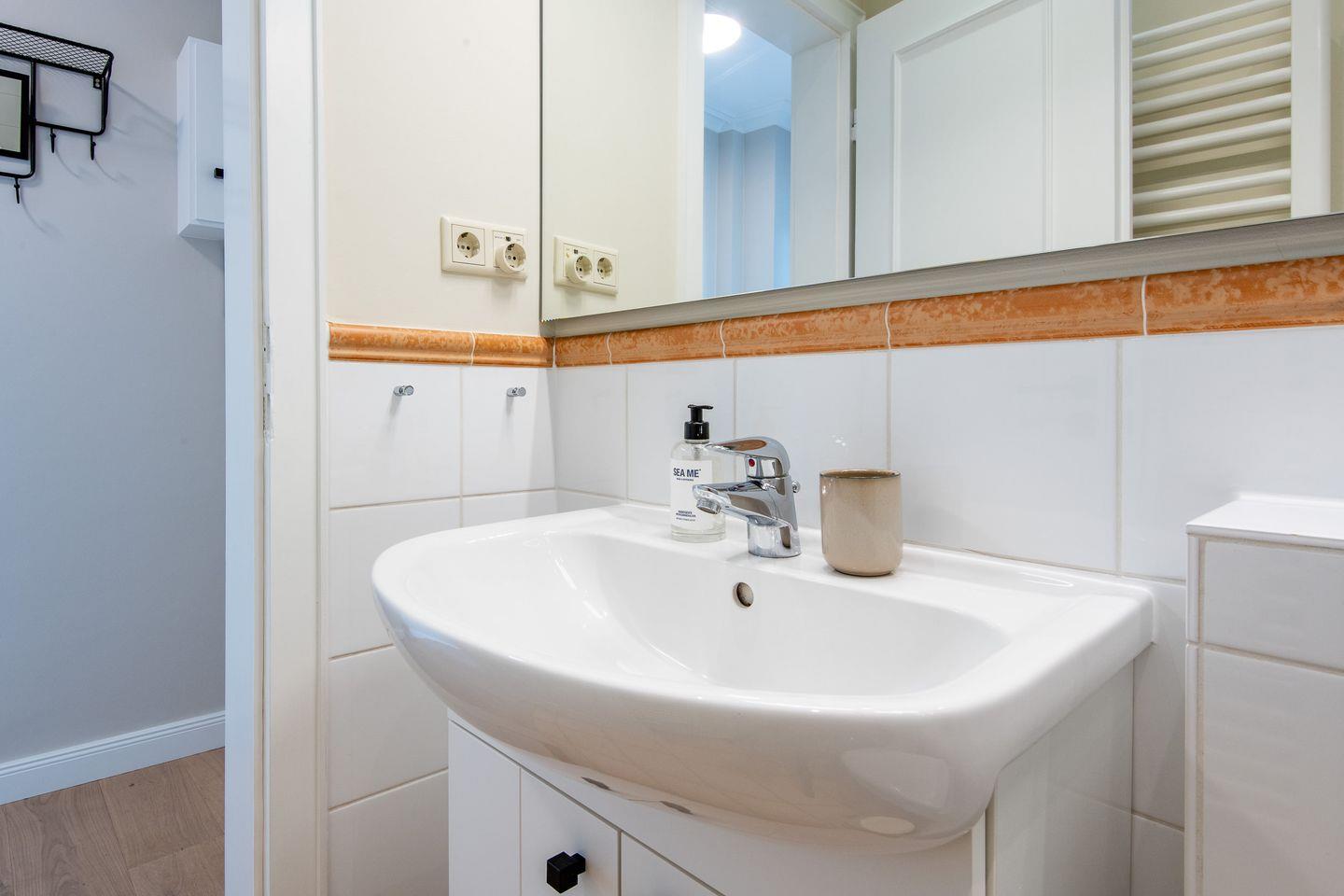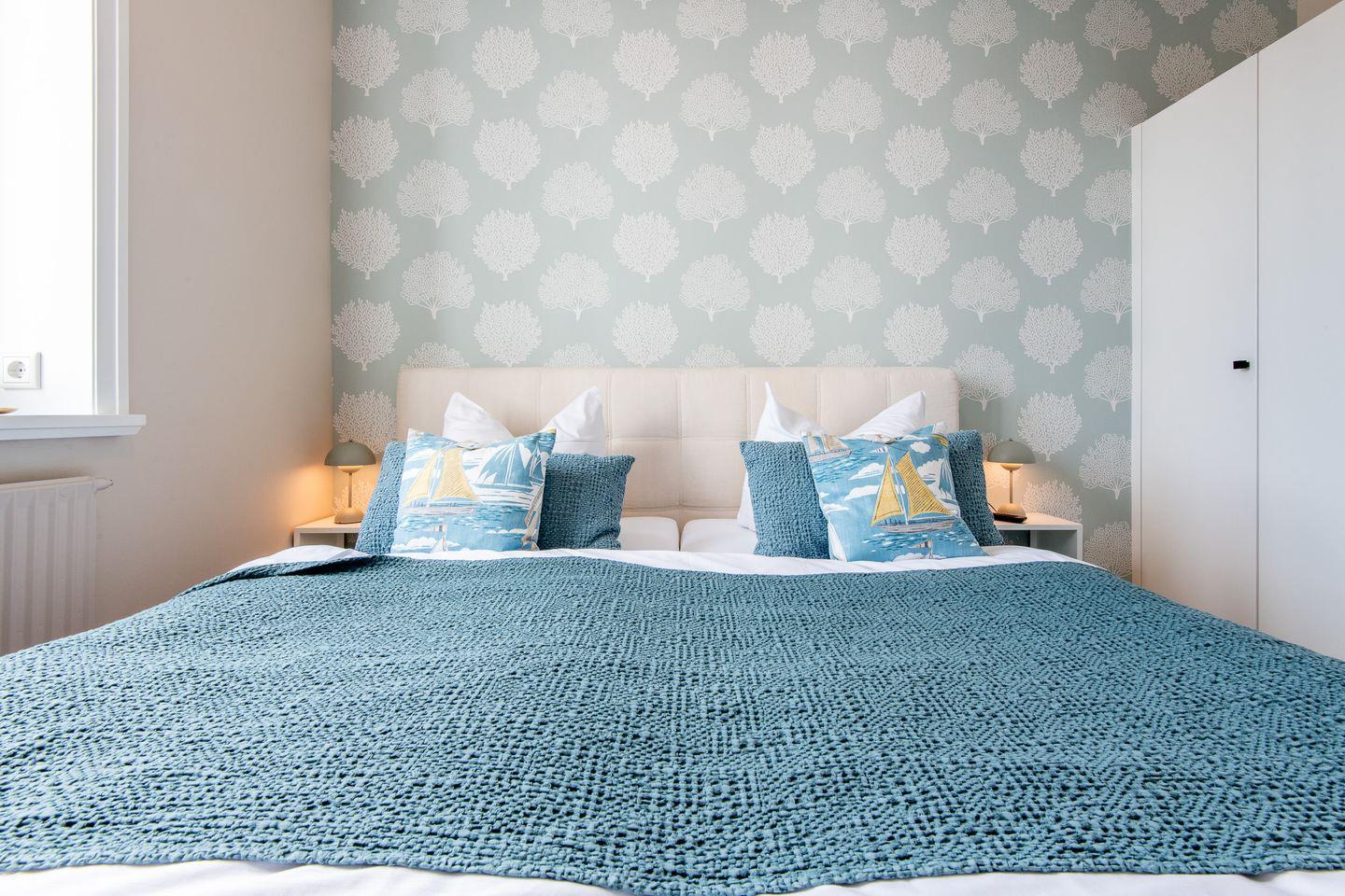 Das Schlafzimmer ist mit einem bequemen Boxspringbett (180x200 cm) und einem geräumigen Kleiderschrank ausgestattet, der ausreichend Platz für Ihre Kleidung und persönlichen Dinge bietet. Das Badezimmer ist hell und modern und verfügt über eine Dusche, WC, Föhn und einen Handtuchwärmer, damit Sie sich nach einem Tag am Strand erfrischen können.