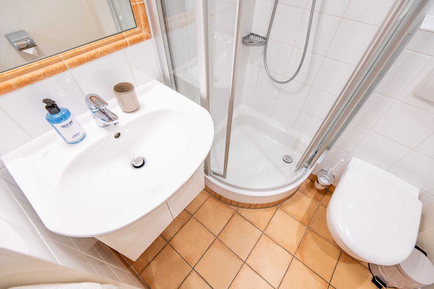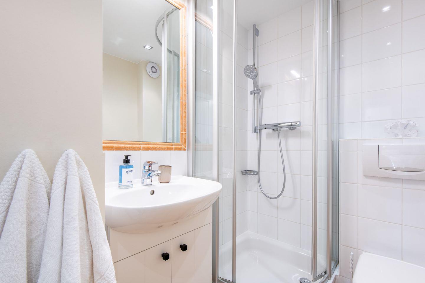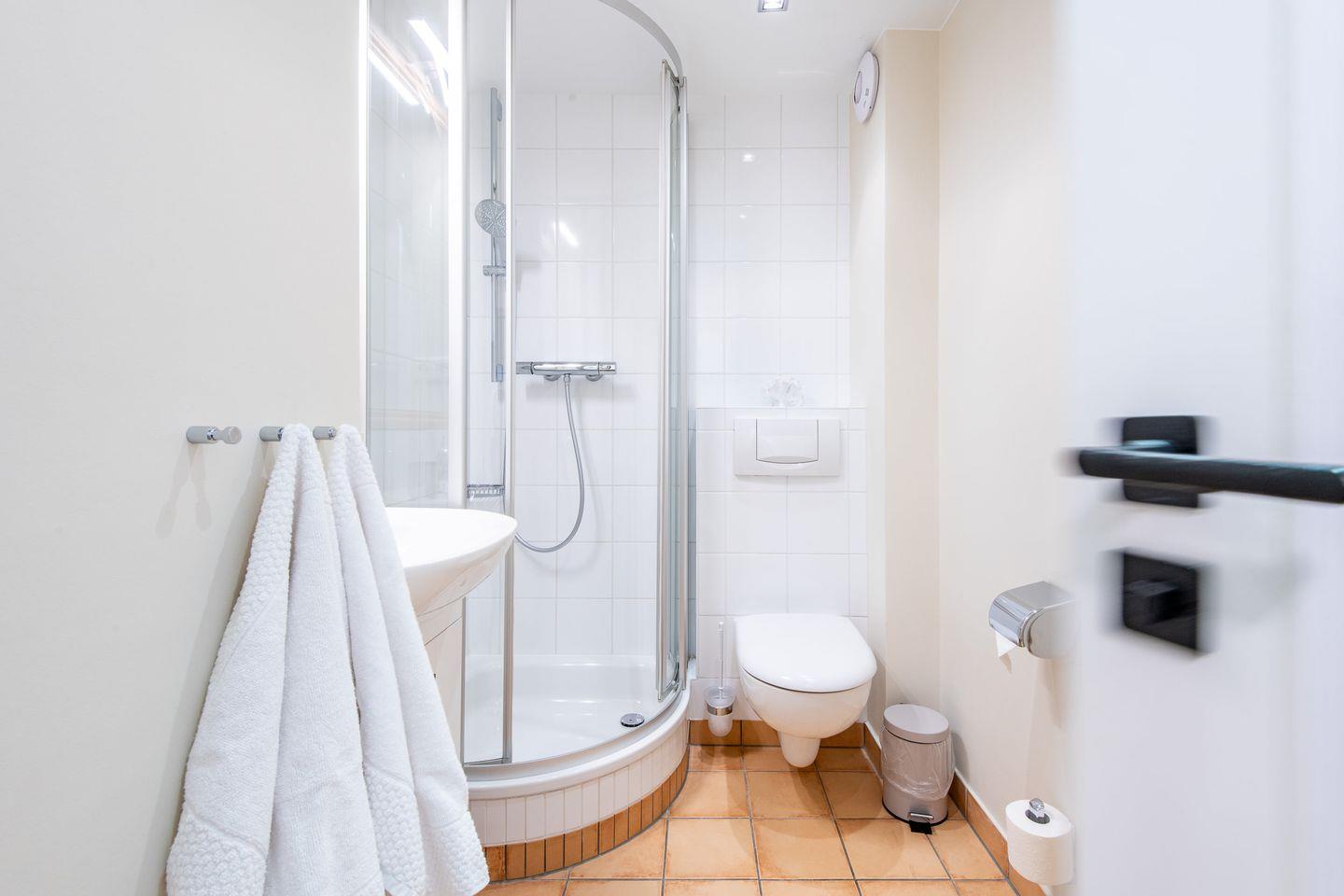Das moderne Badezimmer ist ein Duschbad und verfügt über eine bodengleiche Dusche, WC, Föhn und einen Handtuchwärmer, der für zusätzlichen Komfort sorgt.