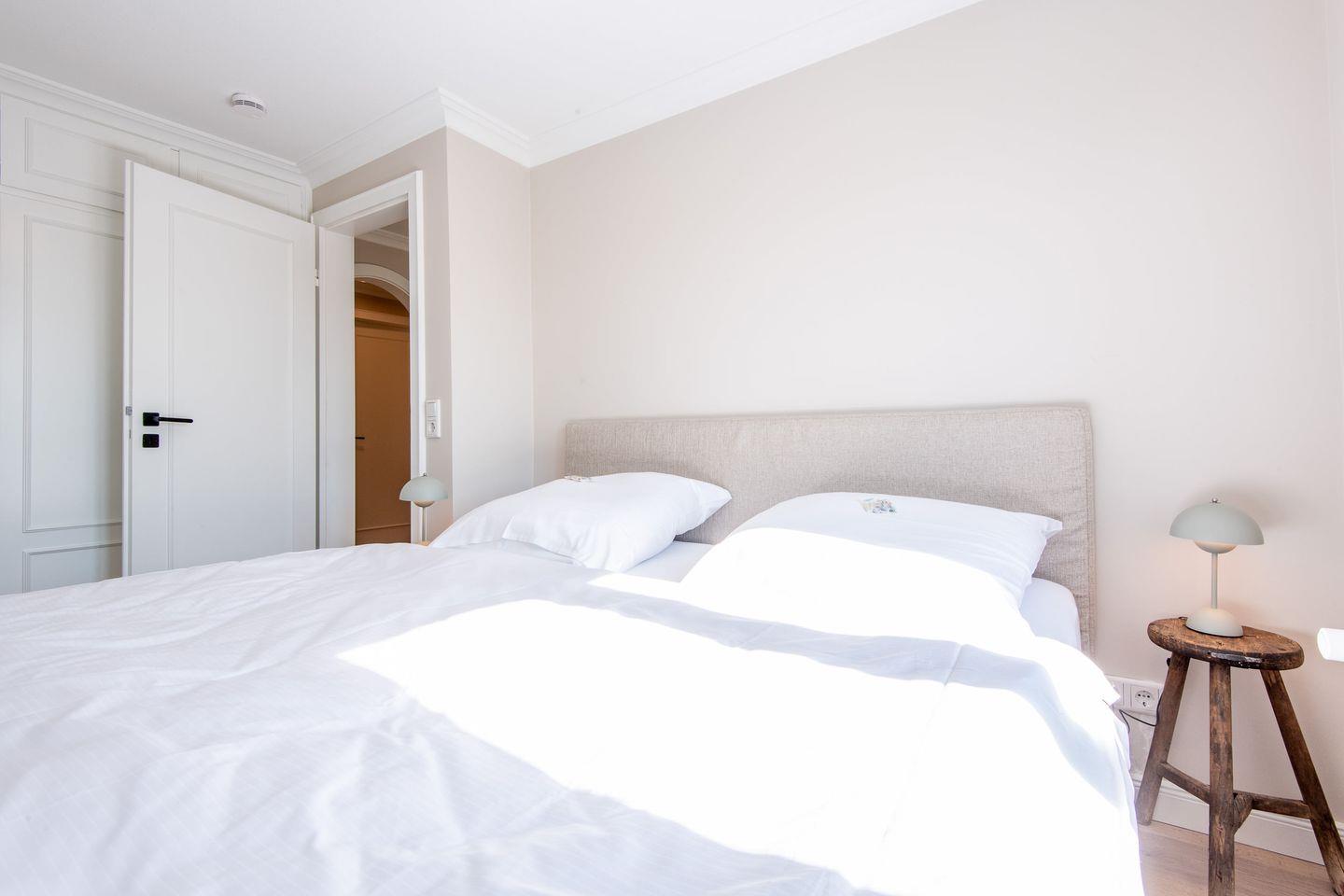 Das Hauptschlafzimmer verfügt über ein bequemes Boxspringbett (180x200 cm) und einen geräumigen Kleiderschrank, der ausreichend Platz für Ihre persönlichen Gegenstände bietet. Im zweiten Schlafzimmer erwartet Sie ein Einzelbett (90x200 cm) sowie ein weiterer Kleiderschrank – ideal für die dritte Person.