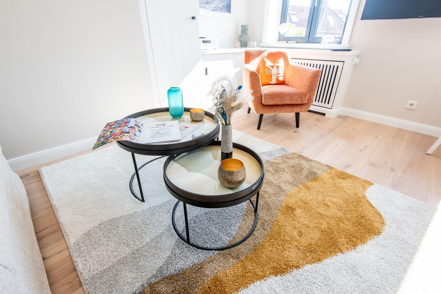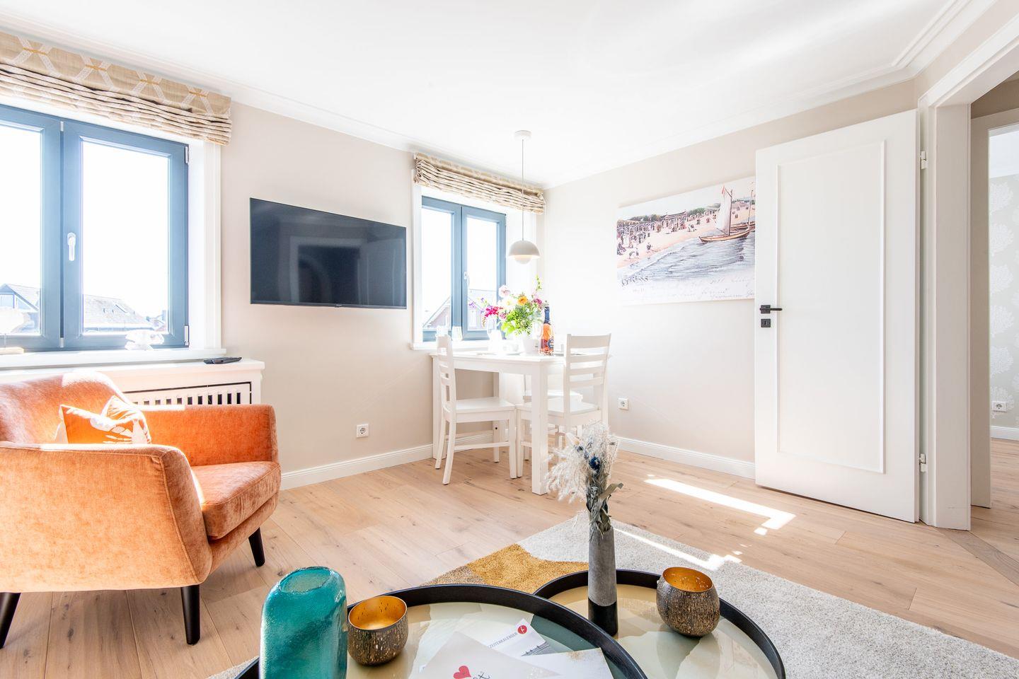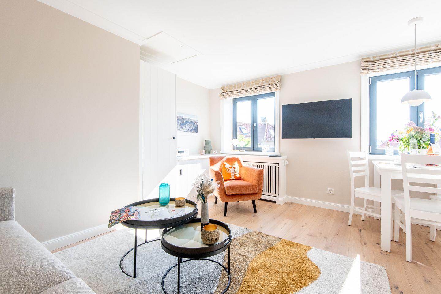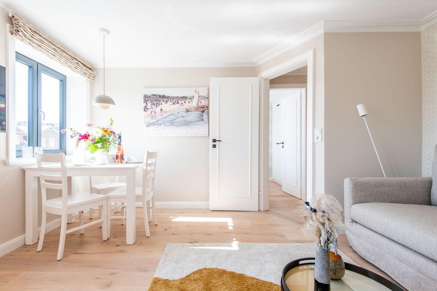 Das gemütliche Wohnzimmer lädt mit einem komfortablen Sofa und einer stilvollen Essecke dazu ein, entspannte Stunden zu verbringen. Hier können Sie gemeinsame Mahlzeiten genießen oder nach einem erlebnisreichen Tag auf Sylt entspannen.