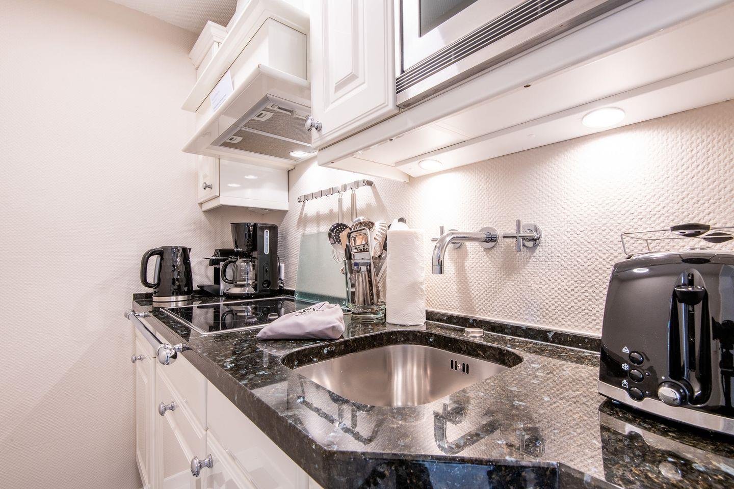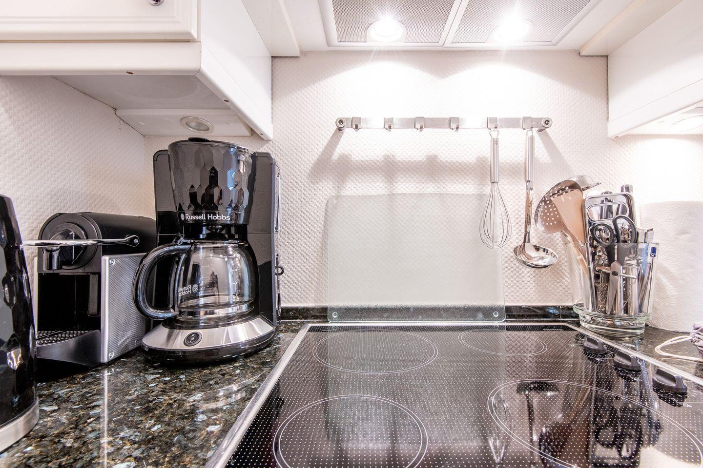 Die separate, moderne Küche besticht durch ihre elegante Hochglanzoptik mit einer edlen Granitarbeitsplatte. Ausgestattet mit einem Cerankochfeld, Geschirrspüler, Nespresso-Maschine und Filterkaffeemaschine, bietet sie alles, was Sie benötigen, um auch im Urlaub Ihre Lieblingsgerichte zuzubereiten.