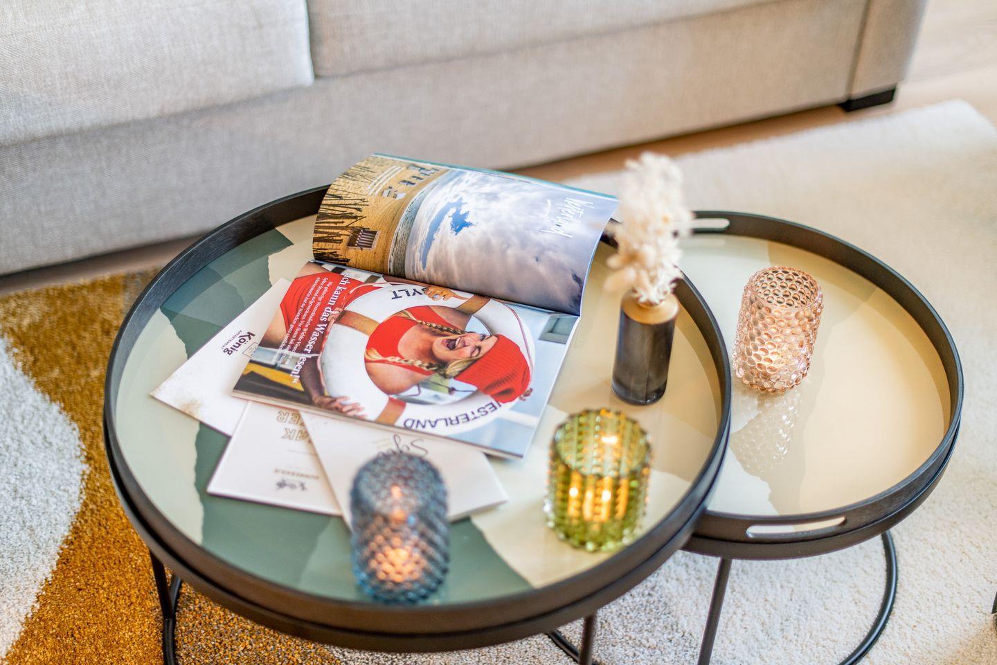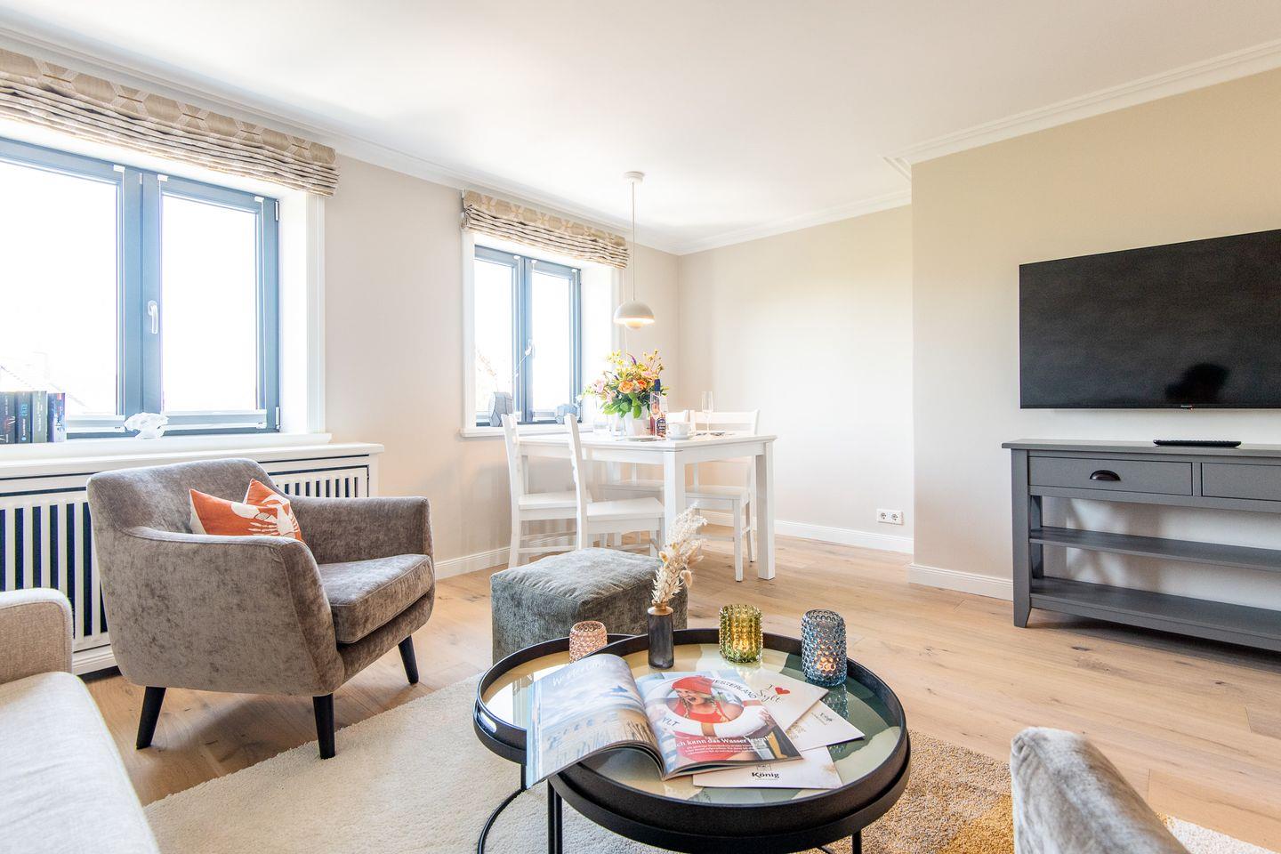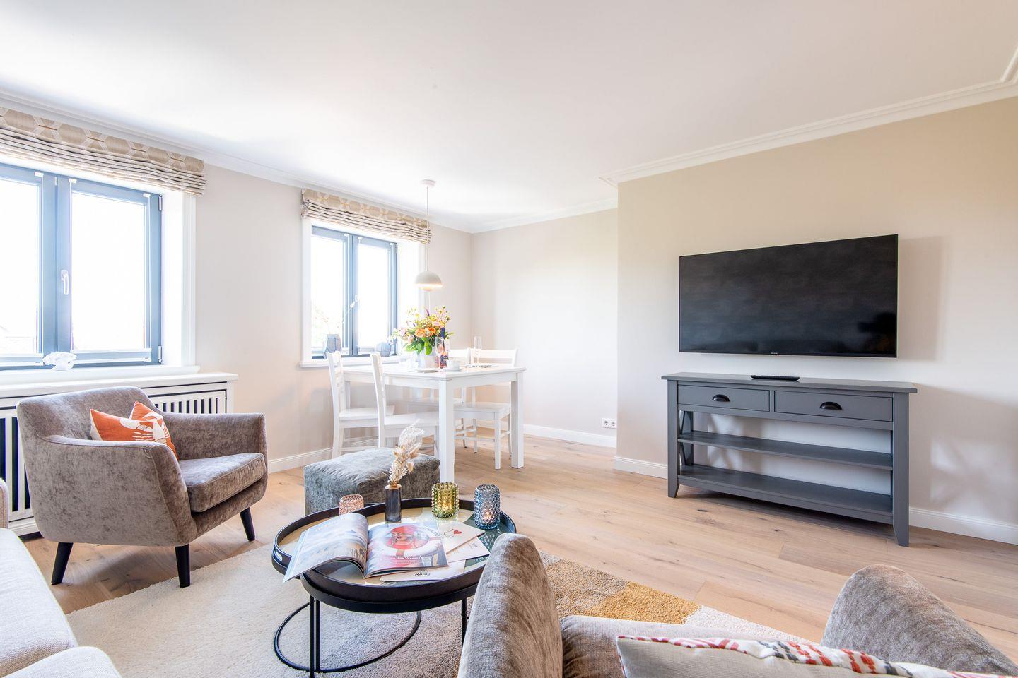 Das Wohnzimmer ist liebevoll und stilvoll eingerichtet, um Ihnen einen gemütlichen Aufenthalt zu ermöglichen. Ein komfortables Schlafsofa bietet hier Platz zum Entspannen und für eine zusätzliche Schlafgelegenheit. Der angrenzende Essbereich lädt zu gemeinsamen Mahlzeiten ein und schafft eine wohnliche Atmosphäre.
