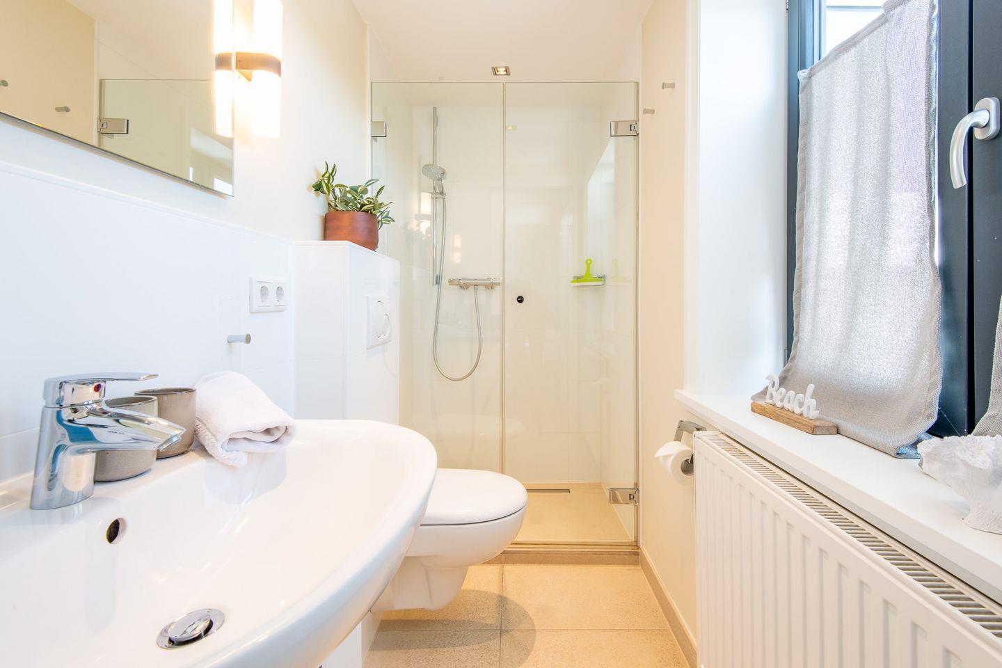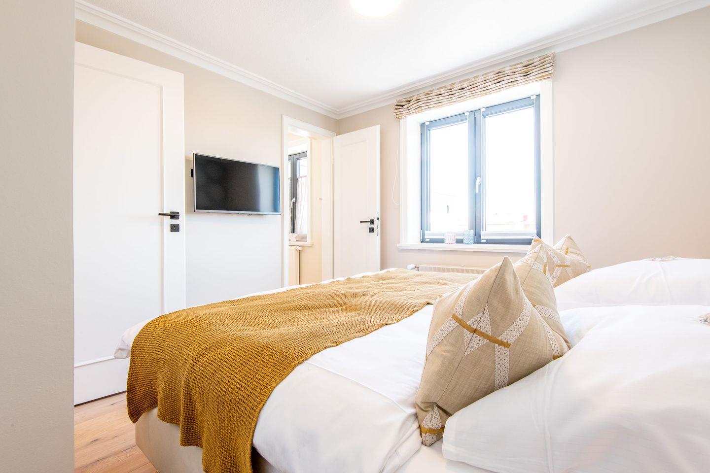 Das Schlafzimmer ist mit einem komfortablen Boxspringbett (180x200 cm) ausgestattet und bietet einen geräumigen Kleiderschrank, der ausreichend Platz für Ihre Garderobe bereitstellt. Das Badezimmer verfügt über eine Dusche, WC, Föhn und Handtuchwärmer, um Ihnen nach einem Tag am Strand den nötigen Komfort zu bieten.