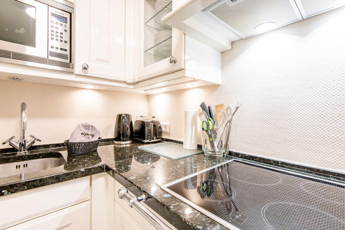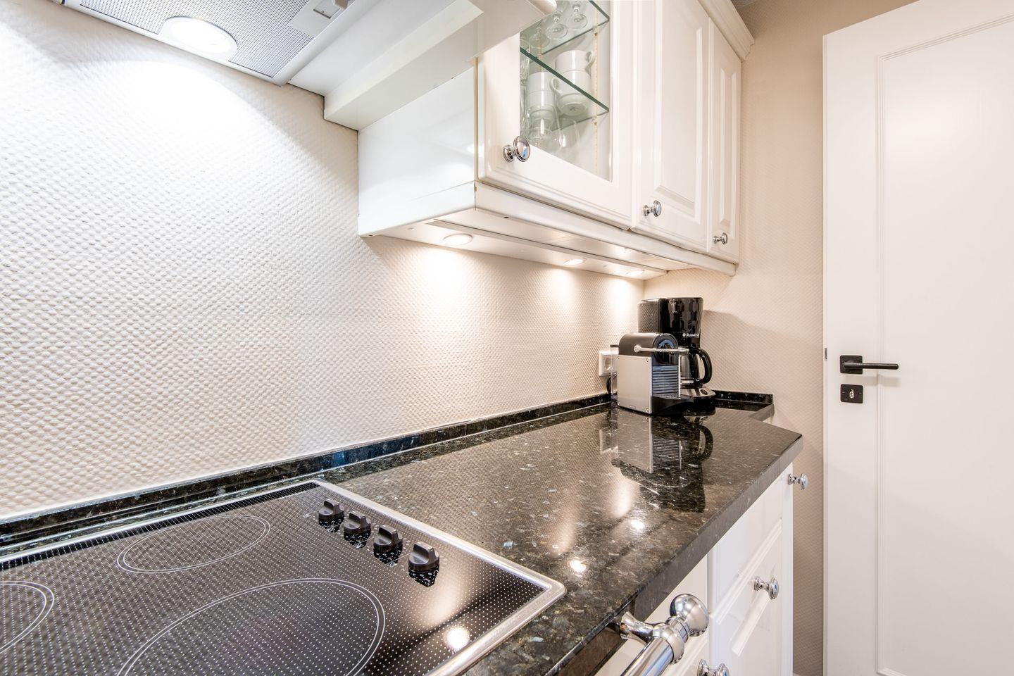 Die separate Hochglanzküche besticht durch eine elegante Granitarbeitsplatte und bietet modernen Komfort für alle, die auch im Urlaub gerne kochen. Sie ist mit einem Cerankochfeld, Geschirrspüler und Filterkaffeemaschine voll ausgestattet und ermöglicht die Zubereitung Ihrer Lieblingsgerichte.