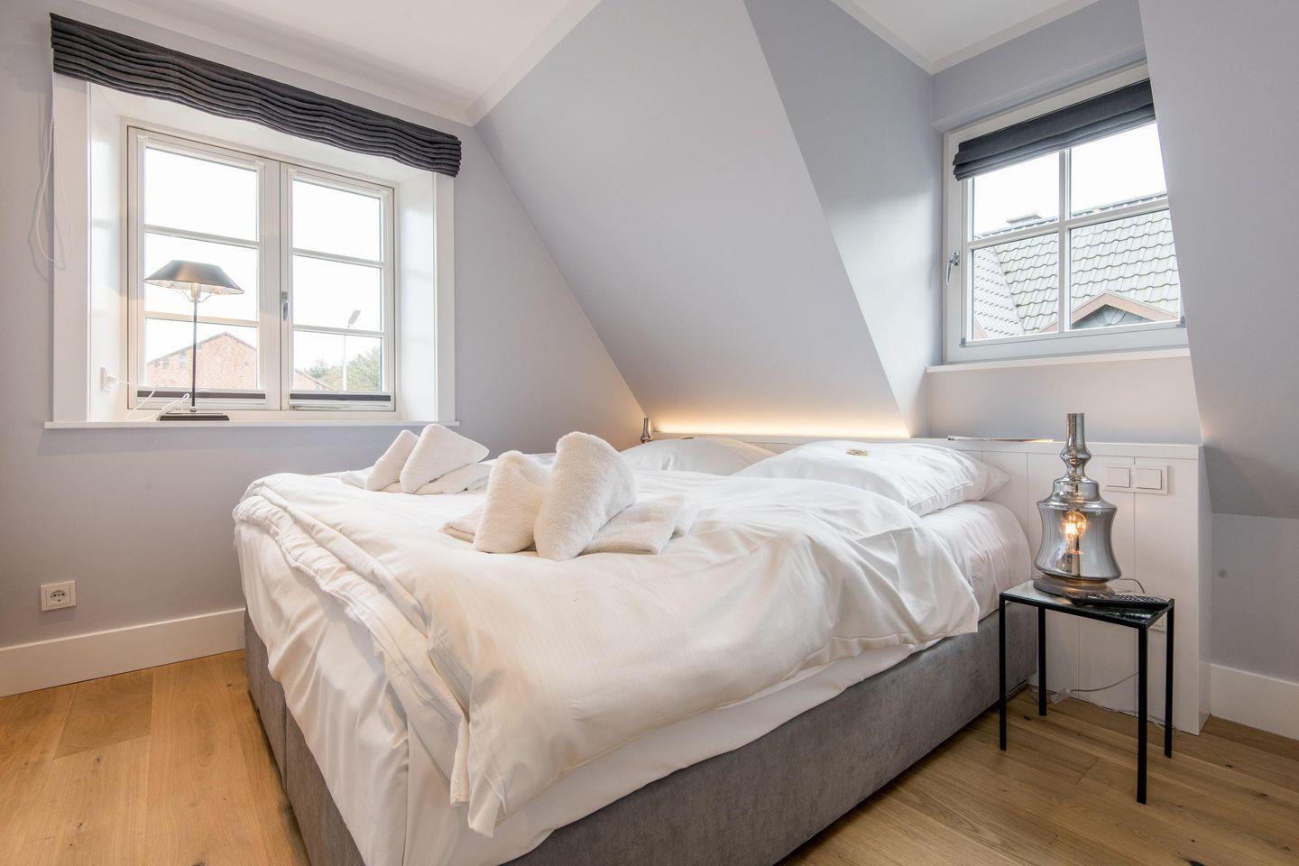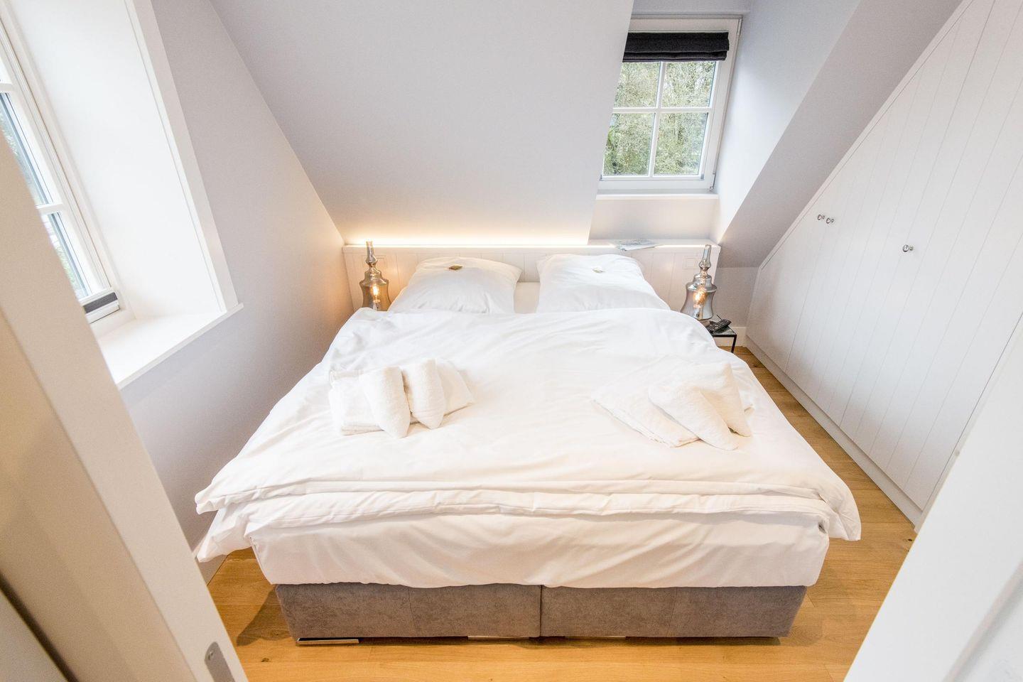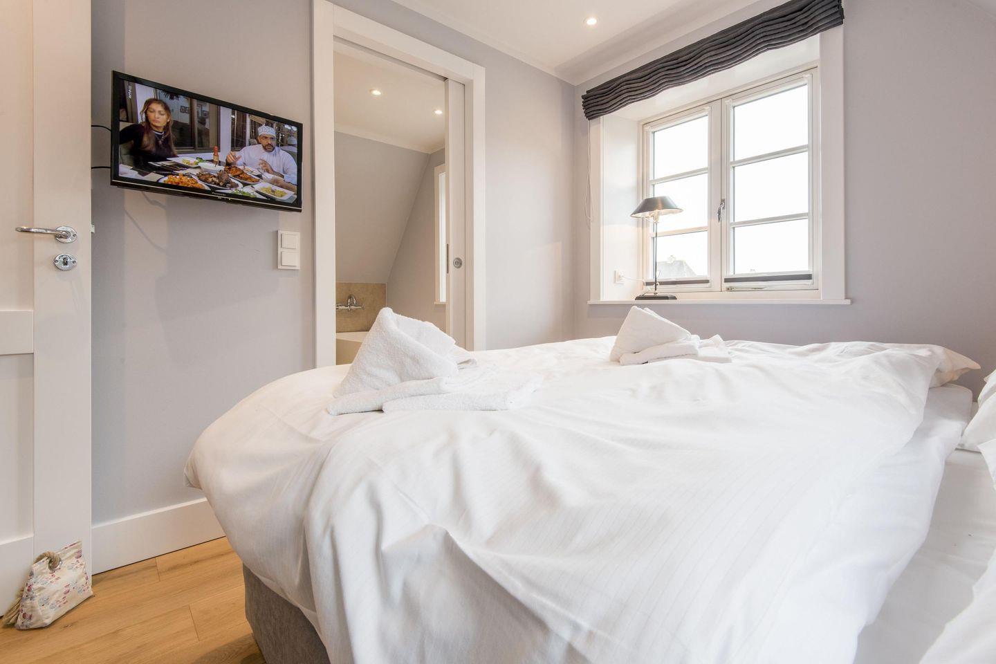 Das Schlafzimmer ist stilvoll eingerichtet und verfügt über ein hochwertiges Boxspringbett (160x200 cm) sowie einen weiteren TV. Hier können Sie sich entspannen und erholsame Nächte genießen.