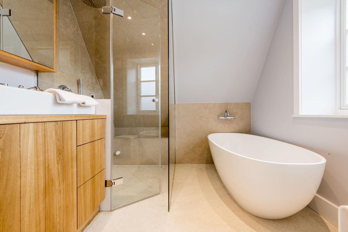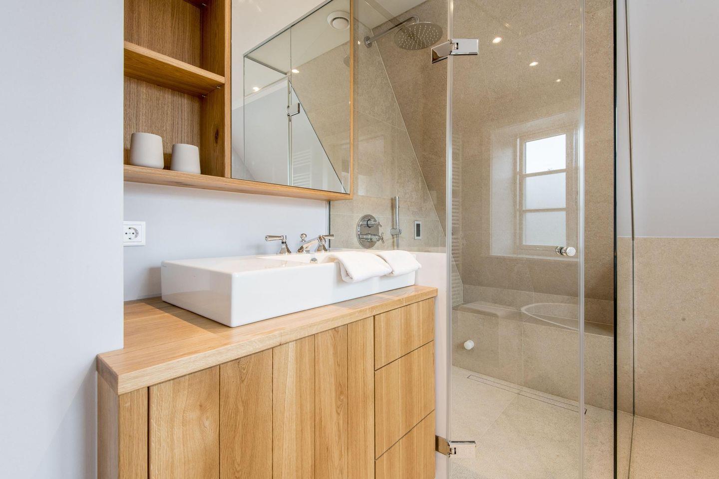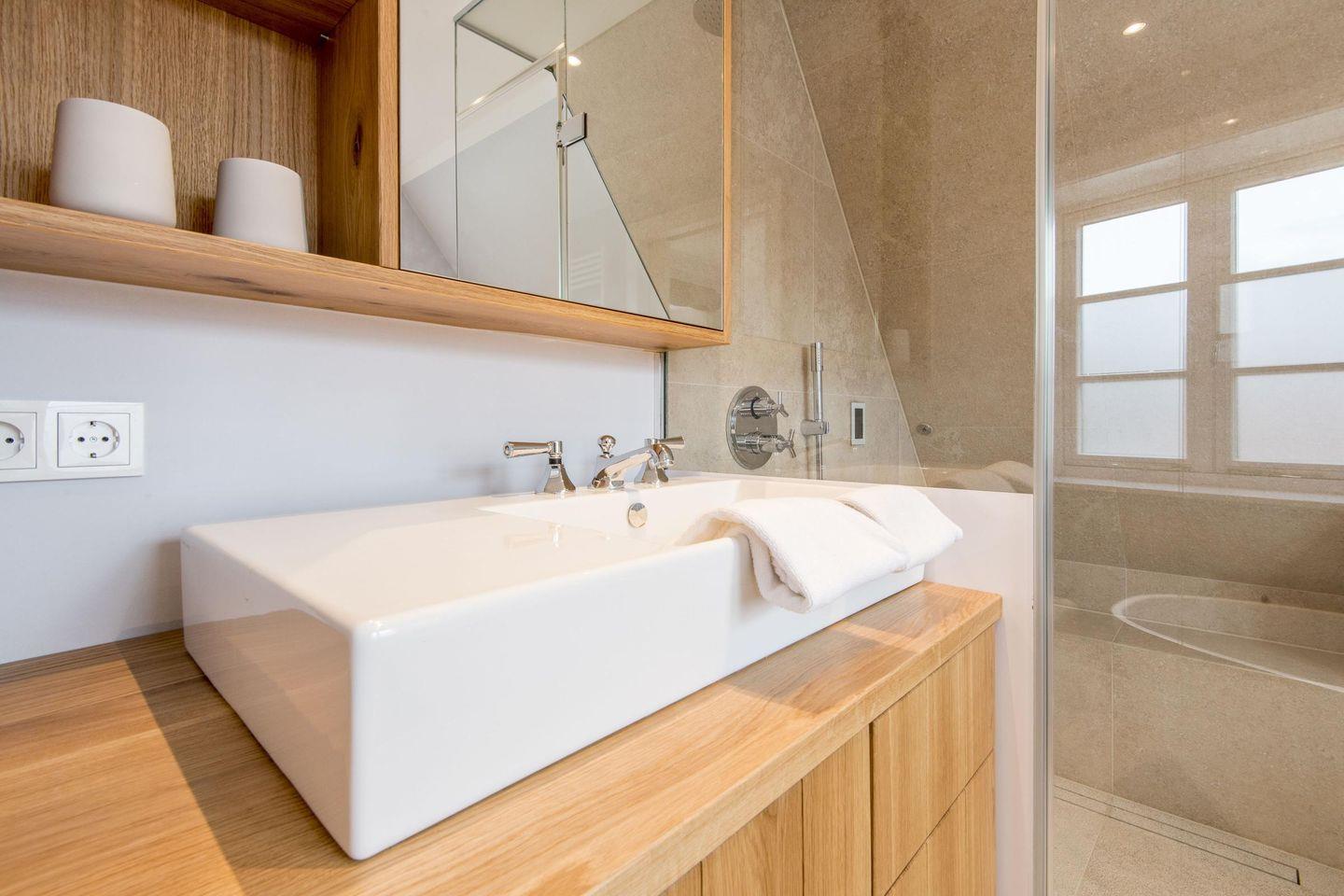 Das großzügige Badezimmer bietet sowohl eine Dampfdusche als auch eine Badewanne für luxuriöse Wellnessmomente. Ausgestattet mit WC, Föhn und Handtuchwärmer, sorgt es für einen angenehmen Start und Ausklang Ihres Urlaubstages.
