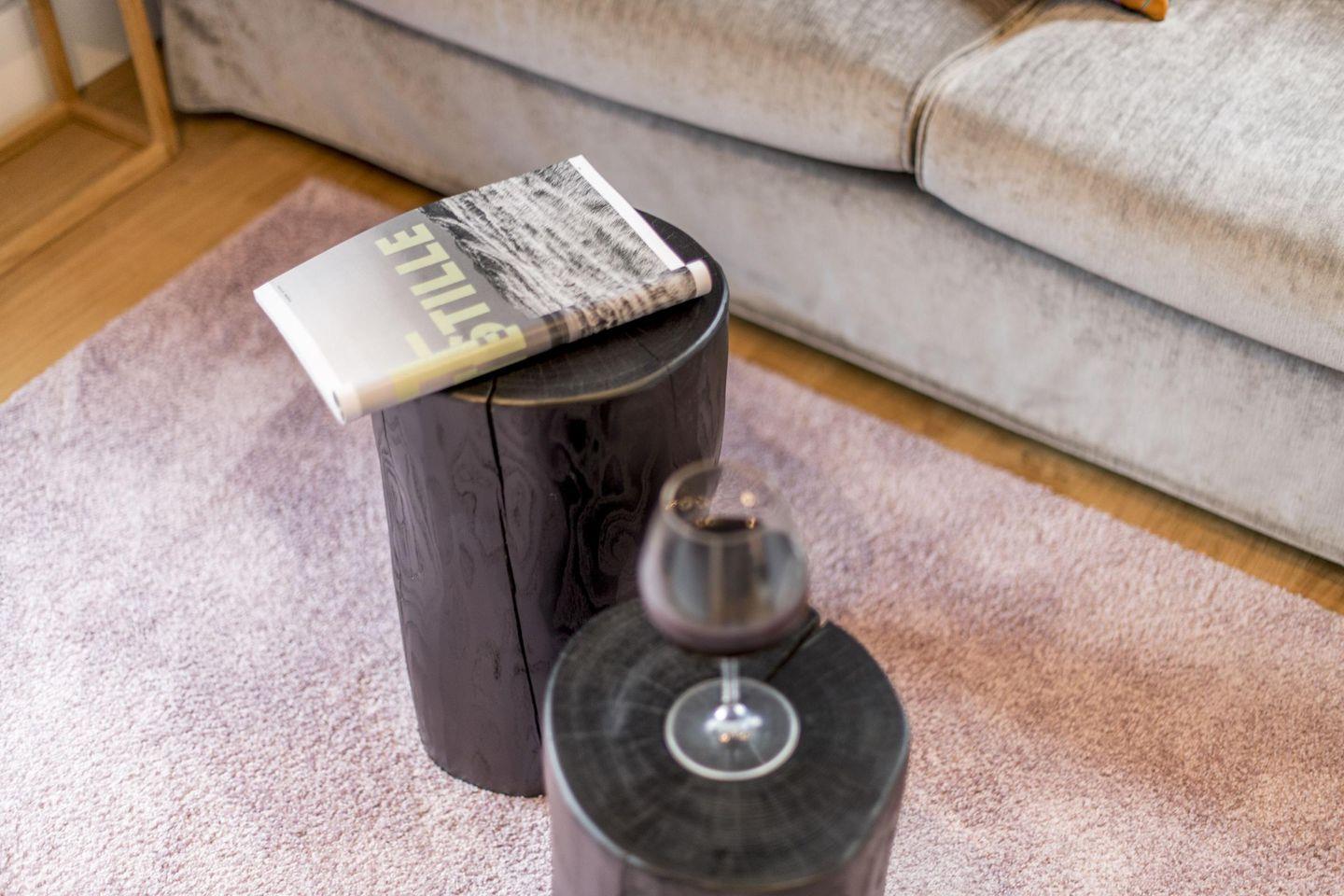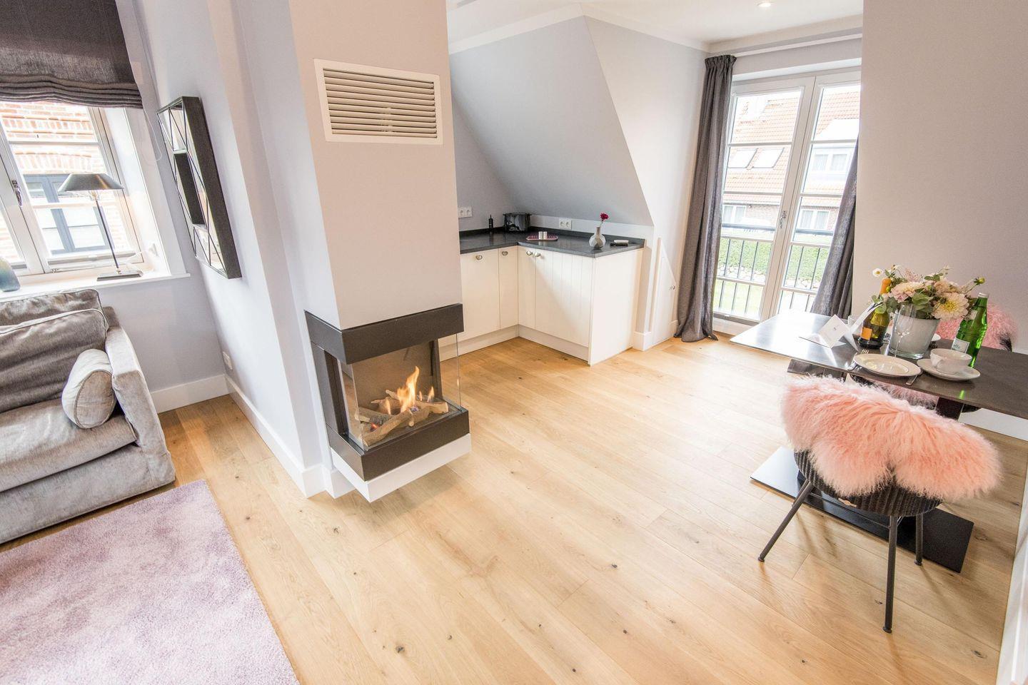 Das stilvoll gestaltete Wohnzimmer ist mit einem gemütlichen Sofa und TV ausgestattet, während ein eleganter Essbereich Platz für zwei Personen bietet. Ein Gaskamin sorgt für besondere Wohlfühlmomente und rundet das exklusive Ambiente ab. Von hier aus gelangen Sie direkt auf den sonnigen Südbalkon, der mit hochwertigen Gartenmöbeln ausgestattet ist und sich ideal für entspannte Stunden an der frischen Luft eignet.