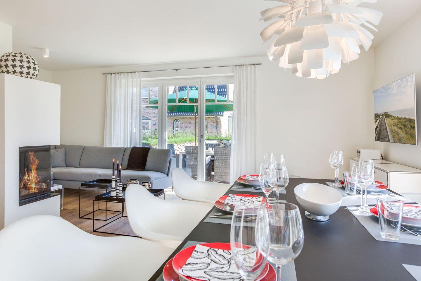 Das lichtdurchflutete Wohn- und Esszimmer besticht mit einem komfortablen Sofa, einem großen Esstisch und TV. Durch die bodentiefen Fenster gelangen Sie direkt in den Garten mit Terrasse und Strandkorb – der ideale Ort, um die Sylter Sonne zu genießen und frische Nordseeluft zu tanken.
