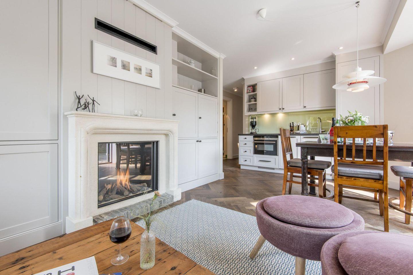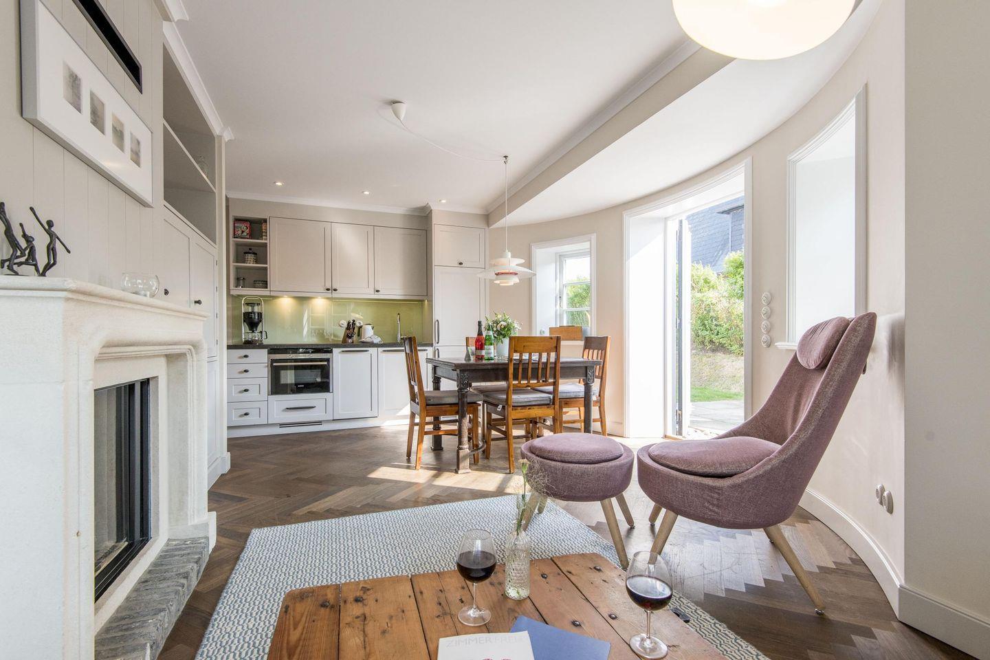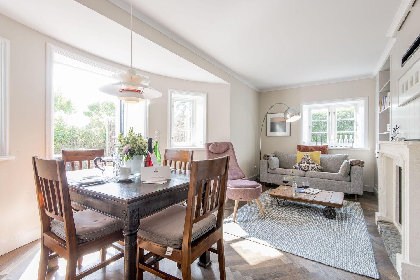 Der offene Wohnbereich bietet mit einem großen Schlafsofa (ca. 150x200 cm) und einem Sessel eine komfortable Umgebung zum Entspannen. Der stilvolle Gaskamin sorgt für eine behagliche Atmosphäre und macht den Raum zu einem einladenden Rückzugsort. Am großzügigen Esstisch für vier Personen lassen sich gemütliche Mahlzeiten genießen, und der direkte Zugang zur Terrasse und zum Garten rundet den Wohnkomfort ab.