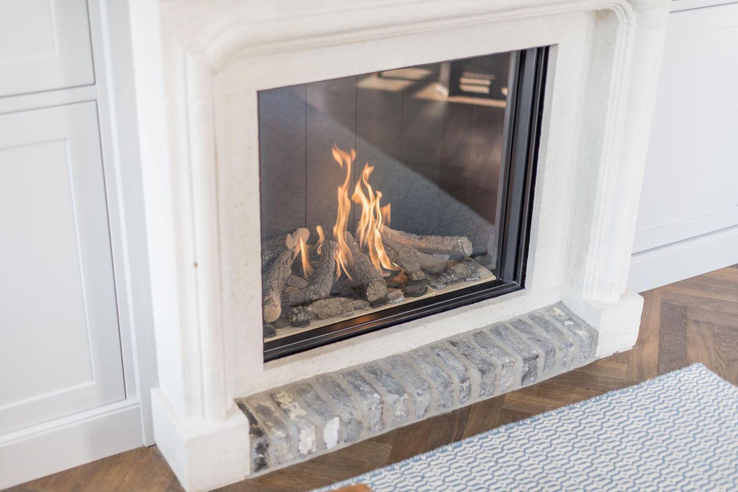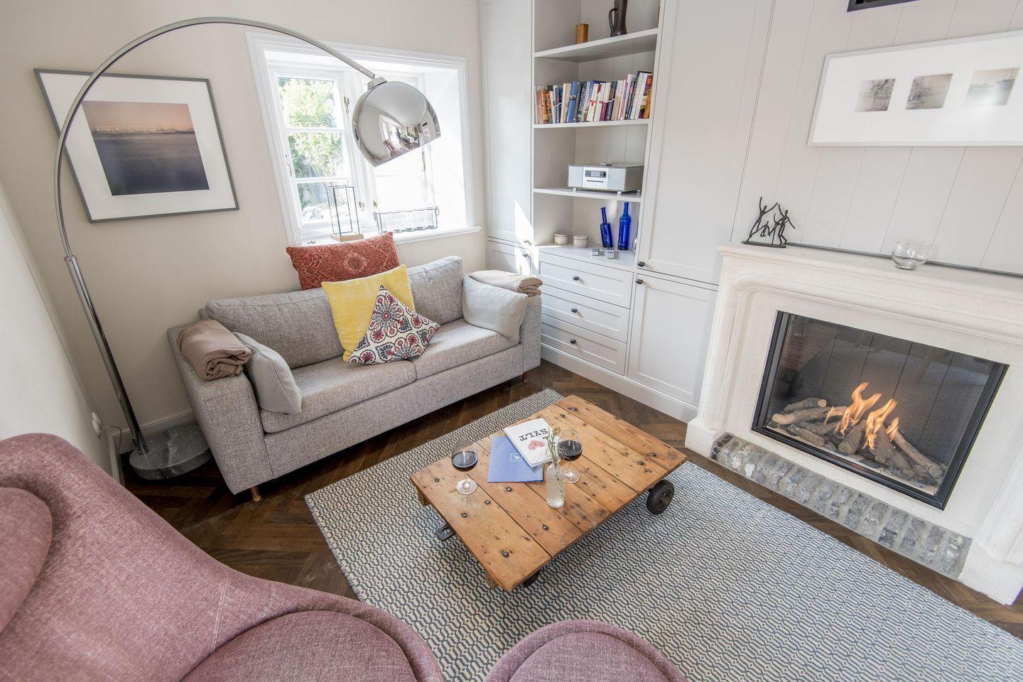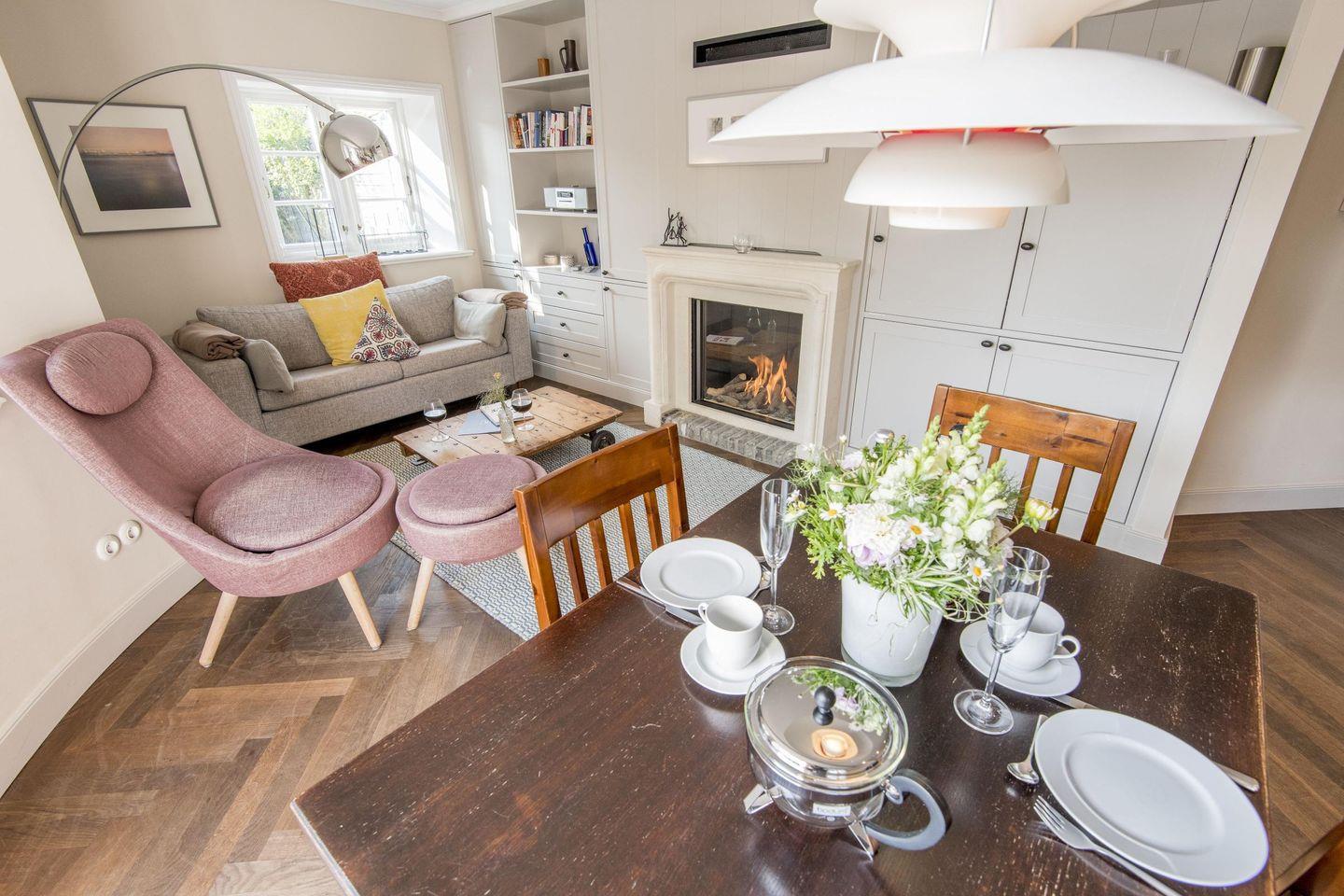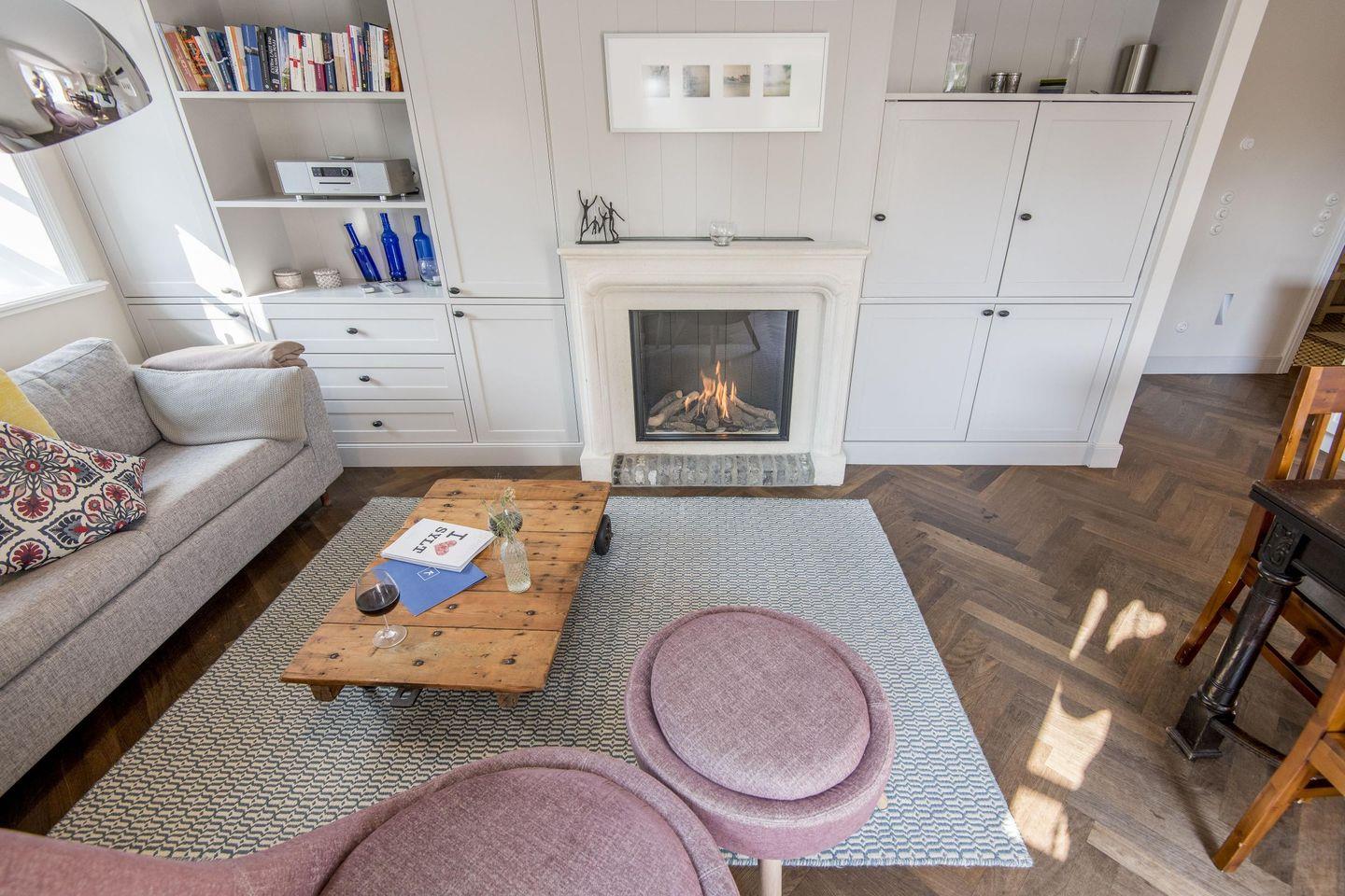 Der offene Wohnbereich bietet mit einem großen Schlafsofa (ca. 150x200 cm) und einem Sessel eine komfortable Umgebung zum Entspannen. Der stilvolle Gaskamin sorgt für eine behagliche Atmosphäre und macht den Raum zu einem einladenden Rückzugsort. Am großzügigen Esstisch für vier Personen lassen sich gemütliche Mahlzeiten genießen, und der direkte Zugang zur Terrasse und zum Garten rundet den Wohnkomfort ab.