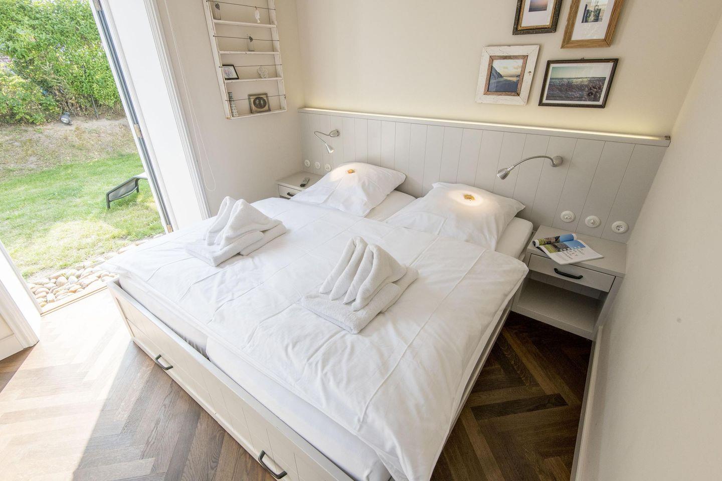 Das Schlafzimmer ist mit einem komfortablen Doppelbett (2x 90x200 cm), Einbauschränken und einem Schreibtisch ausgestattet. Hier haben Sie ebenfalls einen direkten Zugang zum Garten, was den Raum besonders hell und freundlich macht. Ein TV sorgt für zusätzliche Unterhaltung.