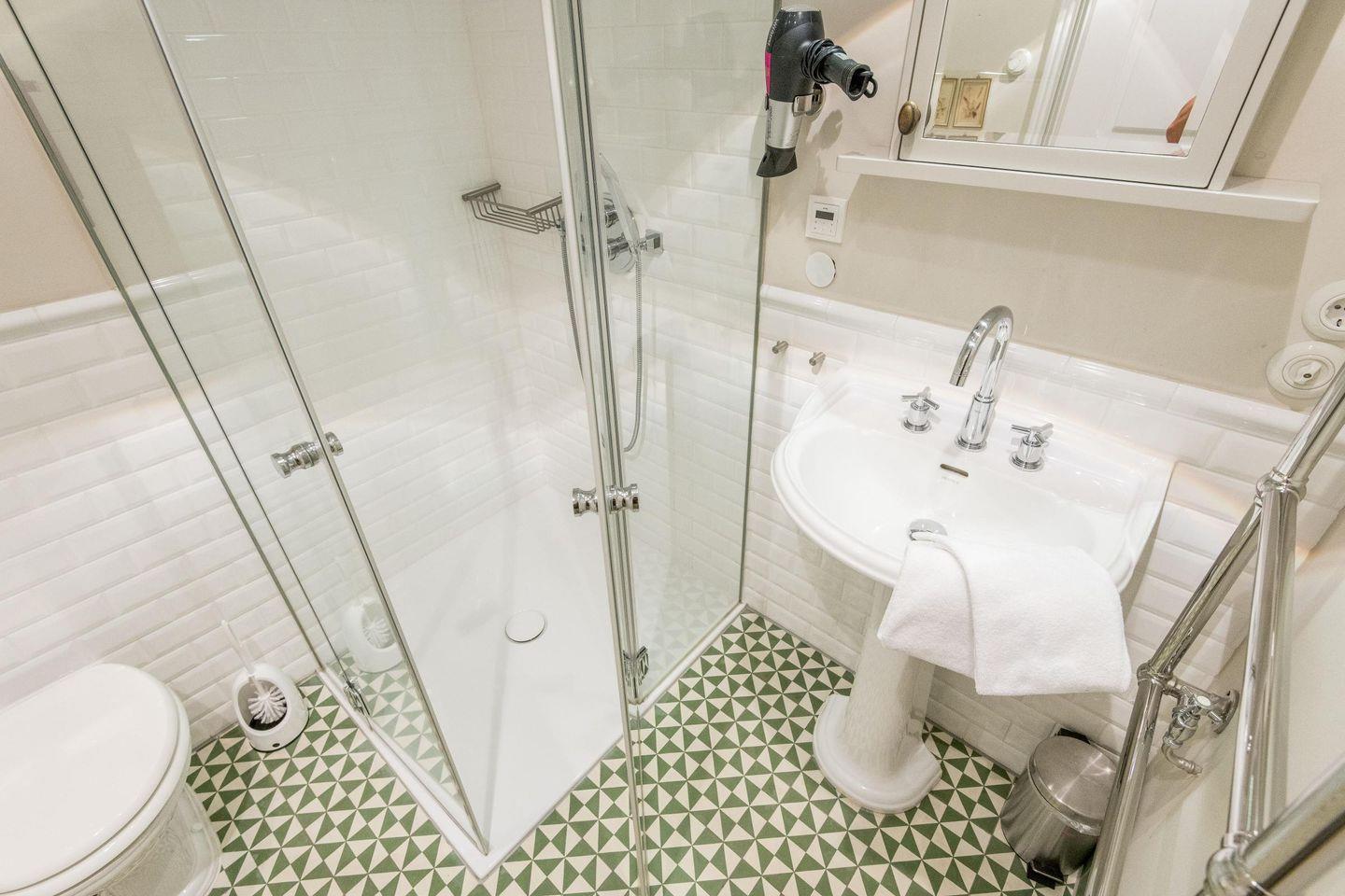 Das Badezimmer bietet eine moderne Ausstattung und lädt mit einer ebenerdigen Dusche und finnischen Sauna zu wohltuenden Wellness-Momenten ein. Mit WC und Föhn ausgestattet, sorgt das Bad für einen perfekten Start in den Tag oder entspannte Abende nach einem Tag am Strand.