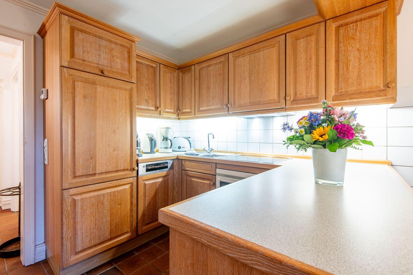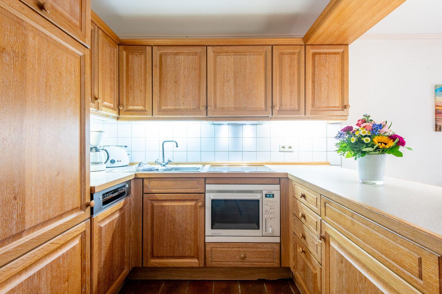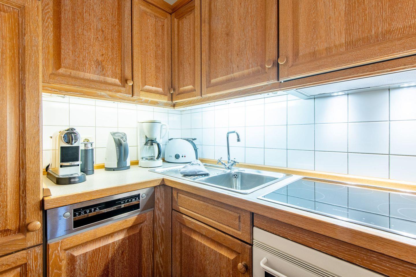Die offene Küche ist mit einem Ceranfeld, einer Filterkaffeemaschine und einer Nespresso-Maschine ausgestattet. Hier finden Sie alle Annehmlichkeiten, um Ihre Mahlzeiten bequem zuzubereiten und im einladenden Essbereich zu genießen.