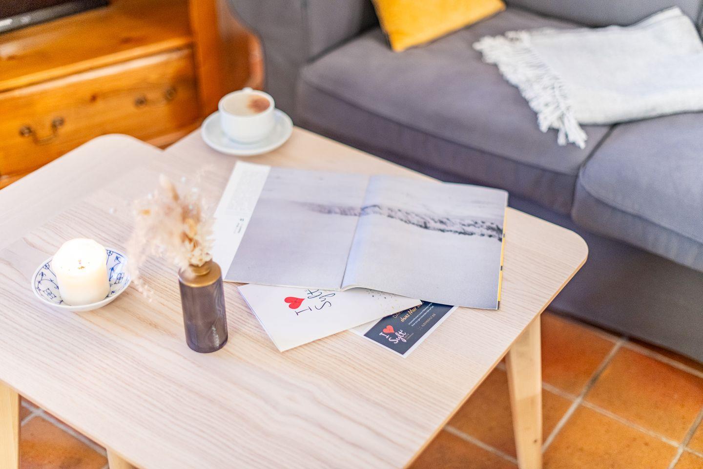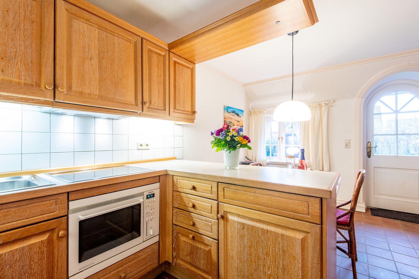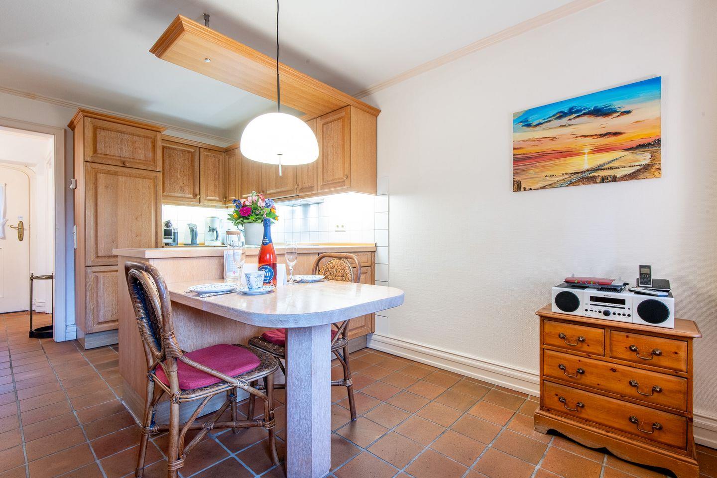 Die offene Küche ist mit einem Ceranfeld, einer Filterkaffeemaschine und einer Nespresso-Maschine ausgestattet. Hier finden Sie alle Annehmlichkeiten, um Ihre Mahlzeiten bequem zuzubereiten und im einladenden Essbereich zu genießen.