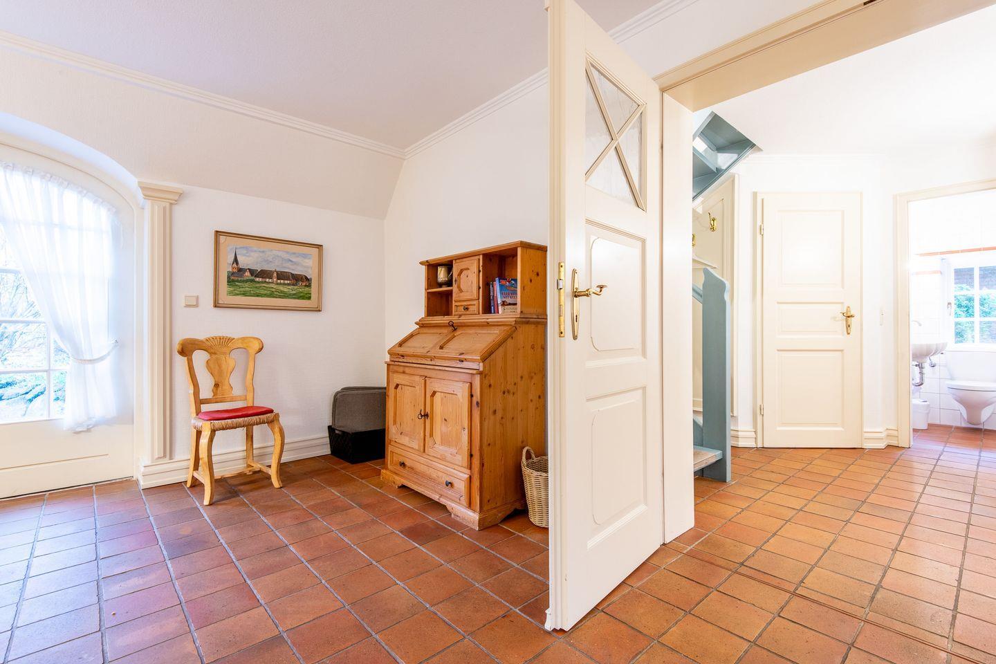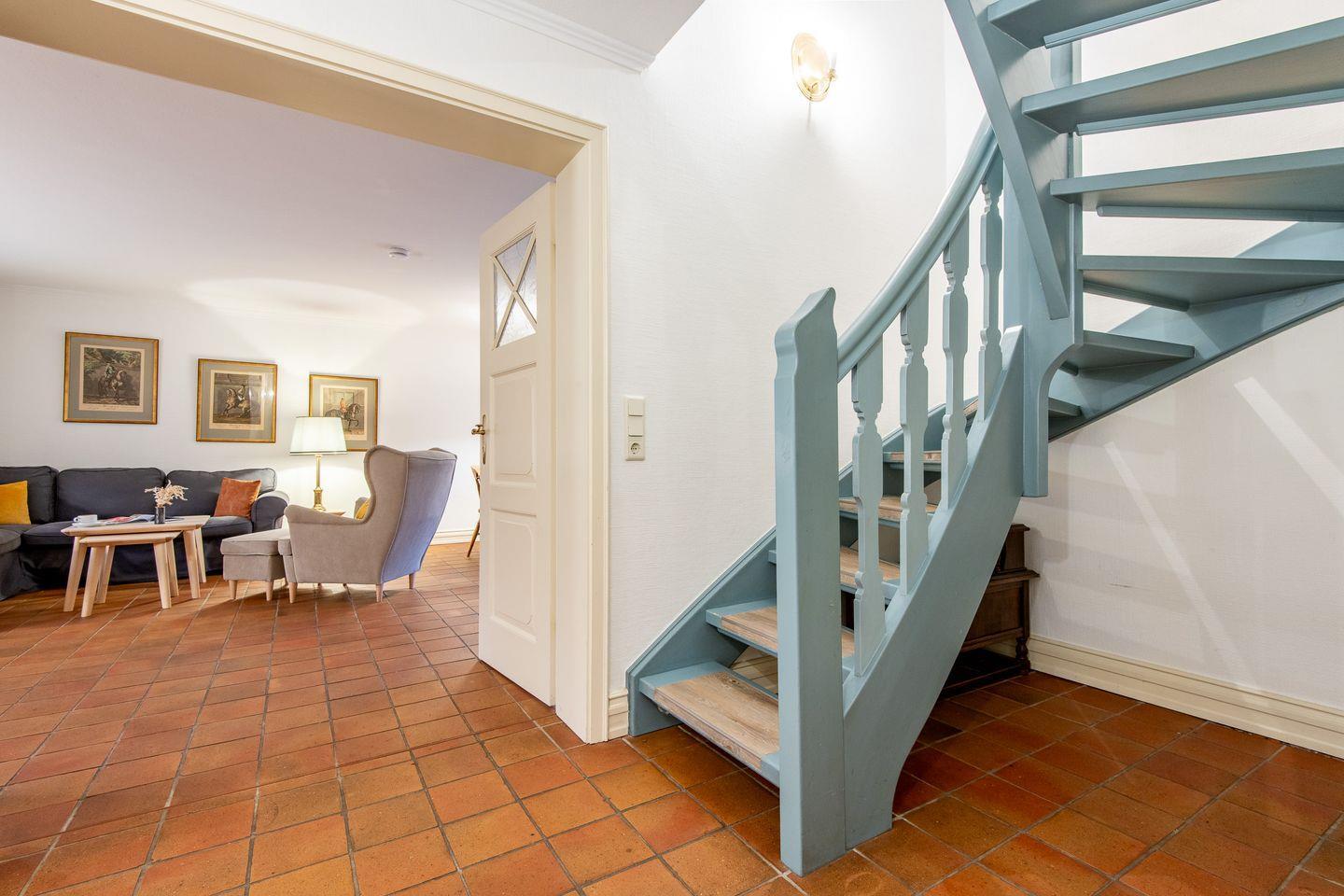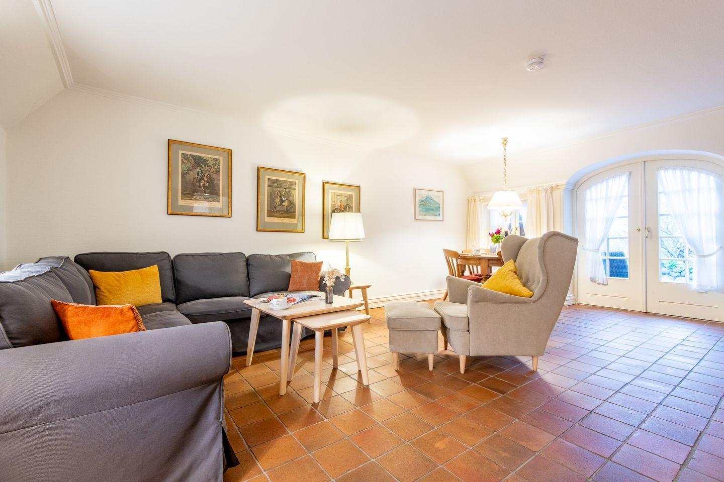 Der helle Wohn-Essbereich ist mit einem gemütlichen Sofa, TV und einer komfortablen Essecke ausgestattet und bietet den idealen Rückzugsort nach einem Tag am Strand. Vom Wohnzimmer aus gelangen Sie direkt auf die sonnige, möblierte Terrasse, die mit einem Strandkorb und Gartenmöbeln zum Verweilen einlädt. Das gesamte Erdgeschoss ist mit Fußbodenheizung und historischen Pluviosen ausgestattet und sorgt für eine behagliche Atmosphäre.