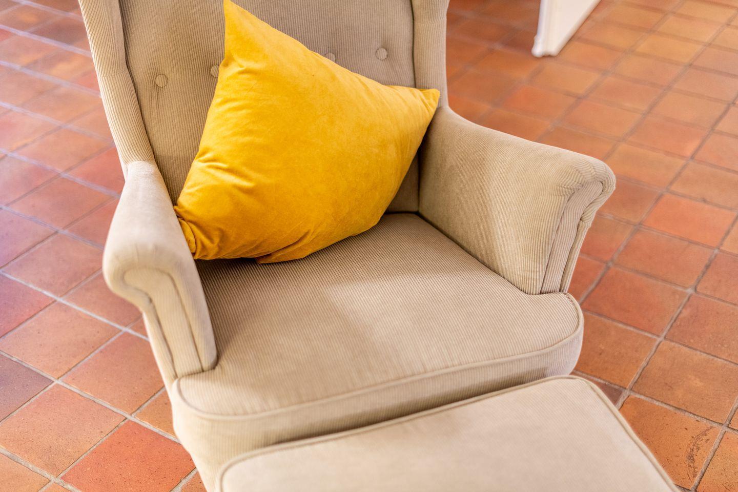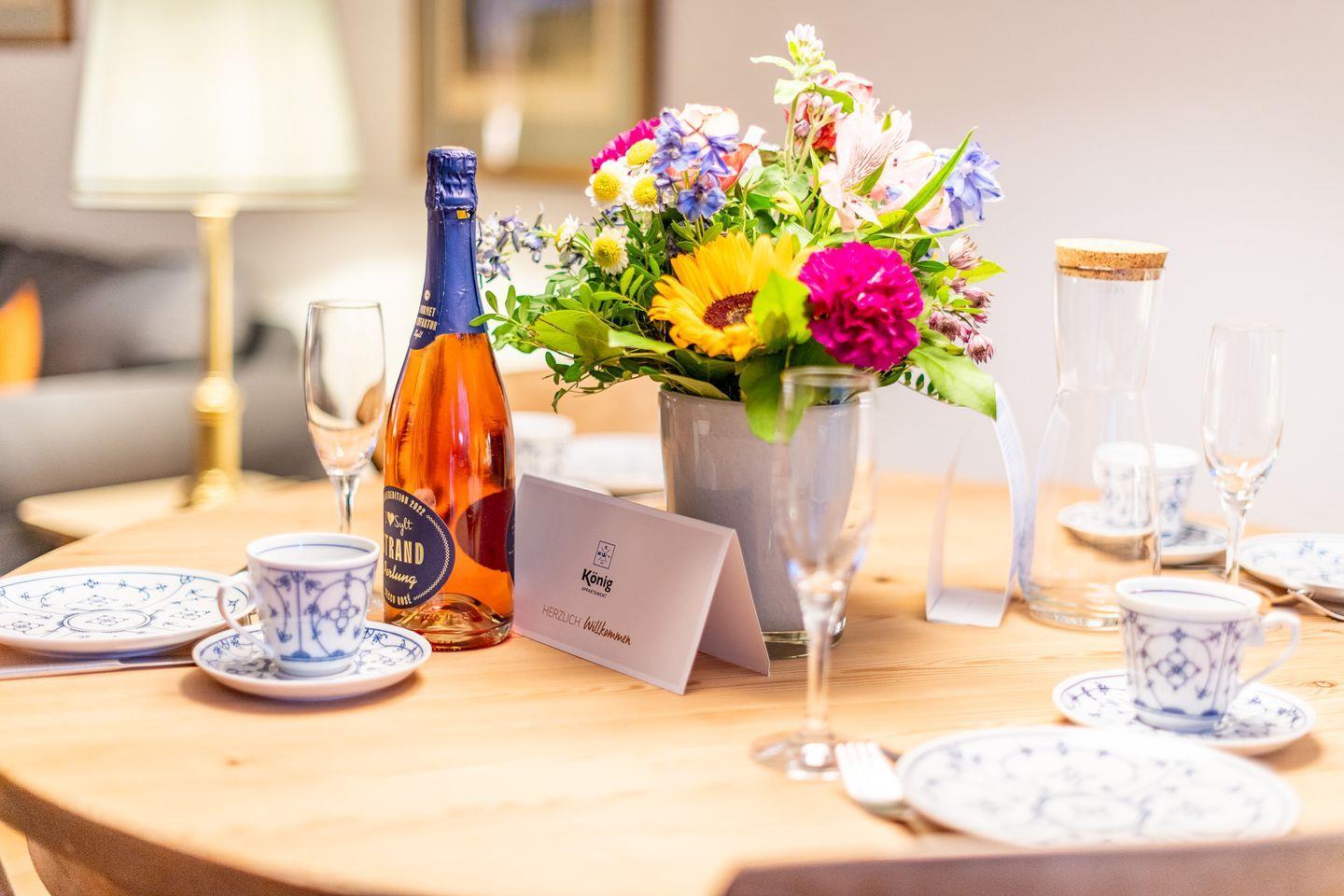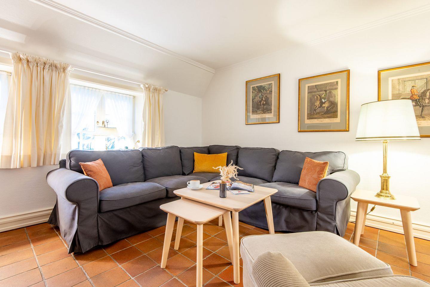 Der helle Wohn-Essbereich ist mit einem gemütlichen Sofa, TV und einer komfortablen Essecke ausgestattet und bietet den idealen Rückzugsort nach einem Tag am Strand. Vom Wohnzimmer aus gelangen Sie direkt auf die sonnige, möblierte Terrasse, die mit einem Strandkorb und Gartenmöbeln zum Verweilen einlädt. Das gesamte Erdgeschoss ist mit Fußbodenheizung und historischen Pluviosen ausgestattet und sorgt für eine behagliche Atmosphäre.