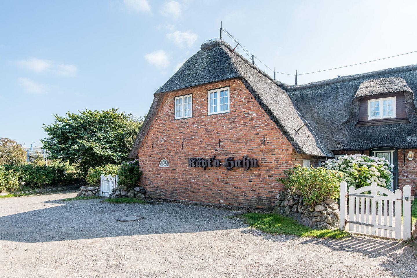 Erleben Sie friesische Behaglichkeit im charmanten 'Käpt'n Hahn' unter Reet. Diese großzügige 4-Zimmer-Ferienwohnung mit ca. 100 m² über zwei Ebenen bietet bis zu 5 Personen eine gemütliche Unterkunft im Herzen von Westerland. Umgeben von einem eingewachsenen Garten und mit einer möblierten Terrasse mit Strandkorb (April–Oktober) lädt das Haus zu entspannten Stunden an der frischen Luft ein. Hunde sind herzlich willkommen.