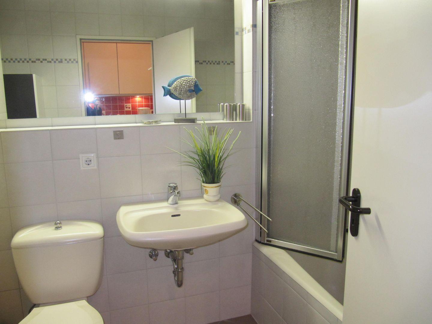 Ein weiteres Highlight der Wohnung ist das geschmackvoll gestaltete Badezimmer, das mit einer Badewanne ausgestattet ist – perfekt, um nach einem langen Tag am Strand zu entspannen. Darüber hinaus steht Ihnen ein Haartrockner zur Verfügung, sodass Sie sich auch im Urlaub rundum wohlfühlen können.
