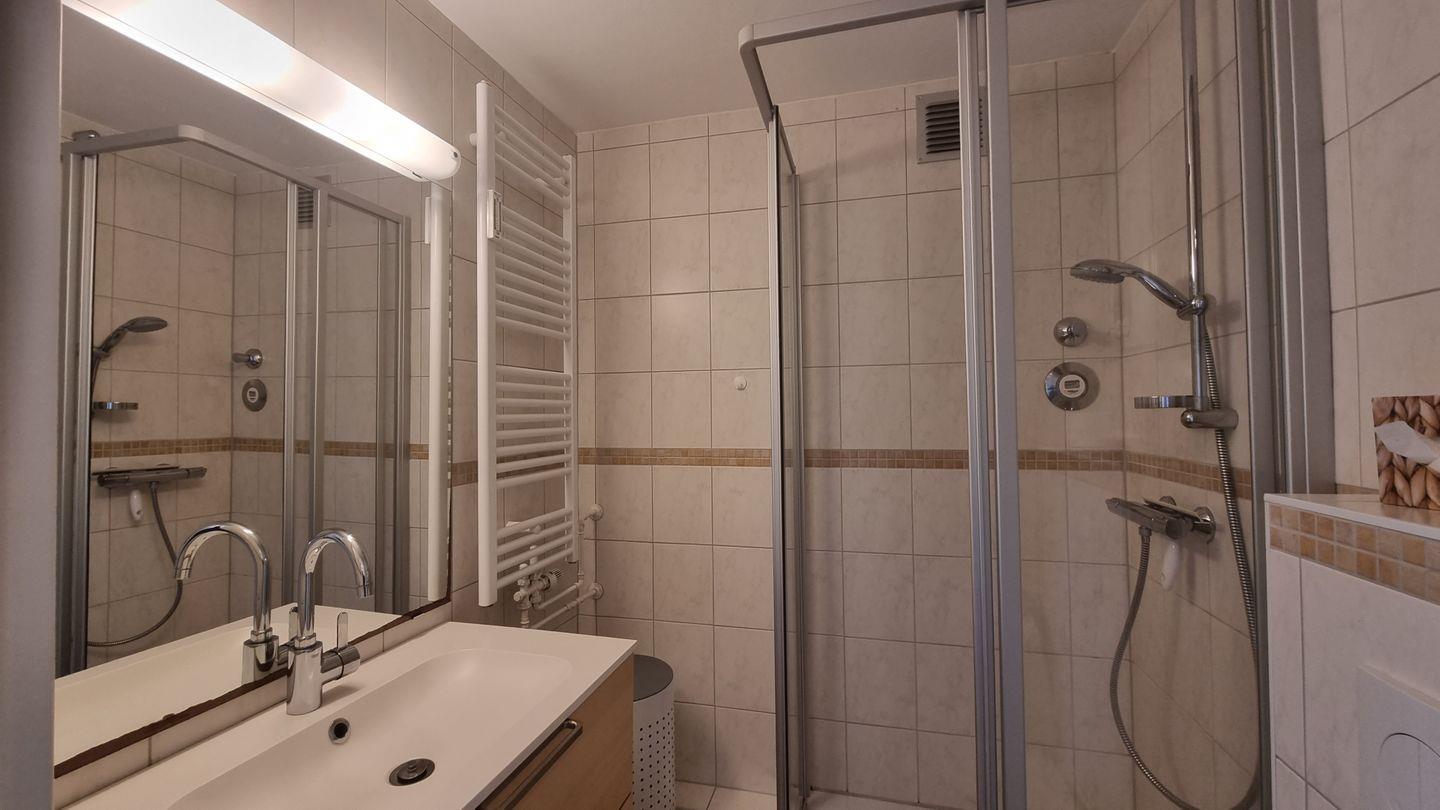Die Ferienwohnung verfügt über ein modernes Badezimmer mit einer Dusche . Ein Haartrockner, ein Kosmetikspiegel und alle nötigen Sanitäranlagen machen Ihren Aufenthalt angenehm und komfortabel. Zudem gibt es eine Garderobe für Ihre persönliche Kleidung.