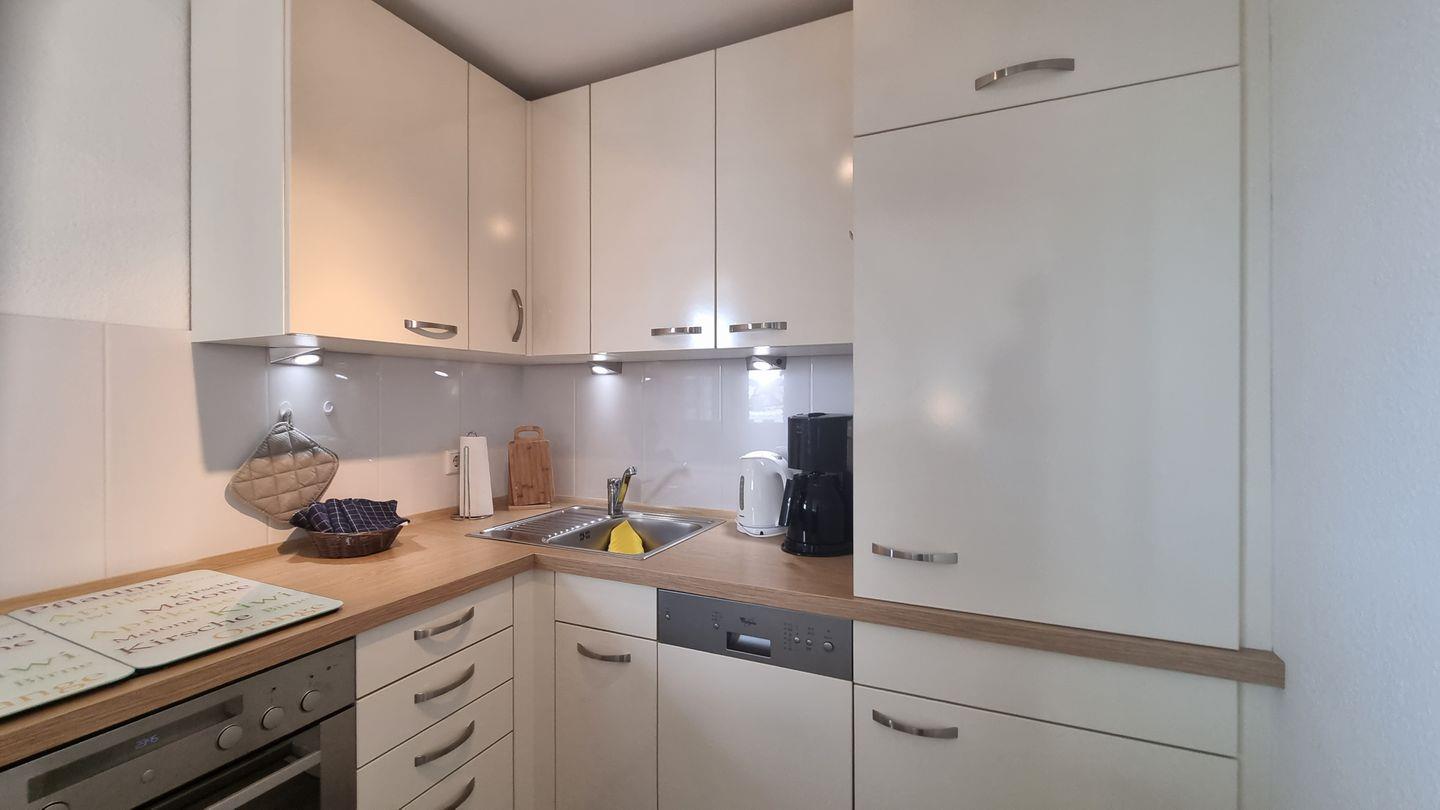 Die vollständig ausgestattete, geschlossene Küche lässt keine Wünsche offen. Egal, ob Sie die frischen Produkte des Marktes zubereiten oder einen schnellen Snack zubereiten möchten – mit Herd, Backofen, Mikrowelle, Kühlschrank, und Geschirrspüler sind Sie bestens ausgestattet. Des Weiteren stehen Ihnen Küchenutensilien, Geschirr und Besteck zur Verfügung, um Ihre Kochkünste zu entfalten.