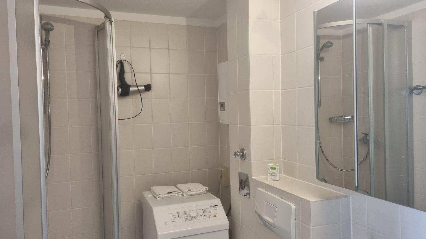 Das Badezimmer ist mit einer Dusche ausgestattet- und WC-Bereich Darüber hinaus steht Ihnen eine Waschmaschine zur Verfügung, sodass Sie auch während Ihres Aufenthalts frische Handtücher und Kleidung genießen können.