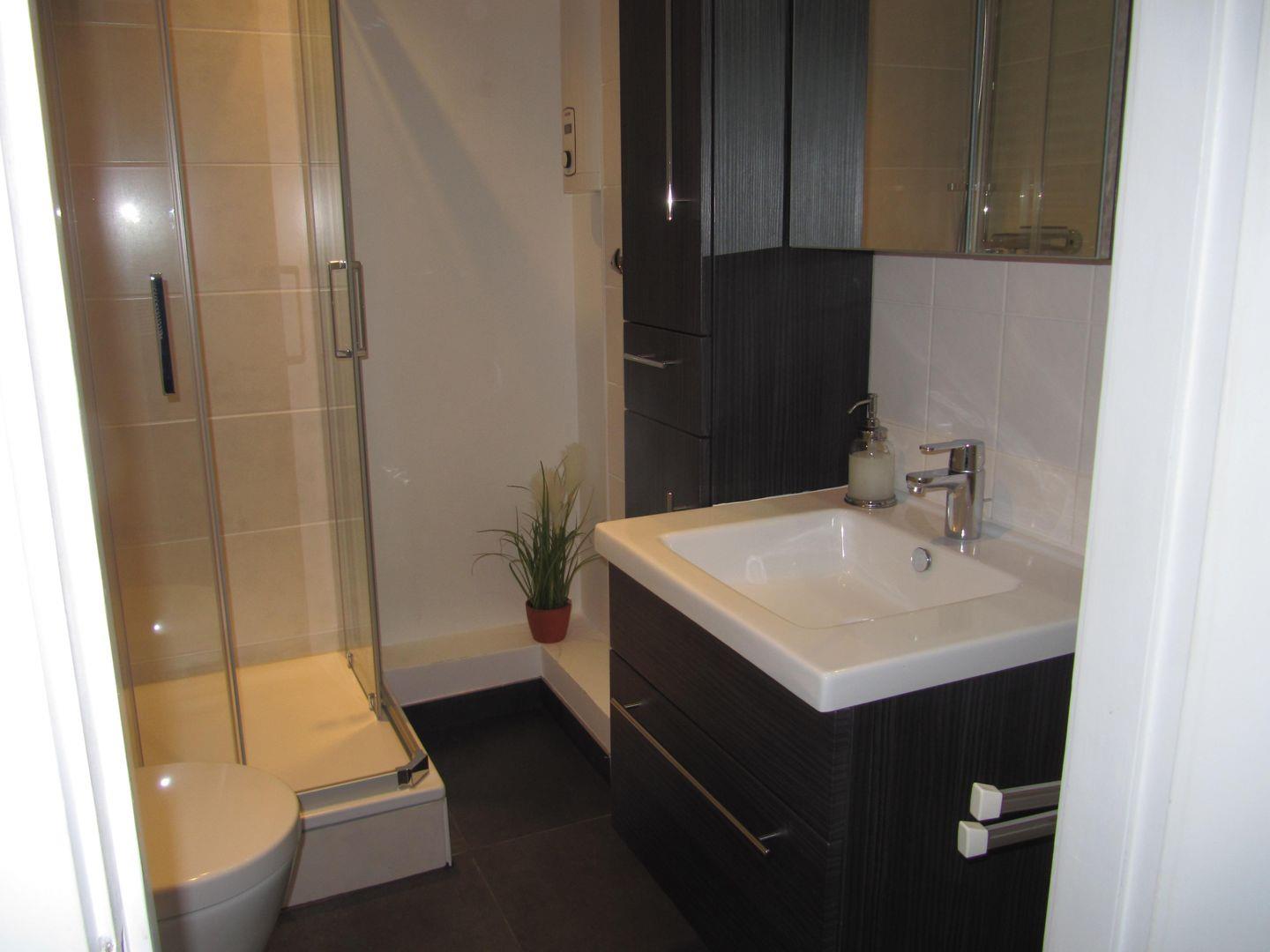 Das Badezimmer verfügt über eine Dusche, ein WC und ein Waschbecken, welches Ihnen neben einer hohen Funktionalität auch einen stilvollen Rahmen für Ihre tägliche Routine bietet. Hier befinden sich auch praktische Utensilien wie ein Haartrockner und ein Ganzkörperspiegel.