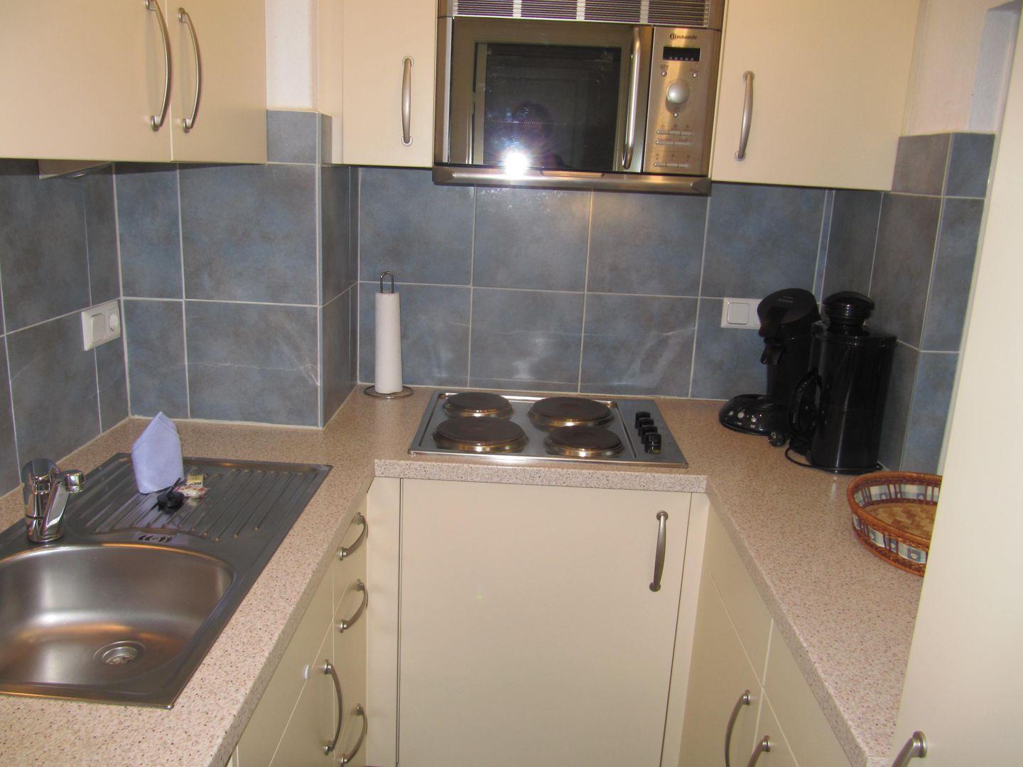 Die voll ausgestattete, geschlossene Küche bietet alles, was Sie benötigen, um Ihre kulinarischen Lieblingsgerichte zuzubereiten. Sie finden einen Herd, eine Mikrowelle, einen Kühlschrank mit Gefrierfach sowie zahlreiche Küchenutensilien vor. Ein Wasserkocher und ein Toaster ermöglichen Ihnen leckere Frühstücksvariationen, während eine Spülmaschine den Abwasch zum Kinderspiel macht.