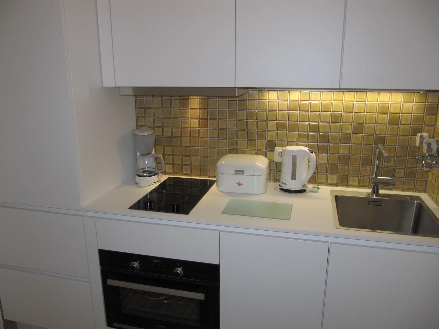 Das Herzstück der Wohnung ist der offene Wohnbereich, der mit einer modernen Küche ausgestattet ist. Bereiten Sie sich Ihre Lieblingsgerichten zu – die Küche verfügt über einen Backofen, eine Mikrowelle, einen Kühlschrank sowie eine Kaffeemaschine und einen Wasserkocher. Genießen Sie Ihre Mahlzeiten am Esstisch oder entspannen Sie auf dem gemütlichen Sofa bei einem guten Film, dank des vorhandenen Fernsehers. Ein besonderes Highlight ist der direkte Zugang zu dem Balkon, wo Sie frische Luft und den Blick ins Grüne genießen können.