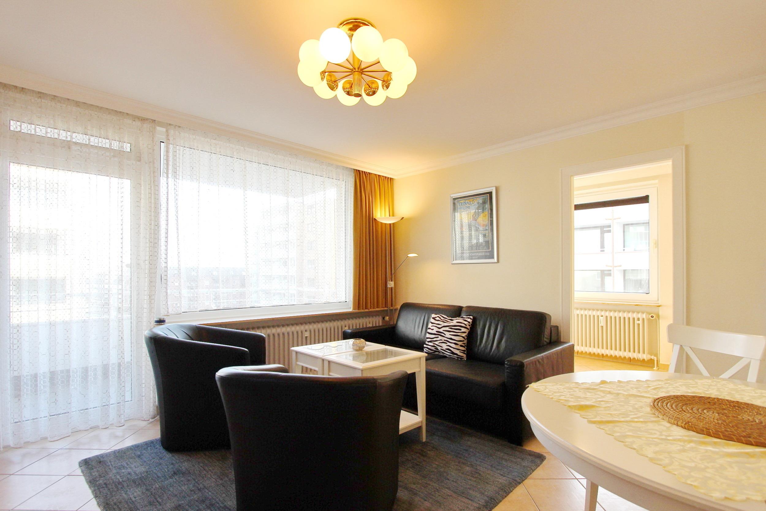 Gemütliche 2 Zimmer-Wohnung in der 2. Etage im Haus Atlantik mit vorgelagertem Nordbalkon mit Balkonmöbeln. Das hell und freundlich eingerichtete Wohnzimmer verfügt über eine Schlafcouch (140 x 200 cm), 2 Sessel und einem Essplatz mit 4 Stühlen. Die angrenzende moderne Küche ist mit Geschirrspüler, Mikrowelle und 2-Platten-Cerankochfeld ausgestattet. Im separaten Schlafzimmer befinden sich 2 Einzelbetten (100 x 200 cm und 90 x 190 cm). Das freundliche Duschbad/WC ist mit Handtuchtrockner ausgestattet. Zur technischen Ausstattung gehört weiterhin ein Flachbild-TV, ein DVD-Player und ein Radio mit CD-Player. Zur Wohnung gehört ein Außenstellplatz, welcher sich ca. 50 m vom Objekt entfernt, Steinmannstraße/Ecke Bürgermeister-Kapp-Weg, befindet - es handelt sich um den Stellplatz Nr. 10. Diese Nichtraucherwohnung hat eine Größe von ca. 34 m².