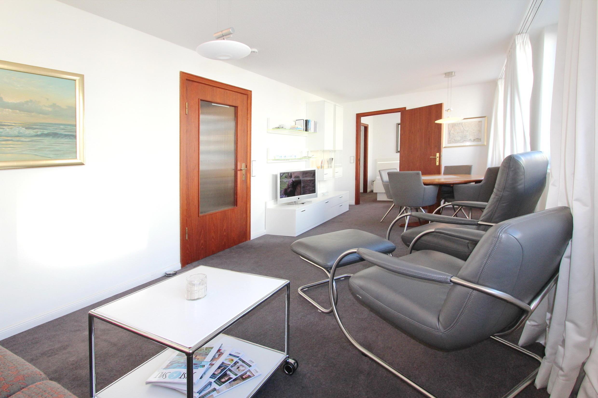 Schöne 2 Zimmer-Wohnung im Herzen von Westerland - sie befindet sich in der 5. Etage zur Westseite in einem mehrstöckigen Appartementhaus in unmittelbarer Nähe des Hauptstrandes und des Stadtzentrums. Der Wohnraum ist mit einer gemütlichen Couchgarnitur mit Schlaffunktion, 2 Swinger-Sesseln mit Hocker und einem Essplatz mit 4 Stühlen ausgestattet. Im Schlafzimmer befindet sich ein großes Doppelbett und ein begehbarer Kleiderschrank. Das angrenzende Duschbad verfügt über eine Dusche mit niedrigem Einstieg, WC und großem Waschtisch und einer Waschmaschine. In der separaten Küche finden Sie ein Ceran-Kochfeld mit 4 Platten, ein Backofen, ein Kühlschrank mit Gefrierfach und einen Geschirrspüler. Ein Hotspot im Haus ermöglicht Ihnen kabellosen und kostenfreien Zugang ins Internet (WEG-AD3 - Passwortfrei - ohne Gewähr). Nichtraucherwohnung. Wohnungsgröße ca. 40 m².