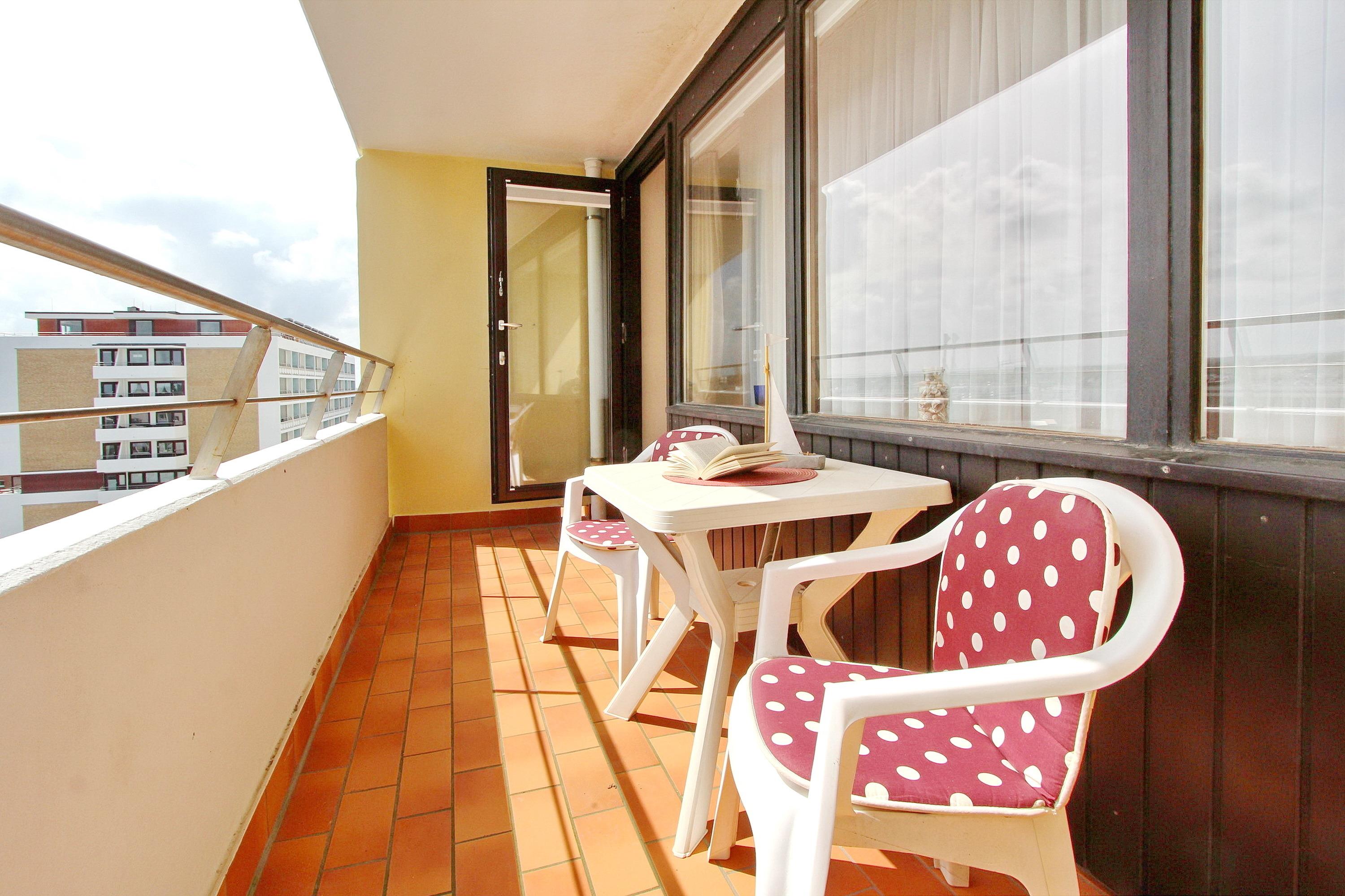 Hell und freundlich eingerichtete 2 Zimmer Wohnung in der 6. Etage im Haus Metropol mit Balkon zur Ost-und Nordseite mit Balkonmöbeln. Der Wohnraum verfügt über eine bequeme Couch, 2 Fernsehsessel, ein Einzelschrankbett und einen Essplatz mit Eckbank und 2 Stühlen. Vom Essbereich haben sie einen Zugang zum Nordbalkon mit seitlichem Blick auf die Nordsee. Der Wohn-Essbereich ist gefliest. Die separate Küche mit Cerankochfeld, zusätzlicher Tassimomaschine und Backofen mit Mikrowelle hat eine große Durchreiche zum Essplatz. Im Schlafzimmer mit Teppichboden steht ein Doppelbett und ein Kleiderschrank mit reichlich Stauraum. Dieses Zimmer hat ebenfalls einen eigenen Balkon zur Ostseite und einen Zugang zum Badezimmer. Das neu renovierte Badezimmer besticht durch seine Größe und die ebenerdige Dusche mit Sitzbank, die somit besonders für Gäste mit Handicap geeignet ist. Zur technischen Ausstattung gehört: ein Flachbildfernseher sowie ein freies WLAN Netzwerk (WEG Haus Metropol - Passwortfrei - ohne Gewähr) steht ihnen kostenfrei zur Verfügung. Diese Nichtraucherwohnung hat eine Größe von ca. 70 m².