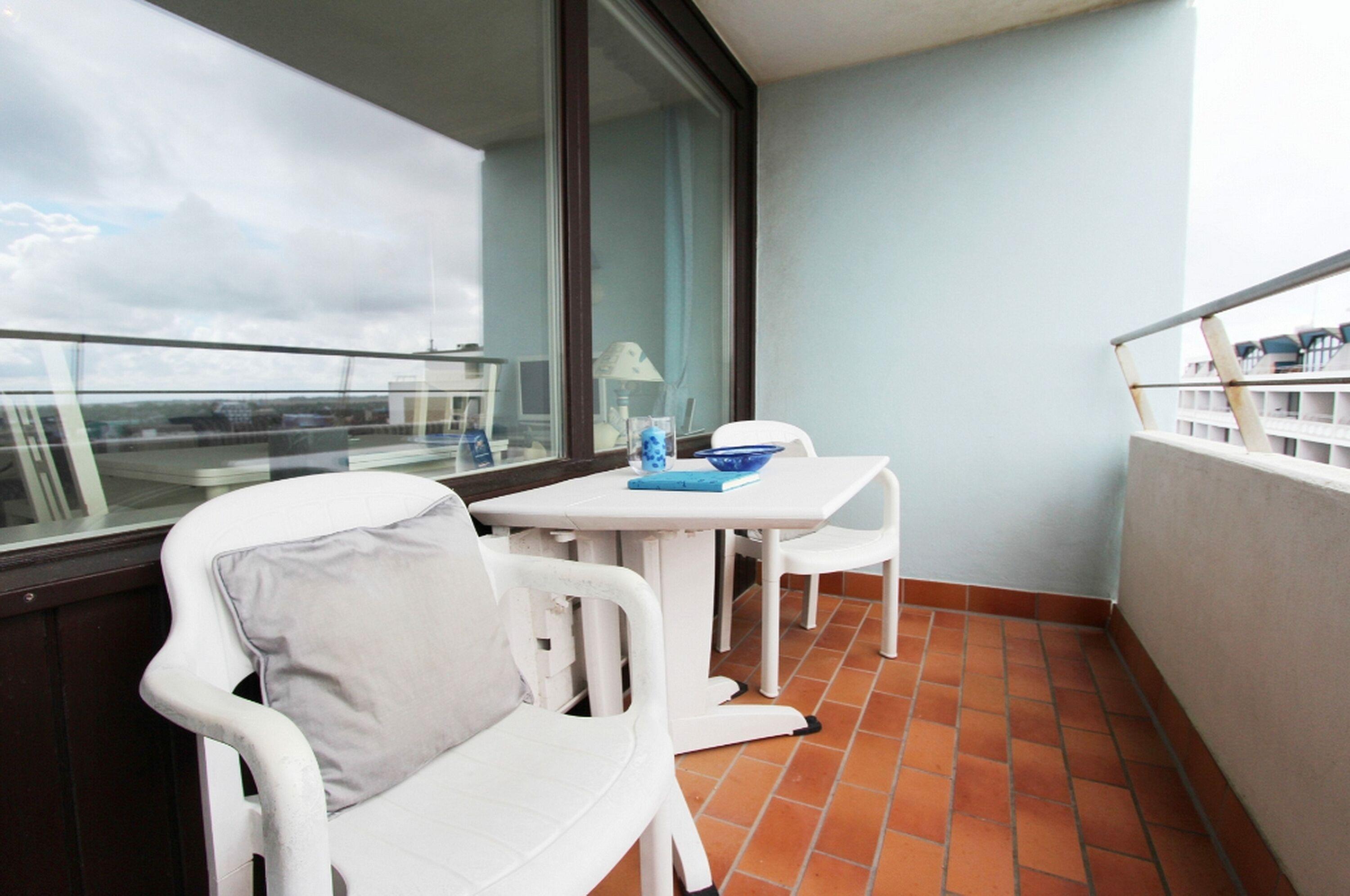 Hübsche Einzimmerwohnung in der 8. Etage im Haus Metropol zur Landseite mit herrlichem Weitblick über die Insel und die Stadt. Bei klarem Wetter auf das nordfriesische Wattenmeer bis zum Festland. Der kombinierte Wohn-/Schlafraum mit vorgelagertem großen Ostbalkon verfügt über Einzelschrankbetten, einen Essplatz mit 2 Stühlen am Fenster sowie eine Sitzgruppe. Holzfußboden verleiht dem Raum Gemütlichkeit. Das moderne Badezimmer hat eine Dusche. Im Flur befindet sich eine Einbauküche mit Backofen in der sich sie sich bequem selbst verpflegen können. Zur technischen Ausstattung gehört: ein Flachbildfernseher mit integriertem DVD Player, Radio mit IPod Station, Telefon. Ein freies WLAN Netzwerk (WEG Haus Metropol - Passwortfrei - ohne Gewähr) steht ihnen kostenfrei zur Verfügung. Wohnungsgröße 30 m².