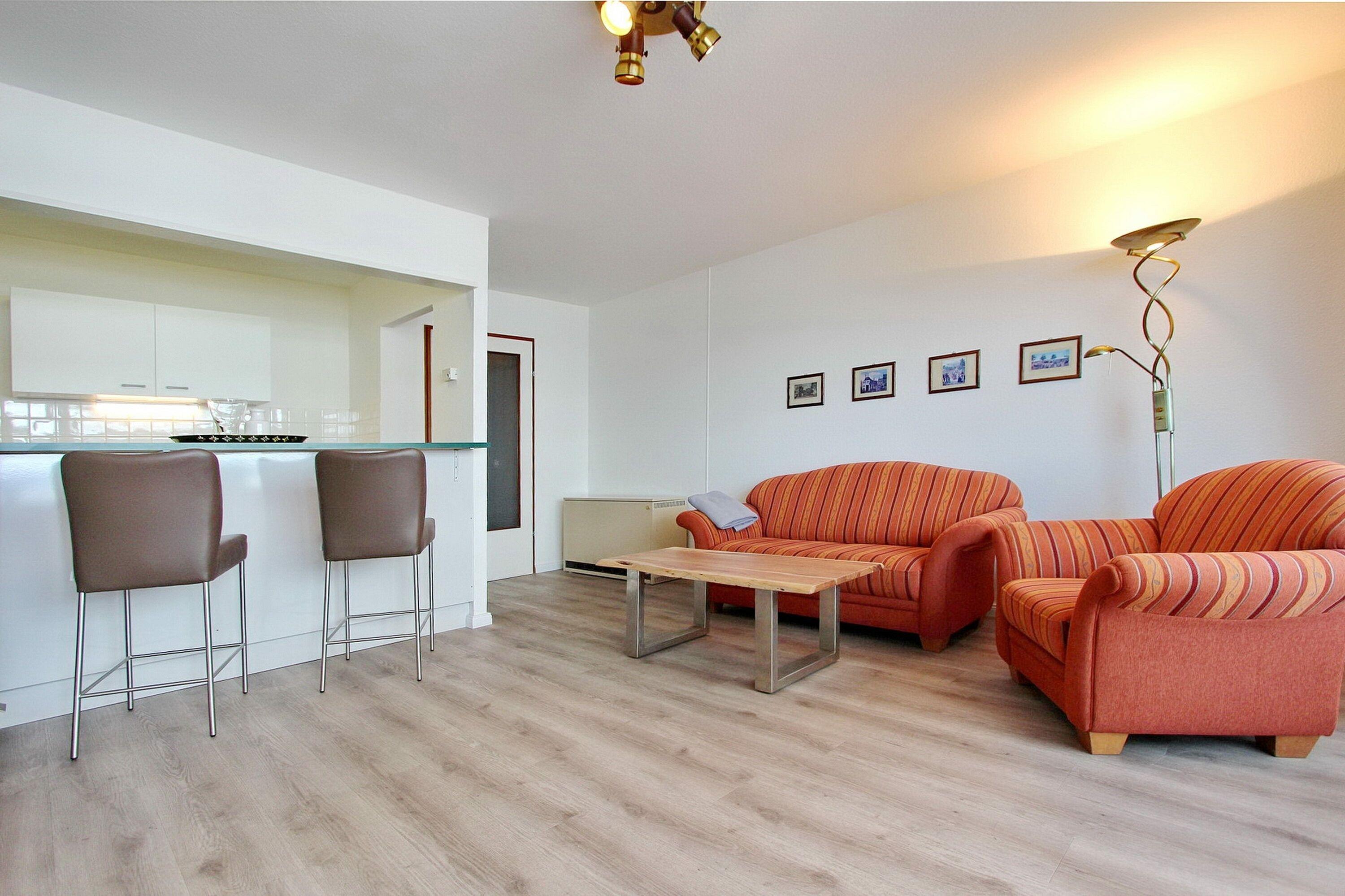 Das 1-Zimmer-Appartement befindet sich in der 3. Etage des Hauses Westerhörn und ist nur wenige Schritte vom Strand und Meer entfernt. Der Wohn- und Schlafraum ist hell und verfügt über bodentiefe Fenster sowie einen vorgelagerten Westbalkon mit vorhandenen Balkonmöbeln. Die Einrichtung umfasst Einzelschrankbetten, eine Sitzgruppe und zwei Stühle. Eine offene Küchenbar mit Backofen und Esstresen, an dem Lederbarhocker stehen, ermöglicht das Einnehmen von Mahlzeiten. Der Fußboden wurde in Holzdielenoptik gestaltet, was eine hygienische Reinigung gewährleistet. Im Badezimmer befinden sich eine Badewanne mit Duschvorhang sowie ein Fenster zur direkten Belüftung. Zur technischen Ausstattung gehören ein moderner Flachbildfernseher von Panasonic und ein Radio. Die Größe des Appartements beträgt ca. 35 m².
