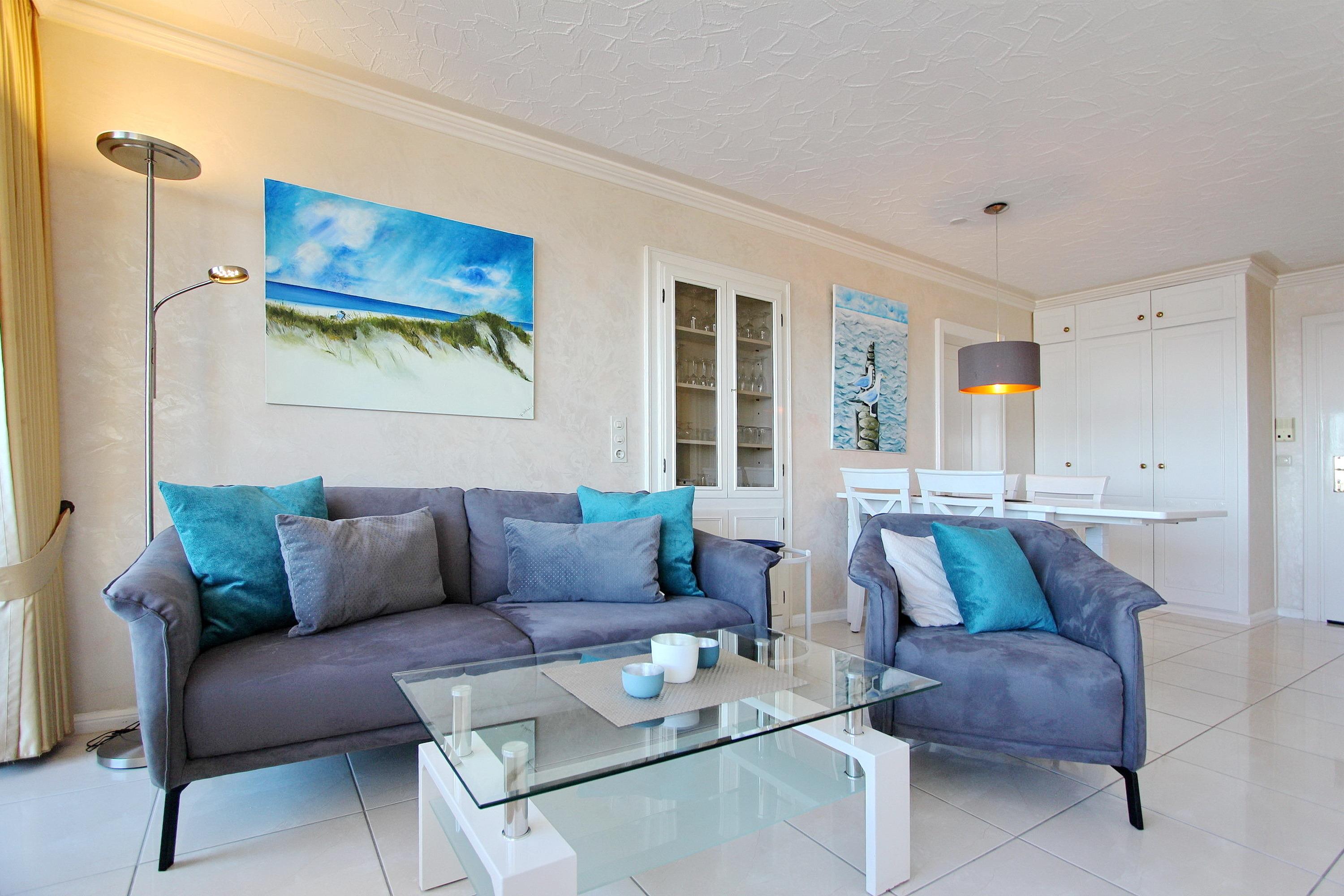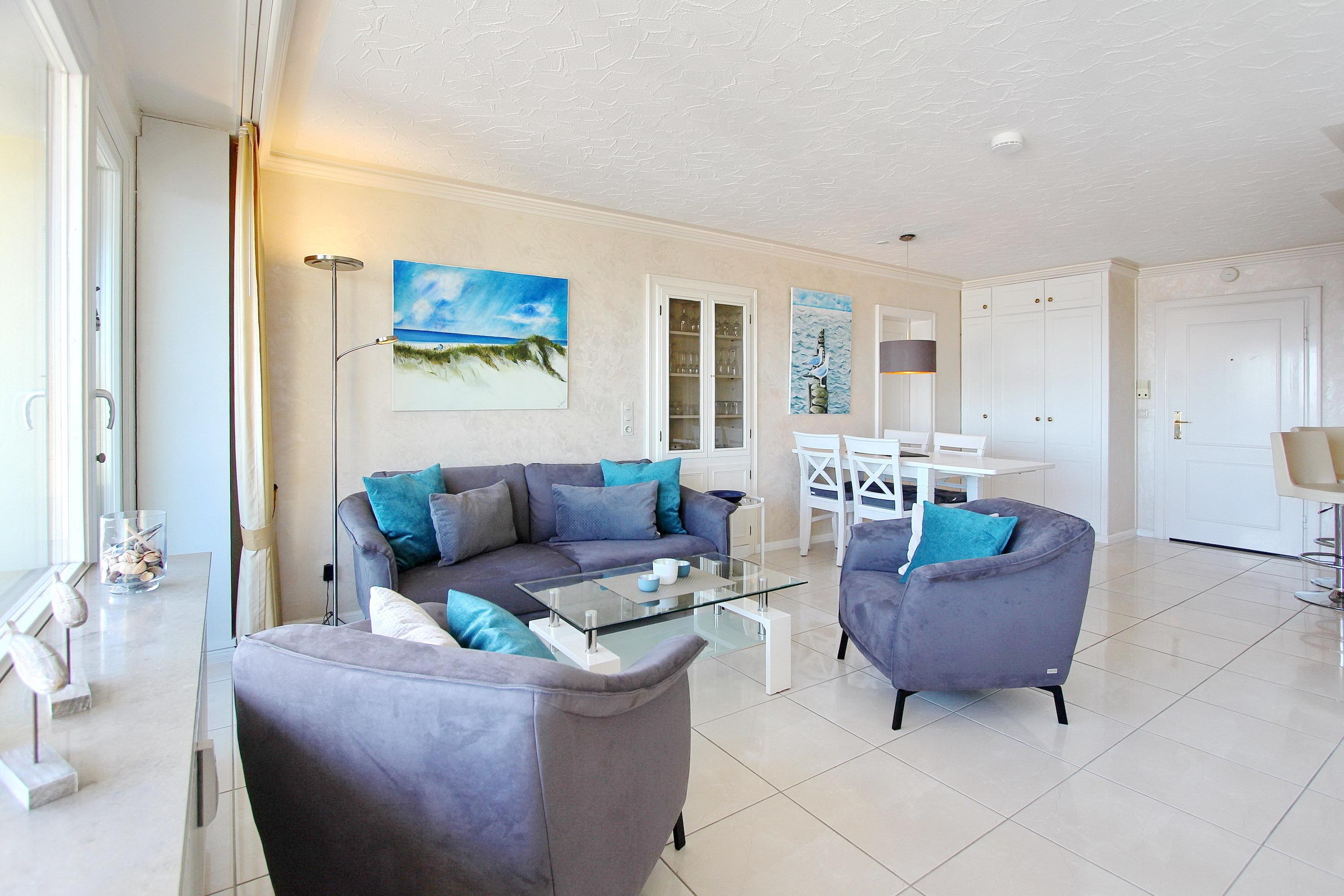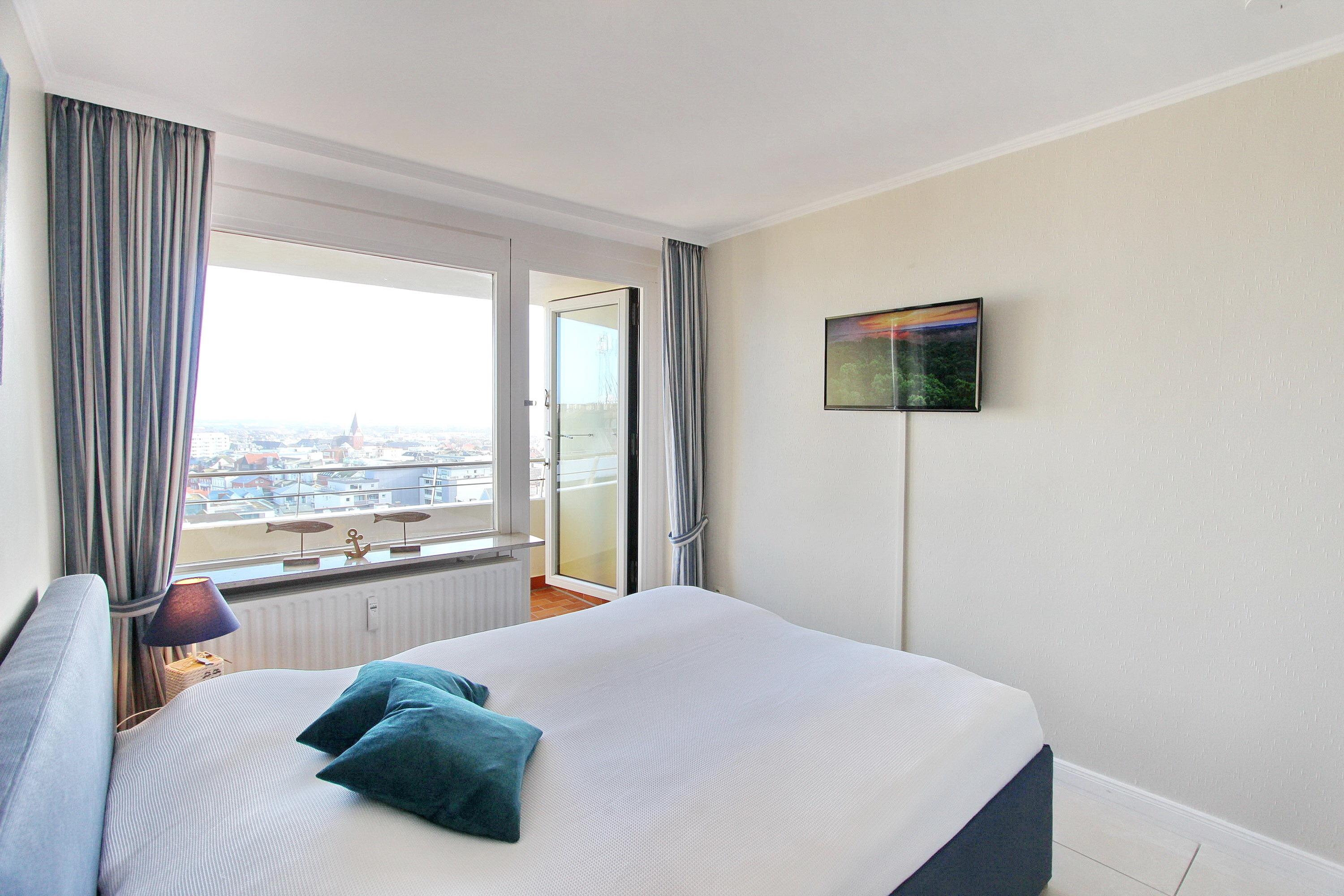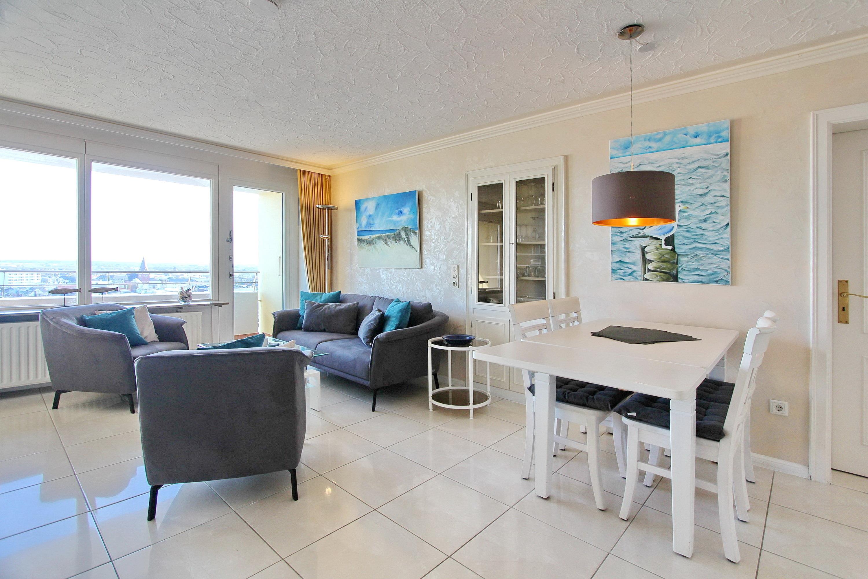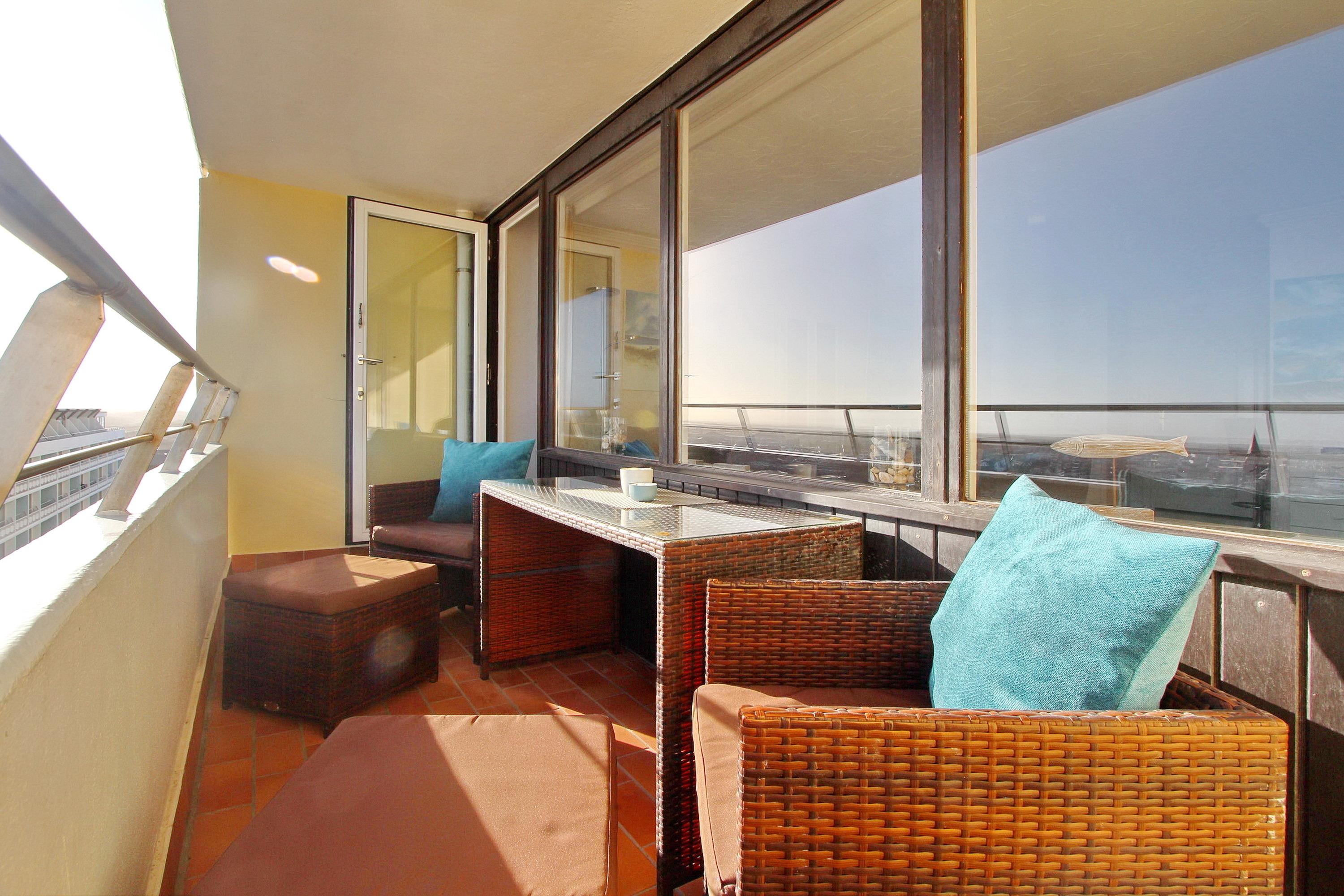 Mit viel Liebe zum Detail eingerichtete 2 Zimmer Wohnung in der 9. Etage im Haus Metropol, mit einem herrlichen Weitblick über die Insel und die Stadt. Vom großen Ostbalkon, mit neuen Rattan Loungemöbeln, aus können sie bei gutem Wetter bis aufs Festland schauen. Das lichtdurchflutete Wohnzimmer hat eine bequeme Sitzgruppe, bestehend aus einem Sofa und 2 Sesseln, sowie einen Essplatz mit 4 Stühlen und ein Doppelschrankbett als weitere Schlafgelegenheit. Das separate Schlafzimmer, ausgestattet mit Doppelbett, modernem Smart TV und Kleiderschrank, hat einen eigenen Ostbalkon. Die offene Küche mit Backofen, Ceranfeld, Mikrowelle und zusätzlicher Nespressomaschine hat eine Durchreiche zum Wohnbereich, der auch als Esstresen genutzt werden kann. Das helle und moderne Badezimmer hat eine Badewanne und eine Dusche. Zur technischen Ausstattung der Wohnung gehören: zwei Flachbildfernseher, ein Blueray Player, eine Stereoanlage mit CD-Player, USB-Anschluß und Bluetooth und ein Radio. Ein freies WLAN Netzwerk (WEG Haus Metropol - Passwortfrei - ohne Gewähr) steht ihnen kostenfrei zur Verfügung. Diese Nichtraucherwohnung hat eine Größe von ca. 60 m².