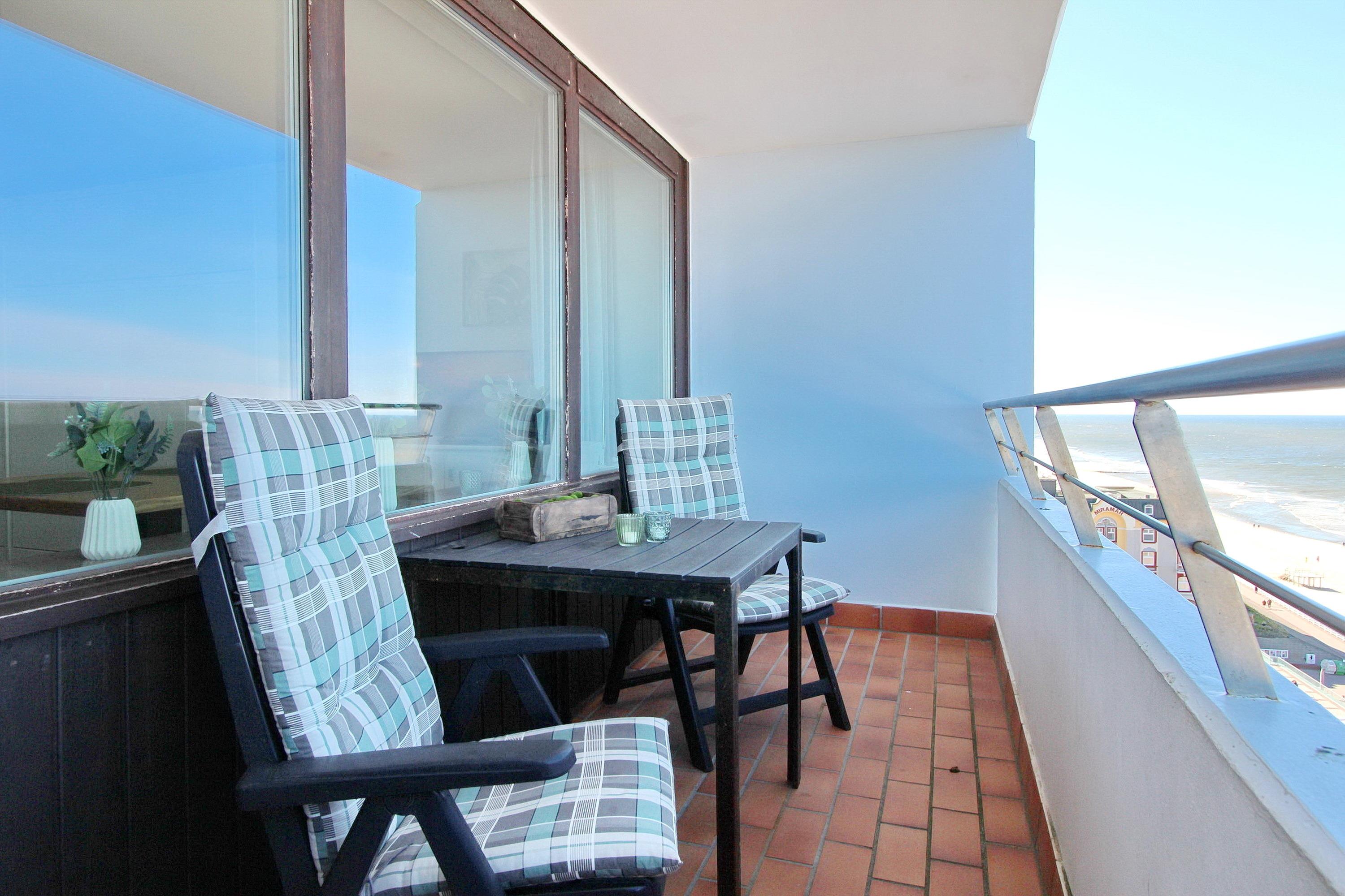 Das geräumige Appartement für bis zu 2 Personen in der 10. Etage im Haus Metropol hat eine Wohnungsgröße von ca. 42 m². Das wirklich Schöne an dieser Wohnung ist der herrliche Panoramablick über die Nordsee und den weißen Strand von Westerland. Der kombinierte Wohn-/Schlafraum hat einen Westbalkon mit Balkonmöbeln und Auflagen und verfügt über Einzelschrankbetten, einen Essplatz mit 2 Stühlen am Fenster, ein neues 3-Sitzer Sofa und einen elektrisch verstellbaren Relaxsessel für die Entspannung. Das Badezimmer mit Dusche hat einen beheizten Handtuchtrockner, der Flur eine zusätzliche Garderobennische. In der separaten Küche mit Backofen können Sie sich selbst verpflegen. Zur technischen Ausstattung gehört: ein 32 Zoll Flachbildfernseher und ein Radio. Ein freies WLAN Netzwerk (WEG Haus Metropol - Passwortfrei - ohne Gewähr) steht ihnen kostenfrei zur Verfügung.
