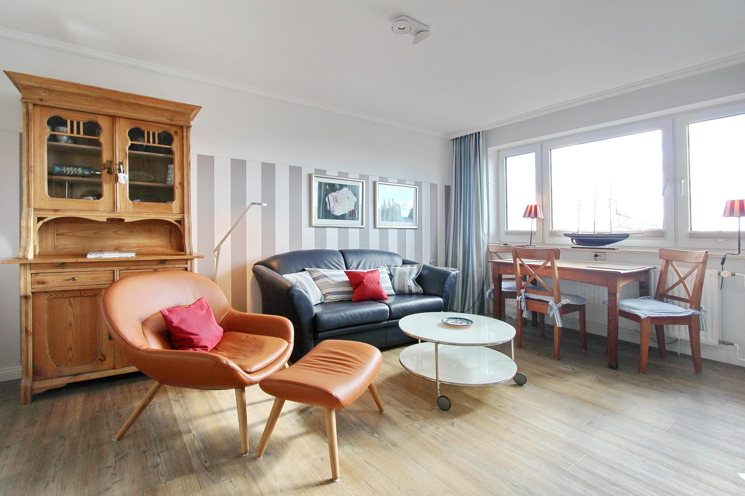 Liebevoll, hell und freundlich, eingerichtete 1 Zimmer Wohnung in der 4. Etage in unmittelbarer Nähe zum Strand und der Westerländer Promenade. Der kombinierte Wohn-Schlafraum verfügt über ein neues Boxspringbett mit höchstem Schlaf-sowie Ein-und Ausstiegskomfort, einen Essplatz am Fenster mit 3 Stühlen und eine Ledercouch und Sessel für gemütliche Fernseh- oder Leseabende. Im Einbaukleiderschrank haben Sie ausreichend Platz für Ihre persönlichen Dinge. Die offene Einbauküche mit Fenster ist mit einer Mikrowelle, einem Ceranfeld, einer zusätzliche Nespressomaschine und einem Geschirrspüler ausgestattet. Selbstverpfleger können sich hier ein köstliches Frühstück oder kleine Mahlzeiten zubereiten. Der Holzlaminatboden gibt dem Raum Wärme und Gemütlichkeit. Das großzügige Badezimmer verfügt über eine Dusche und ein Bidet. Zu ihrer Unterhaltung steht ihnen ein Smart-Flachbildfernseher, ein DVD Player, eine Stereoanlage mit Bluetooth und Kopfhörer, sowie eine umfangreiche Auswahl an DVDs, Büchern und Spielen zur Verfügung. Ein Hotspot im Haus ermöglicht ihnen kabellosen und kostenlosen Zugang ins Internet (WEG-AD3 - Passwortfrei - ohne Gewähr). Diese Wohnung ist eine Nichtraucherwohnung. Haustiere sind ausdrücklich willkommen. Wohnungsgröße: ca. 35 m².