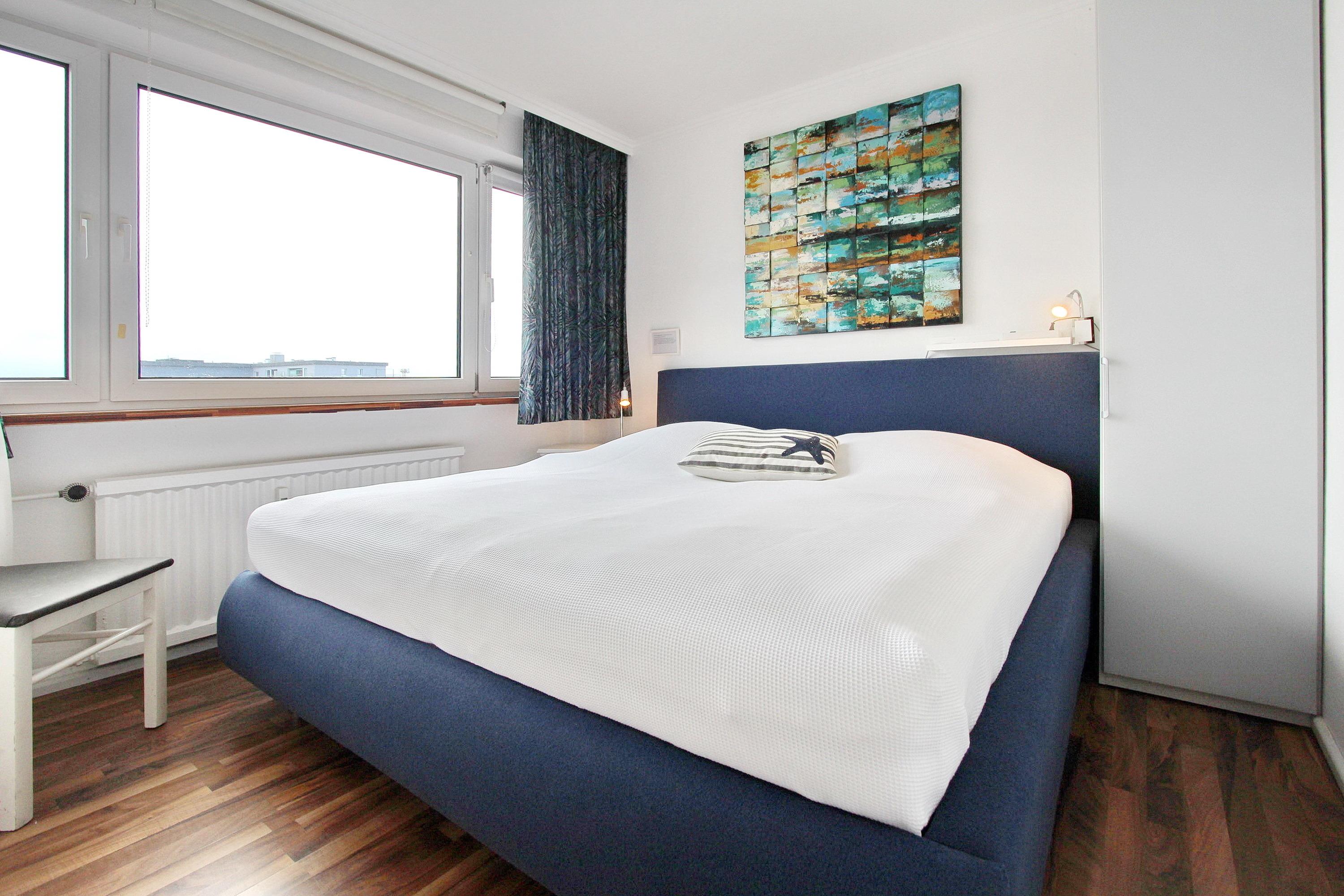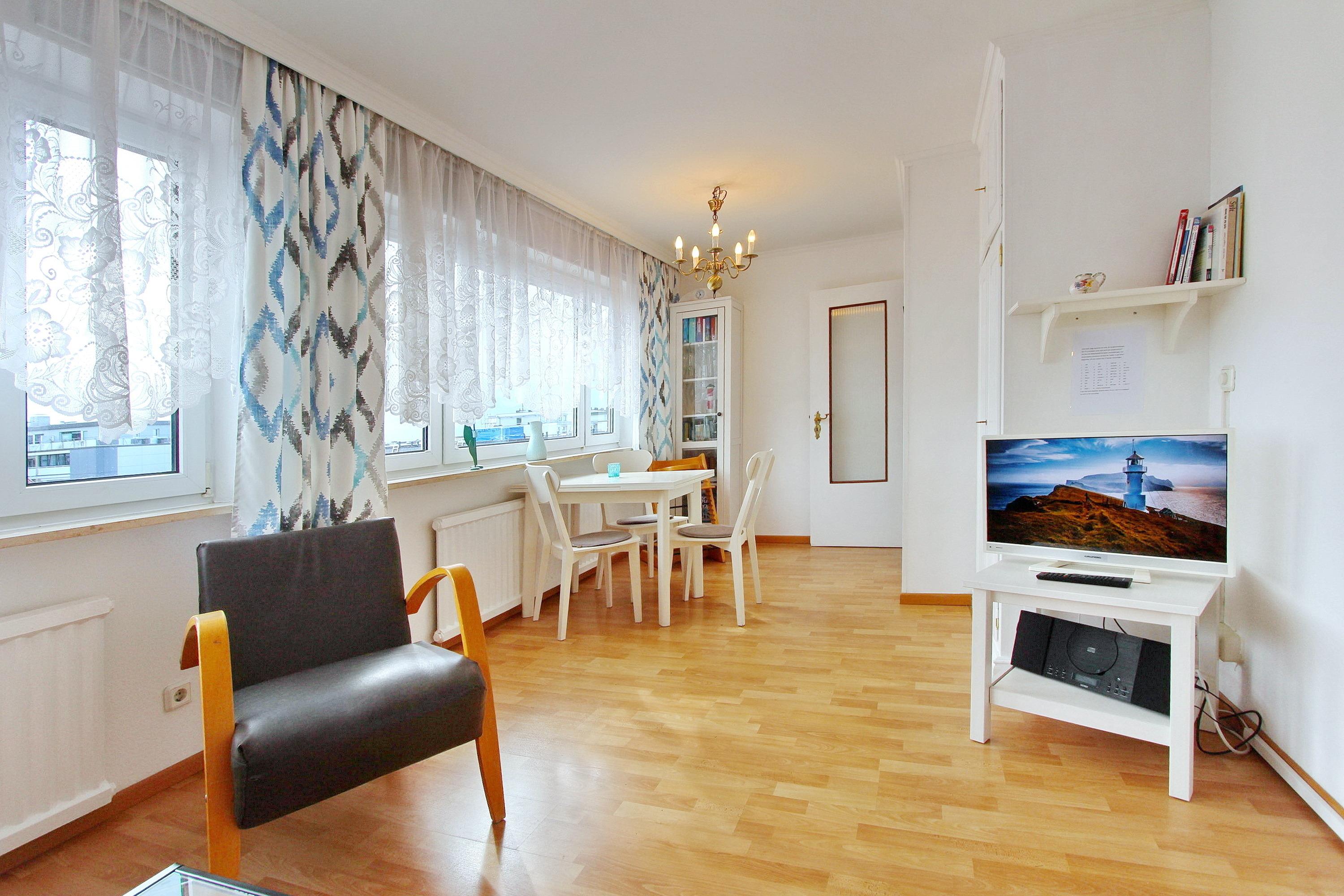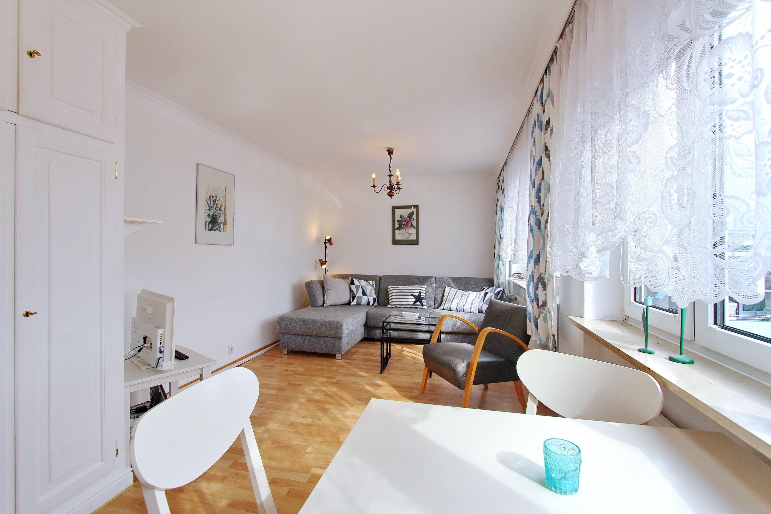 Gemütliche 2 Zimmer Wohnung in der 4. Etage in zentraler Stadtlage. Im Wohnzimmer gibt es einen Essplatz mit 4 Stühlen, eine Couch mit Schlaffunktion und einen Sessel. Das separate Schlafzimmer verfügt über ein Doppelbett, einen Kleiderschrank und Laminatboden. Das Badezimmer hat eine Dusche und in der Küche gibt es einen Backofen, ein Ceranfeld, einen Geschirrspüler und eine Mikrowelle. Die Küche ist so ausgestattet, dass Sie sich selbst verpflegen können. Zur technischen Ausstattung gehört: ein Flachbildfernseher und ein Radio mit CD Player. Ein Hotspot im Haus ermöglicht ihnen einen kabellosen und kostenlosen Zugang ins Internet (WEG-AD3 - Passwortfrei - ohne Gewähr). Diverses Strandspielzeug für Kinder ist vorhanden, sowie ein Hochstuhl. Diese Nichtraucherwohnung hat eine Größe von ca. 42 m².