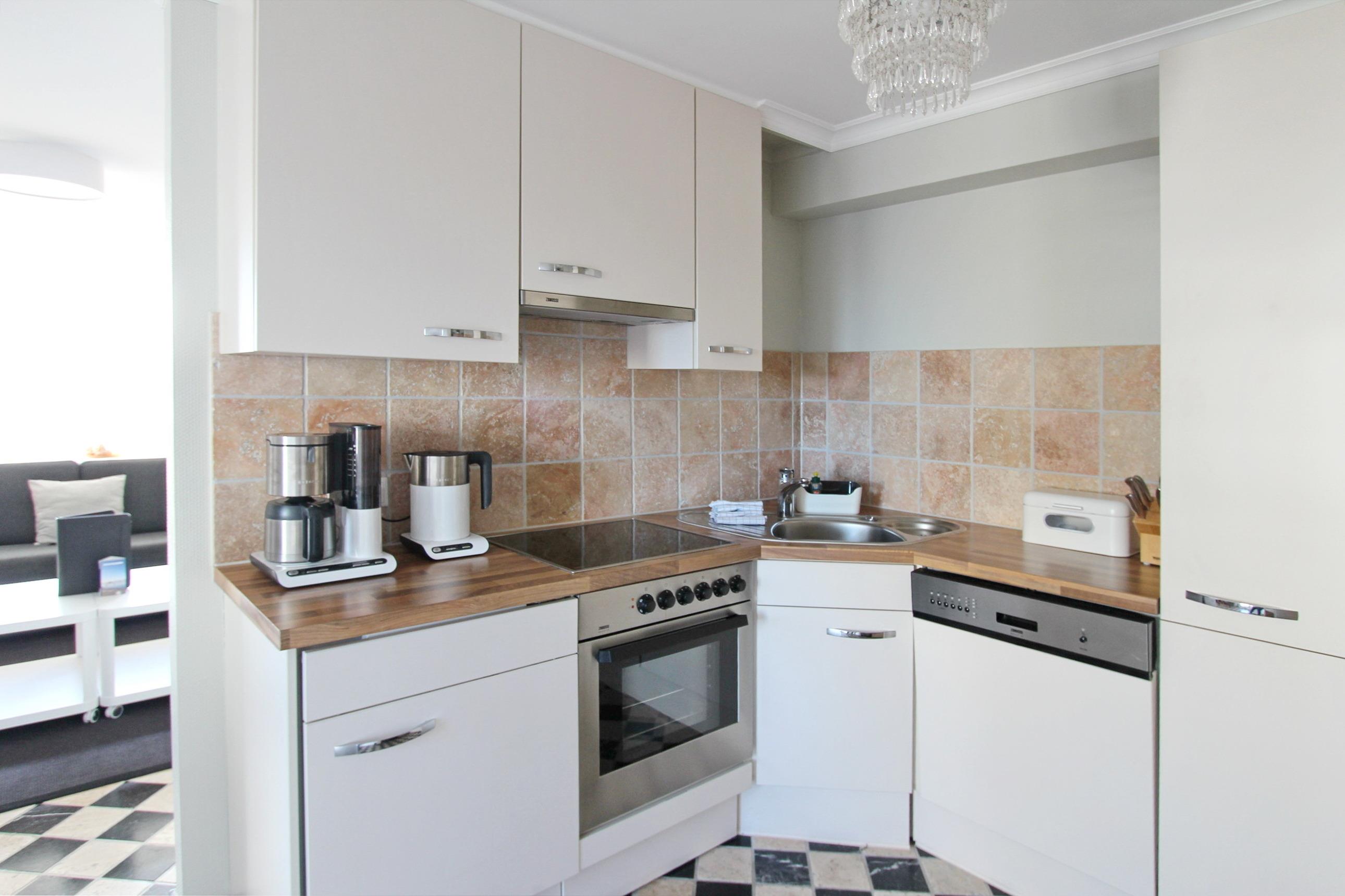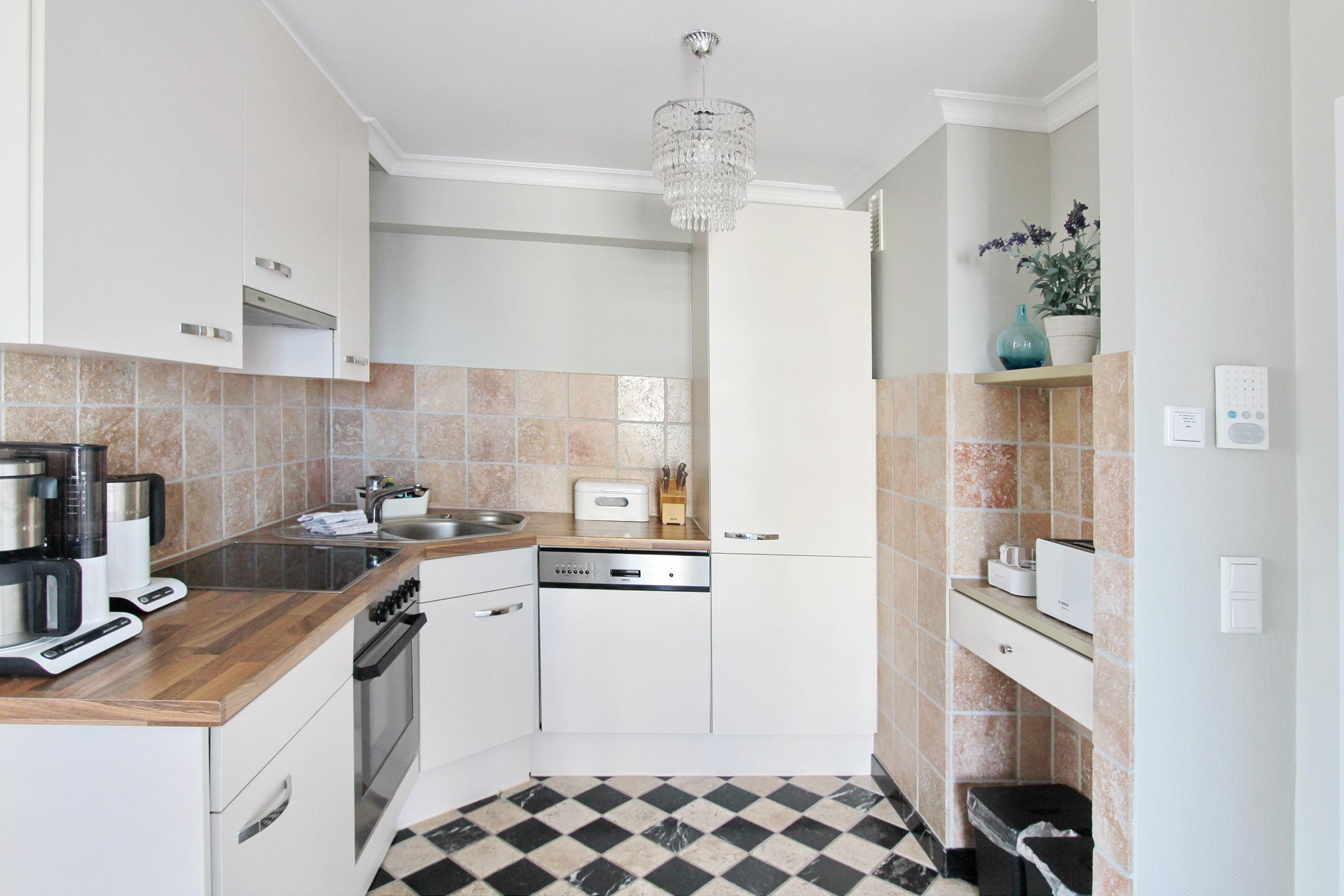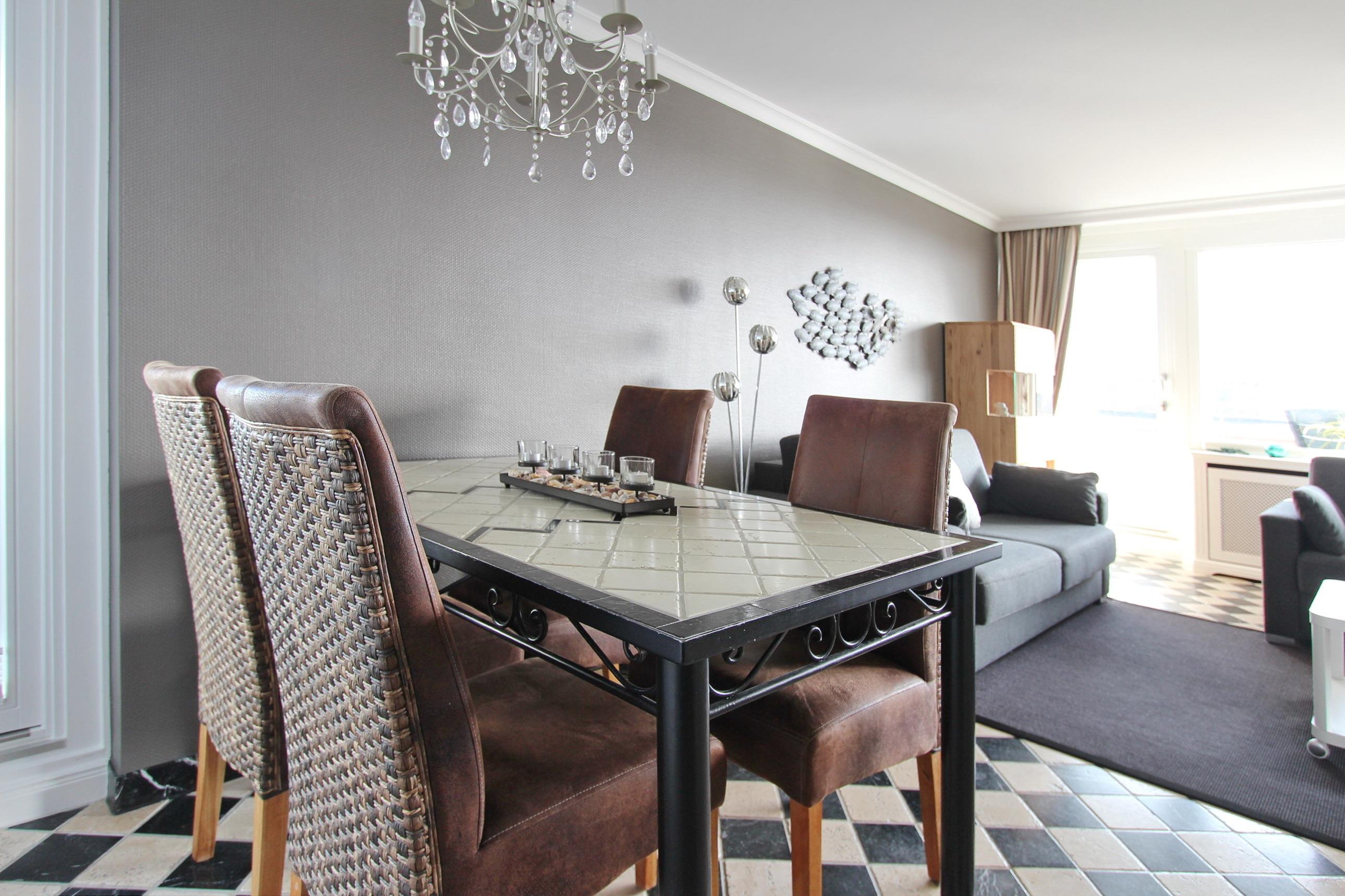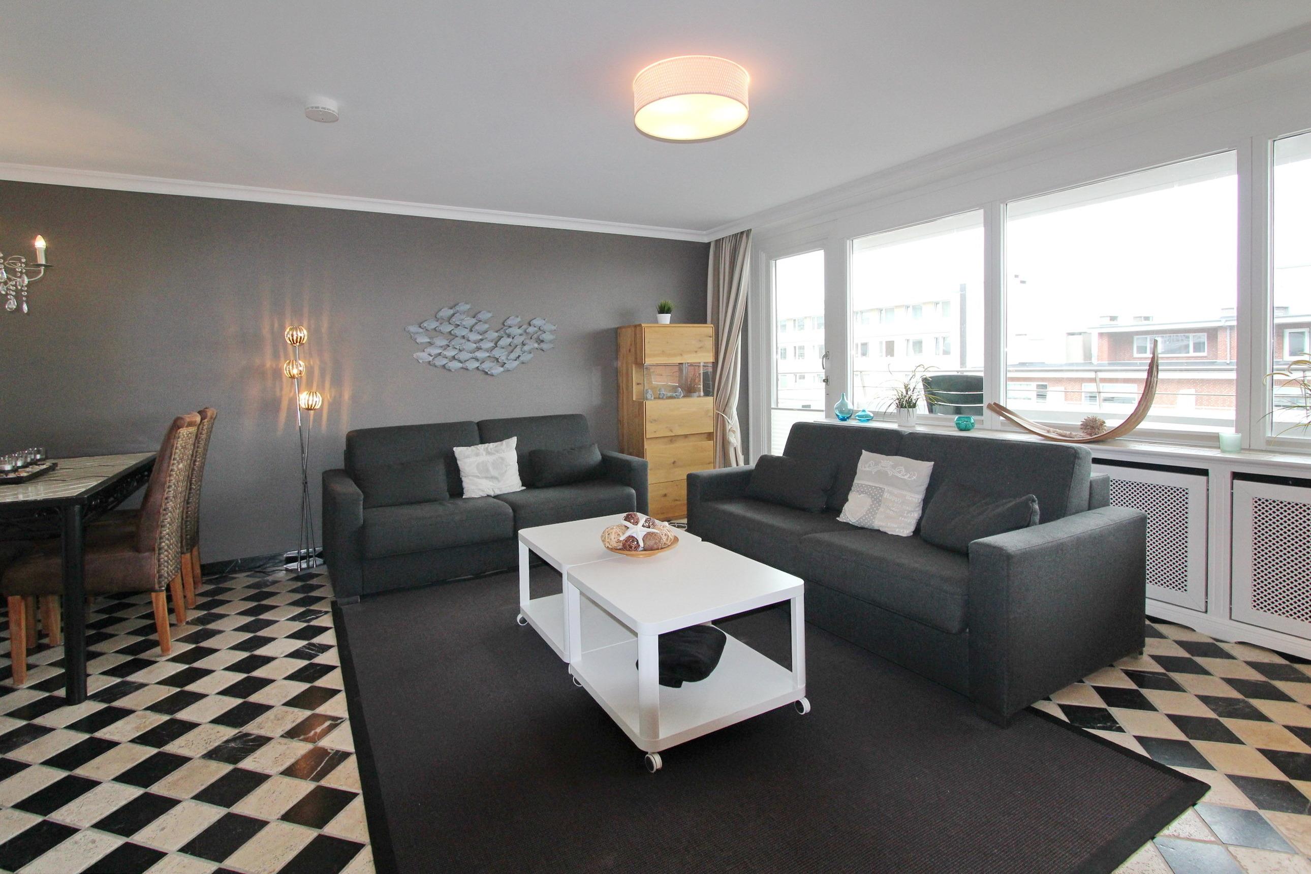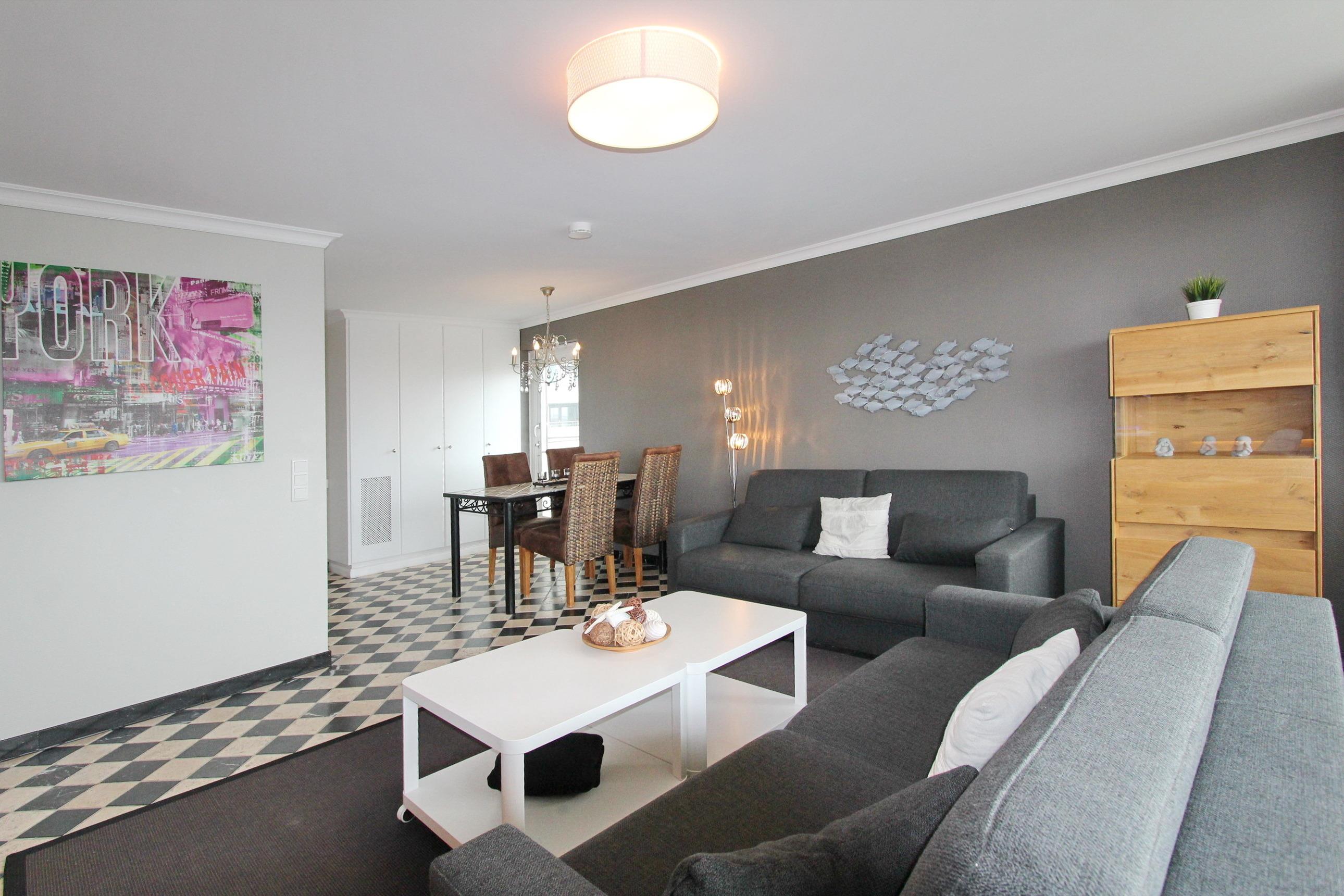 Mit viel Liebe zum Detail eingerichtete 2 Zimmer Wohnung in der 3. Etage im Haus am Meer. Bis zu 4 Personen finden hier ein absolutes Wohlfühldomizil vor. Das Wohnzimmer mit großem Ostbalkon hat 2 bequeme Couchen mit Schlaffunktion, eine Schrankwand mit viel Stauraum und einem großen Flachbildfernseher. Zur offenen Küche hin steht ein Essplatz mit 4 Stühlen. Die Küche ist mit Geschirrspüler, Ceranfeld und Backofen ausgestattet und ist mit hochwertigen Küchenutensilien eingerichtet. In der ganzen Wohnung wurden Natursteinfliesen in schwarz/weiss verlegt. Das Schlafzimmer mit Doppelbett, begehbarem Kleiderschrank und zusätzlichem Flachbildfernseher, hat einen eigenen Zugang zum Ostbalkon auf dem Sie die Morgensonne genießen können. Das großzügige Badezimmer besticht durch seine hochwertige Ausstattung und die große Dusche. In dieser Nichtraucherwohnung gehören zur technischen Ausstattung: zwei Flachbildfernseher, ein CD Player mit Radio und eine IPod Station. Ein WLAN Zugang (WEG Haus am Meer - Passwortfrei - ohne Gewähr) können Sie ebenfalls kostenlos nutzen. Wohnungsgröße dieser Nichtraucherwohnung: ca. 60 m².