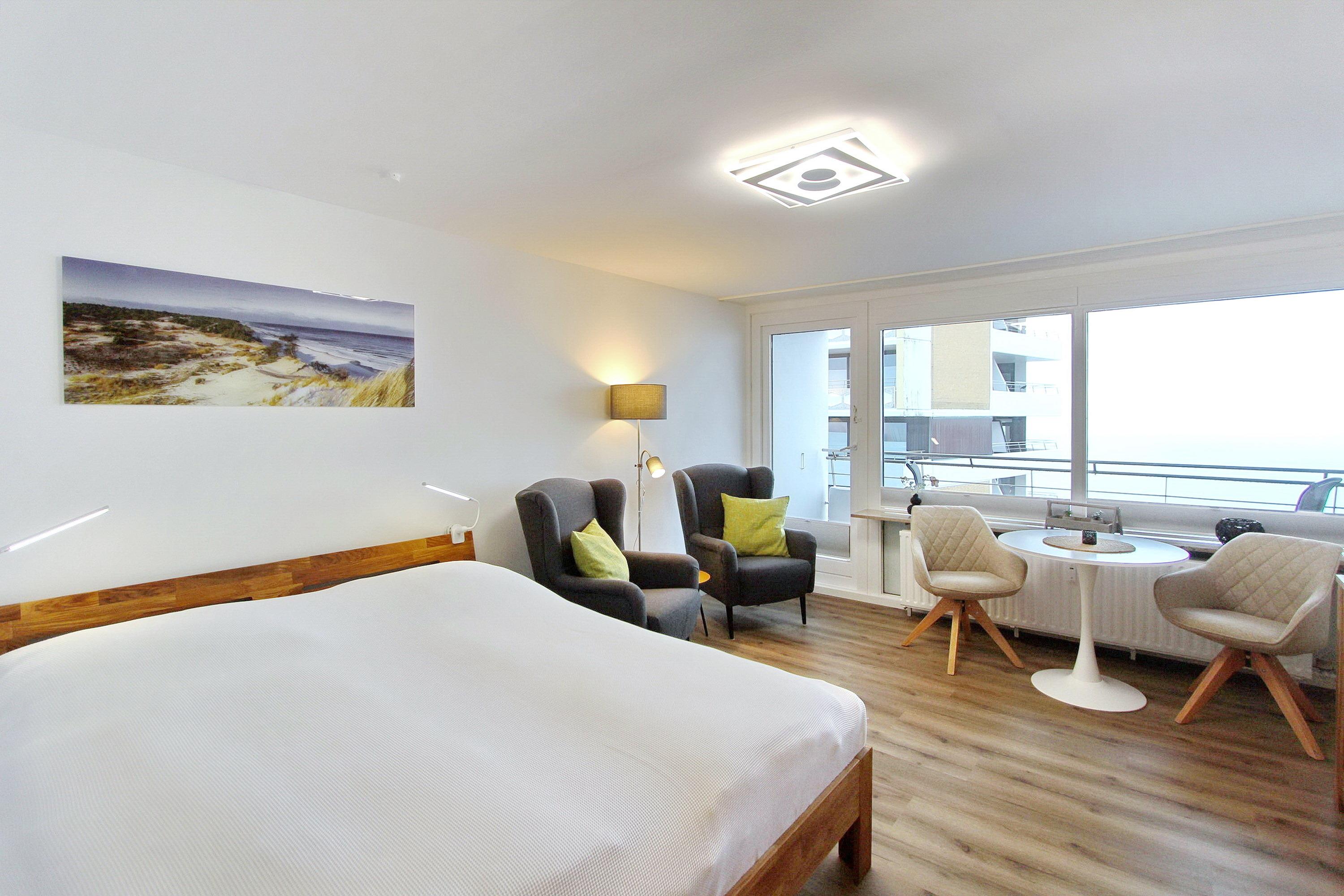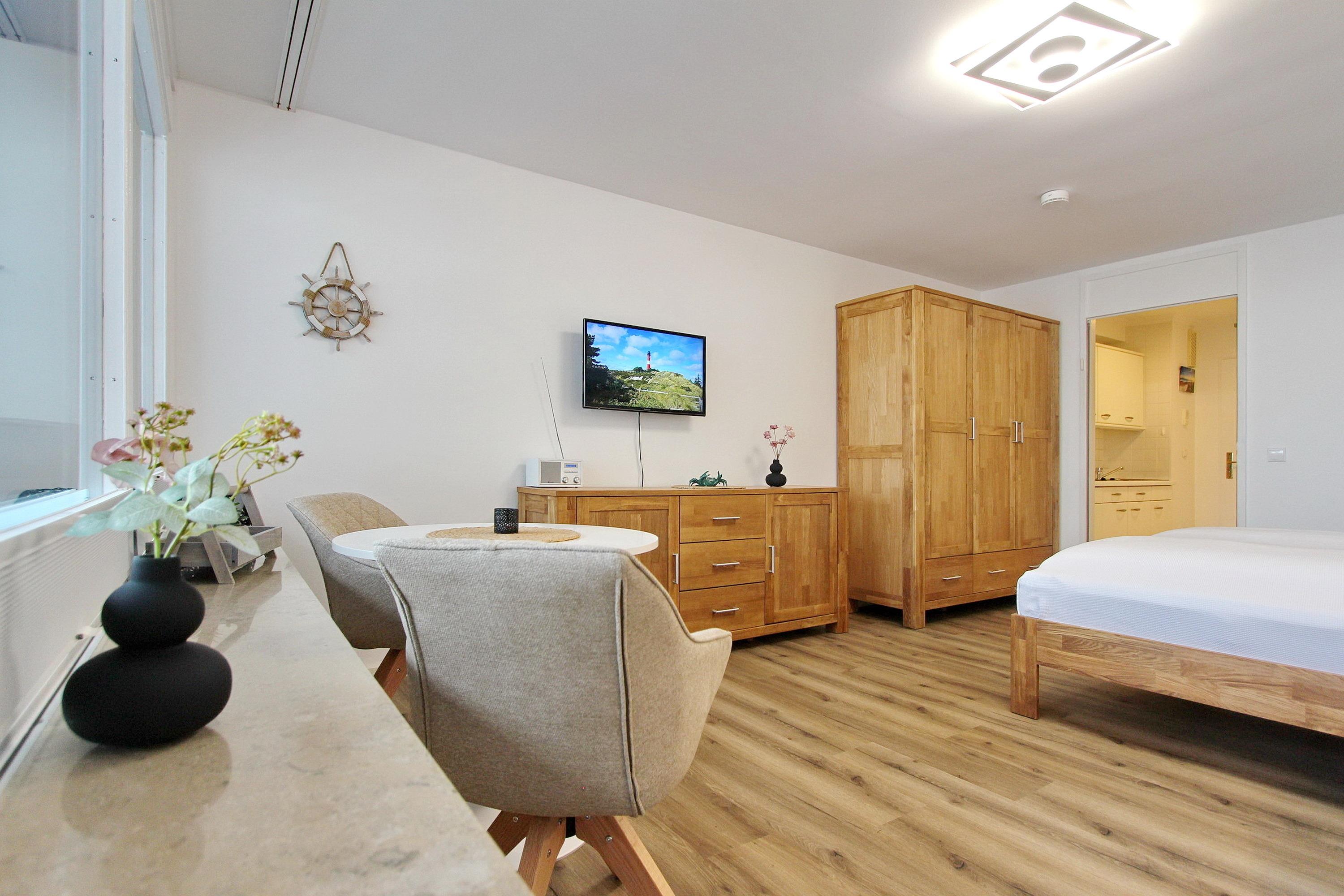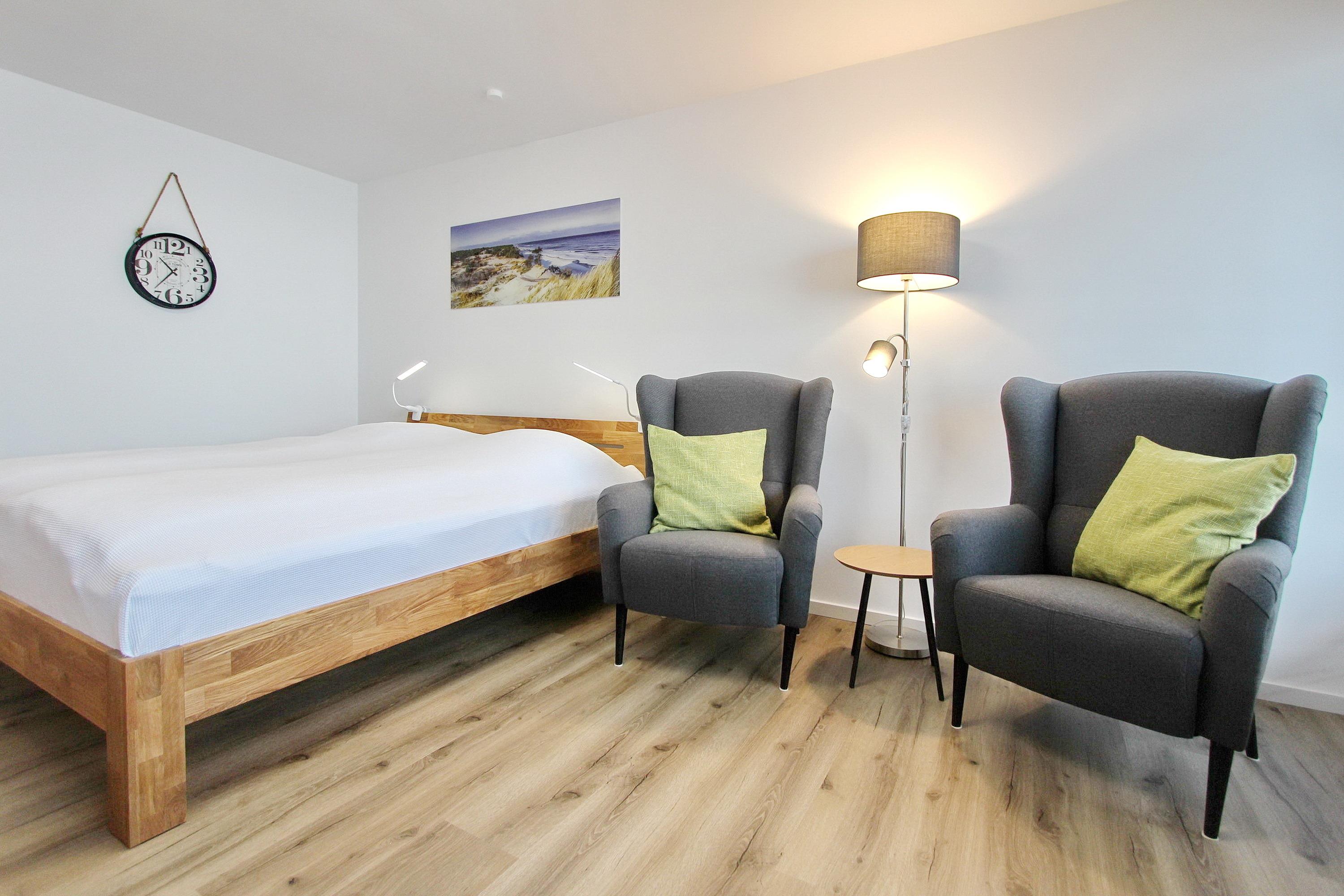 Der Wohn- und Schlafbereich, Ende 2025 aufwendig renoviert, präsentiert sich modern, freundlich und harmonisch abgestimmt: Ein hochwertiges Holzbett, zwei gemütliche Ohrensessel mit farbigen Akzenten ein gemütlicher Essplatz mit zwei komfortablen Polsterstühlen schaffen eine einladende Atmosphäre. Warme Holzelemente, stilvoll ausgewählte Dekoration und ein Designboden in Holzoptik setzen zusätzliche Wohlfühlakzente.