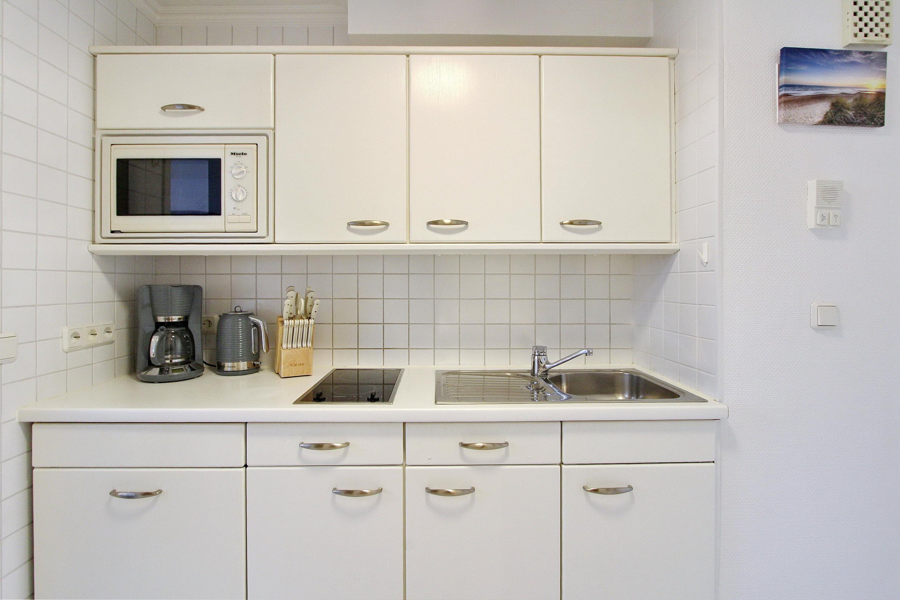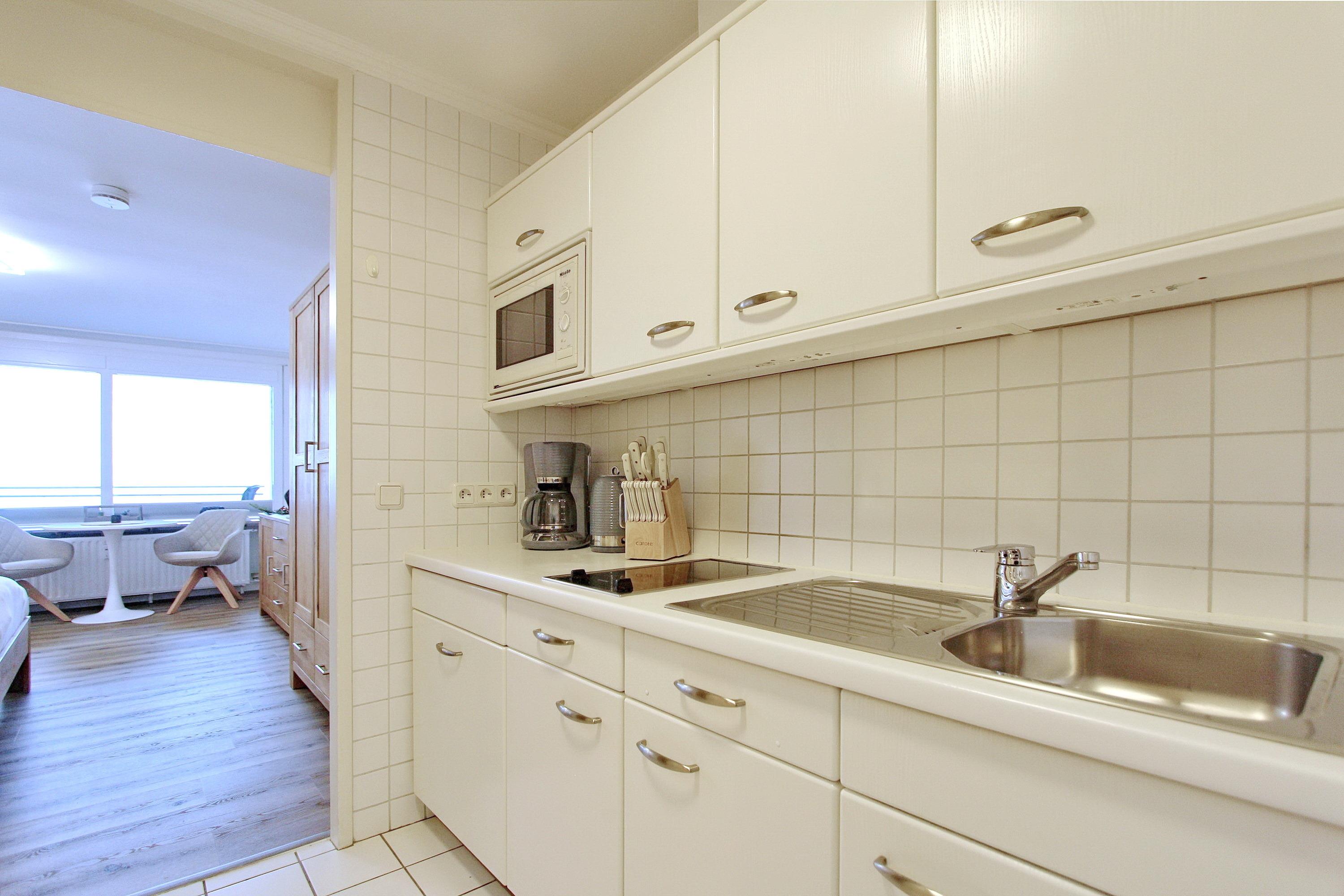 Im Flur befindet sich eine praktische Einbauküche mit Cerankochfeld und Mikrowelle – ideal für die Selbstversorgung. Das zeitlose Badezimmer ist mit Dusche und Handtuchtrockner ausgestattet.