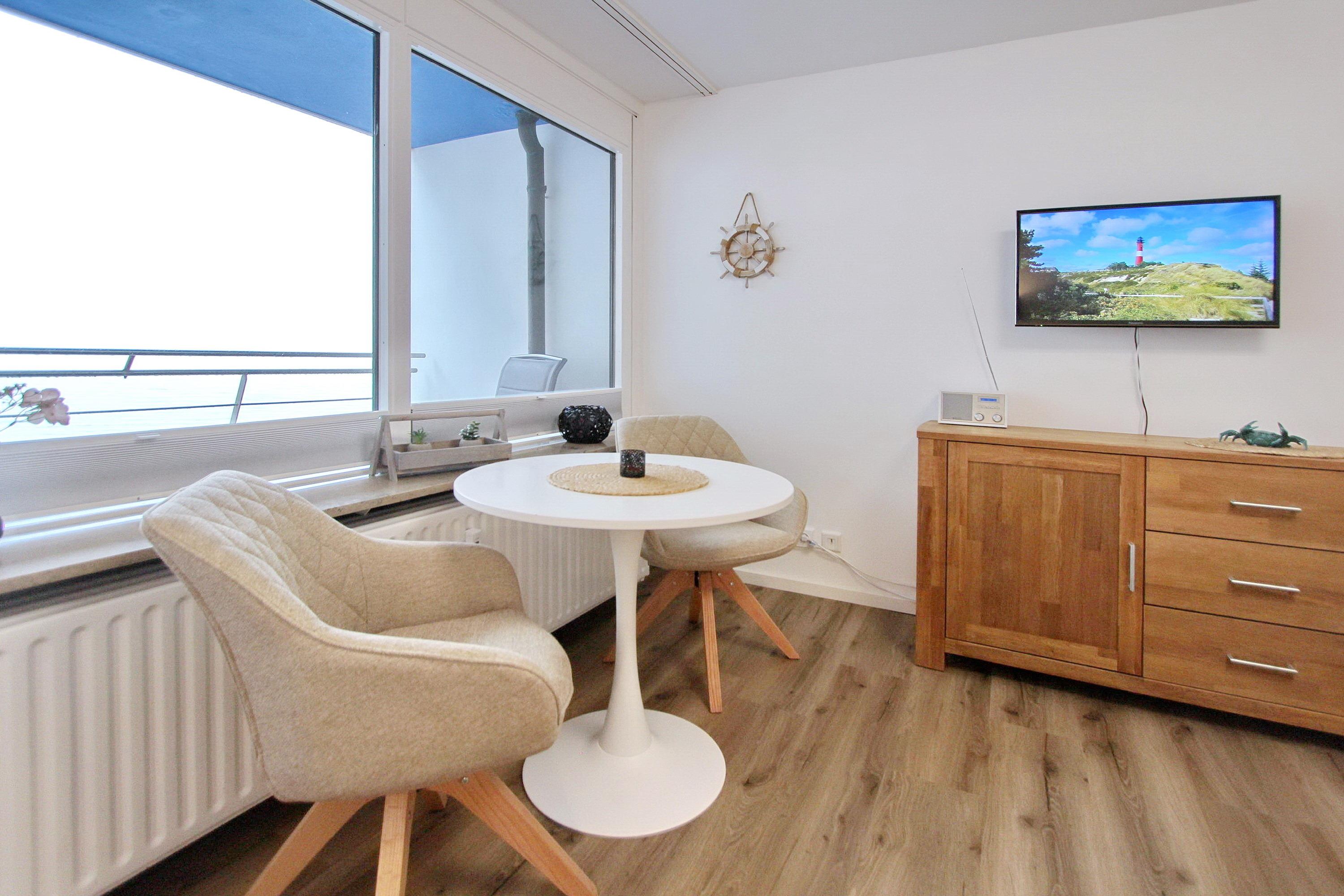 Zur technischen Ausstattung gehören ein Smart-TV, ein Radio mit CD-Player sowie kostenfreies WLAN (Netzwerk: „WEG Haus Sylter Welle“ – passwortfrei, ohne Gewähr).
