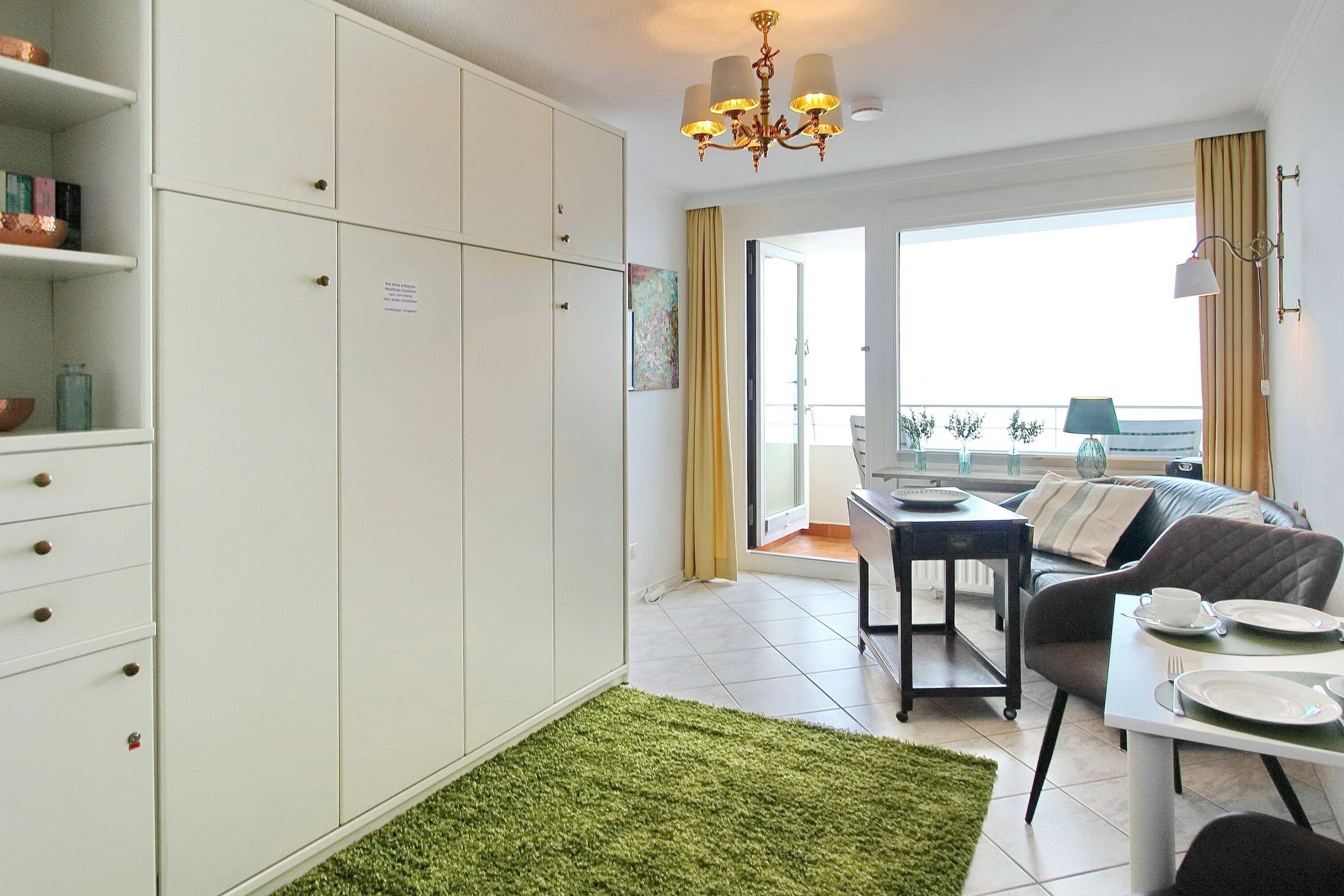 Gemütliche Einzimmerwohnung mit herrlichem Ausblick über den Strand und das Meer im Haus Metropol in der 5. Etage. Der kombinierte Wohn-/Schlafraum mit vorgelagertem Westbalkon (Balkonmöbel inkl.) verfügt über ein Doppelschrankbett, eine Ledercouch und einen Esstisch mit 2 Stühlen. Im Badezimmer gibt es eine Dusche (Fön ist ebenfalls vorhanden) und in der Küchenzeile im Flur mit Ceranfeld und zusätzlicher Nespressomaschine können sie sich selbst verpflegen. Zur technischen Ausstattung dieser Wohnung gehört: ein Smartfernseher von Panasonic und ein Bluetoothdockingstation mit Handyladestation. Ein freies WLAN Netzwerk (WEG Haus Metropol - Passwortfrei - ohne Gewähr) steht Ihnen kostenfrei zur Verfügung. Diese Nichtraucherwohnung hat eine Größe von ca. 25 m².