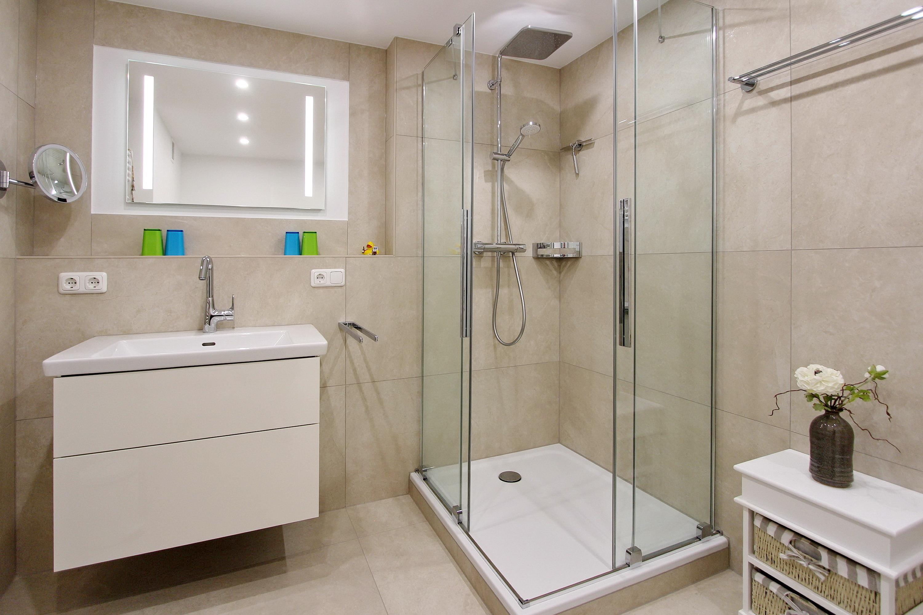 Der Wohnraum verfügt über eine große Couch mit Schlaffunktion, zwei Fernsehsessel, zwei Couchtische, ein Sideboard, einen Sekretär sowie ein großes Smart-TV, auf dem Sie Streamingdienste, wie z.B. Netflix, nutzen können. Der Essplatz mit vier Esszimmersesseln befindet sich zwischen der Durchreiche zur Küche und dem Südbalkon. Das separate Schlafzimmer, ebenfalls mit Zugang zum Ostbalkon ist mit einem feststehenden Doppelbett, einem Schrank mit reichlich Stauraum und einem Flachbild-TV ausgestattet. Das neu renovierte und helle Badezimmer, das sowohl vom Schlafzimmer als auch vom Flur aus begehbar ist, verfügt über eine großzügige Dusche mit flachem Einstieg, einen Duschhocker, reichlich Gelegenheit zum Handtuchtrocknen, einen Föhn, einen großen beleuchteten Spiegel sowie einen beleuchteten Kosmetikspiegel. In der voll ausgestatteten Küche mit Geschirrspüler, Mikrowelle und einem Herd mit 4 Cerankochplatten lassen sich bequem Mahlzeiten zubereiten, die sich direkt durch die Durchreiche zum Essplatz servieren lassen. Zur weiteren technischen Ausstattung der Wohnung gehören ein Radio, ein freies WLAN-Netzwerk (WEG Haus Metropol) sowie das private, kostenfreie WLAN des Vermieters.